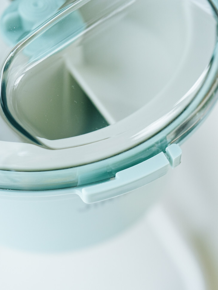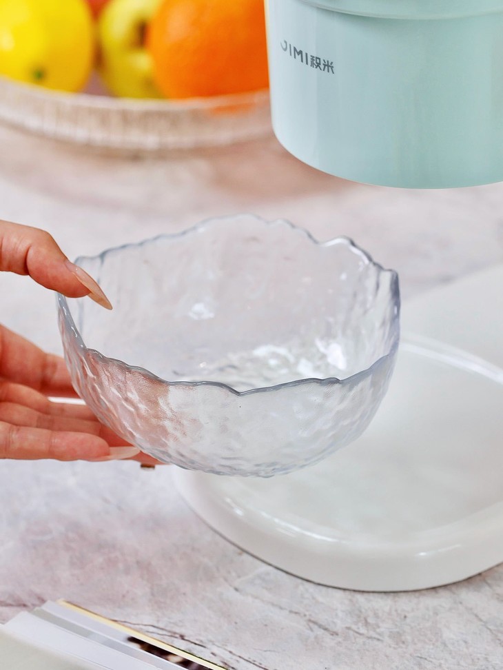 【温馨提示】: 积米这款刨冰机开机是无按键启动,需要在面盖旋钮卡好即可自动工作 , 在碎冰工作期间声音较大属于正常现象, 主要与电机齿轮与刀片转速切割冰块所产生的,同时我们使用时建议: ①、将冰块稍软化或切小块 ②、避免过量填装 ③、在机器底部垫硅胶垫或毛巾减震 ④、避免在镂空桌面上操作