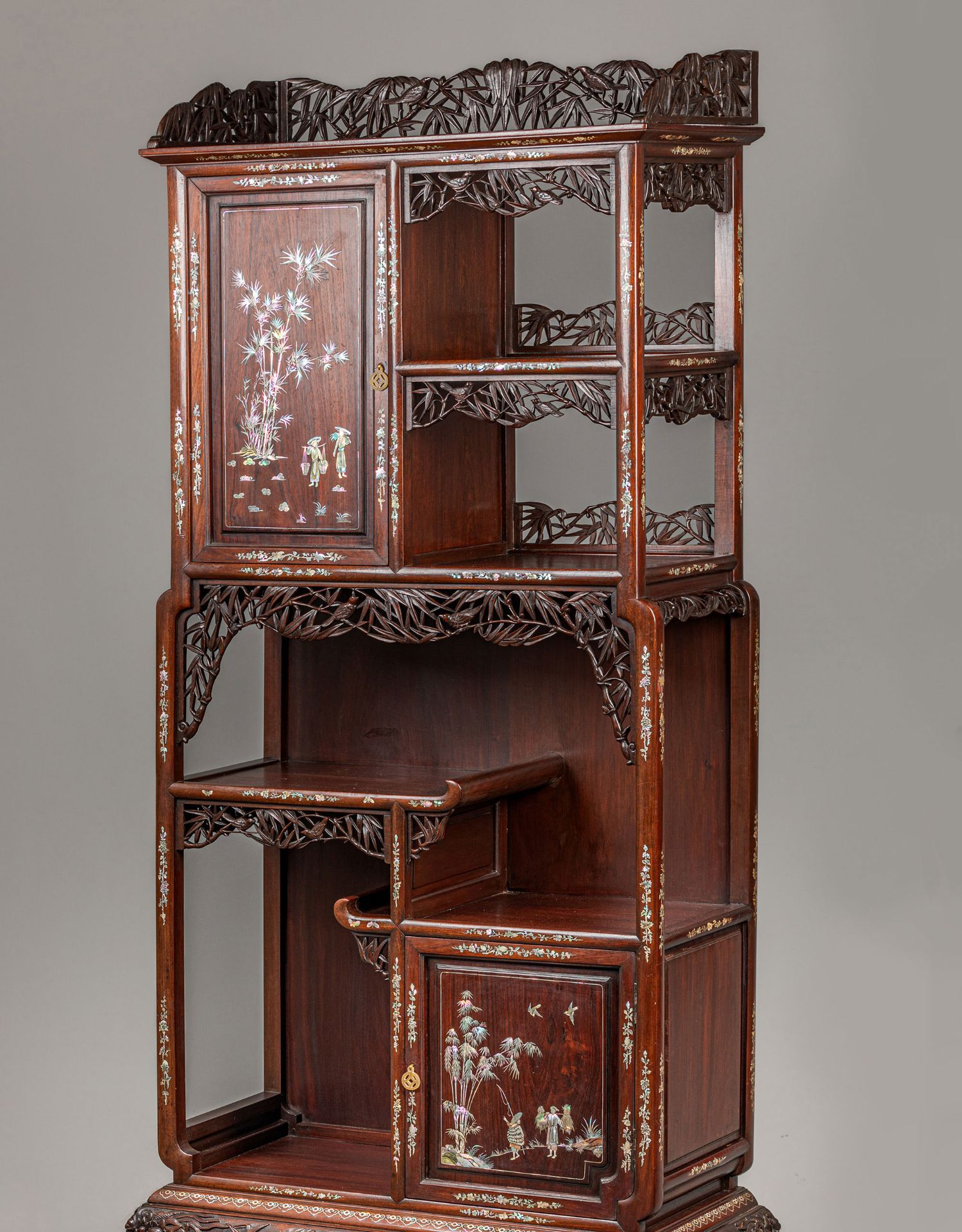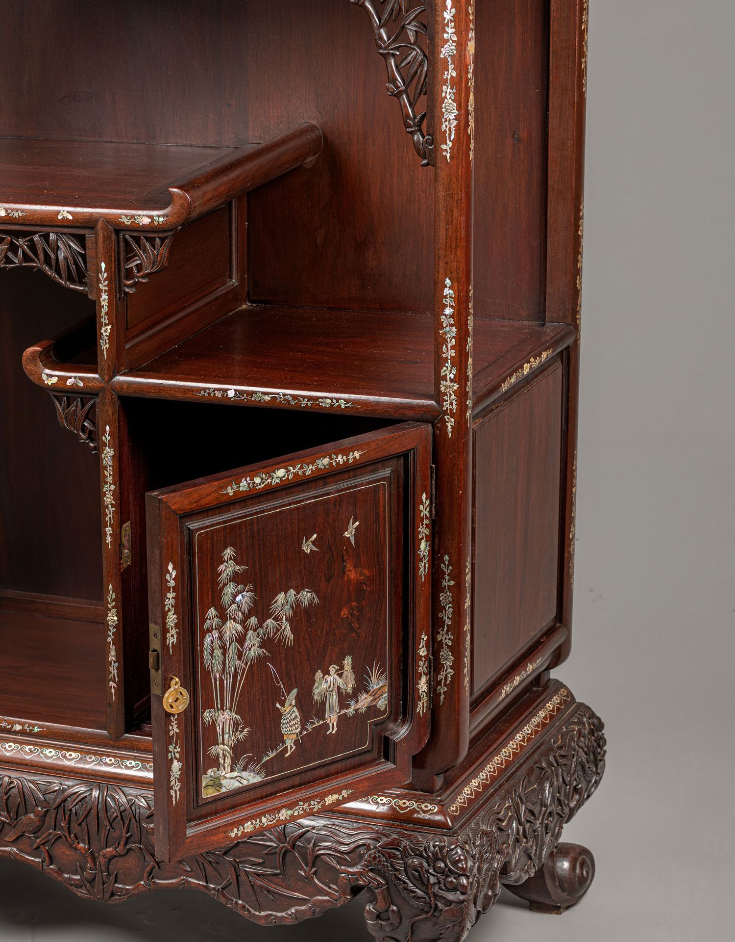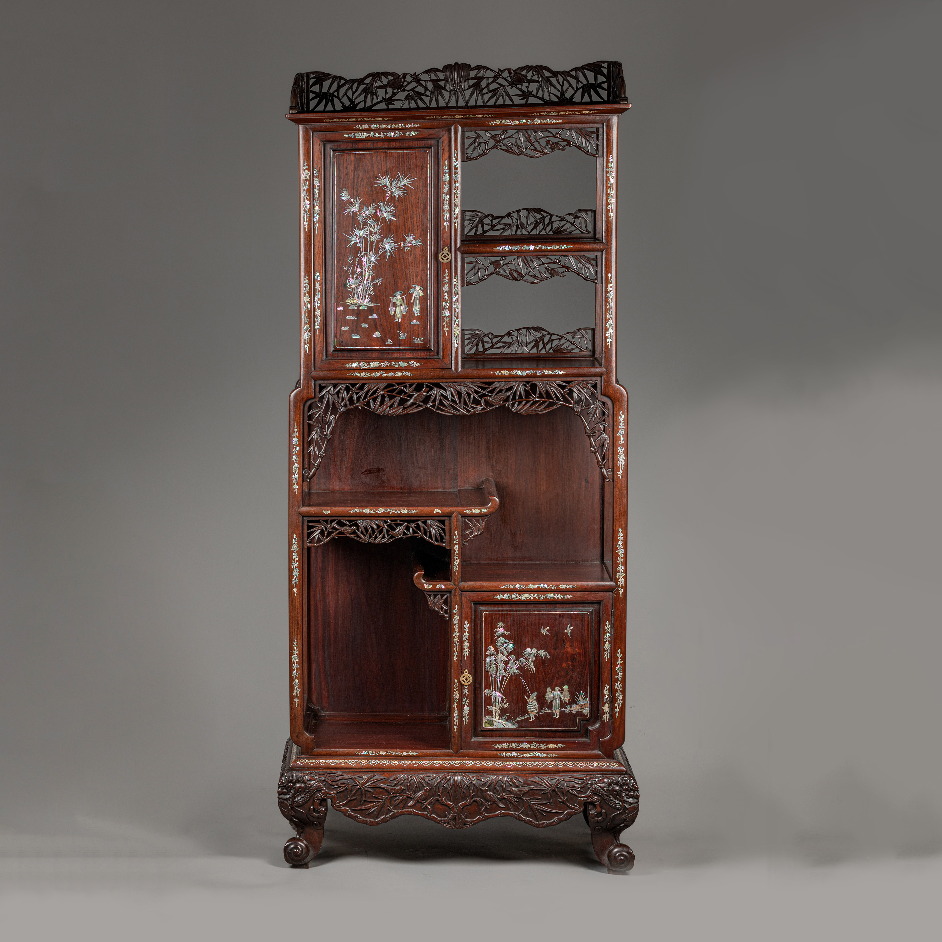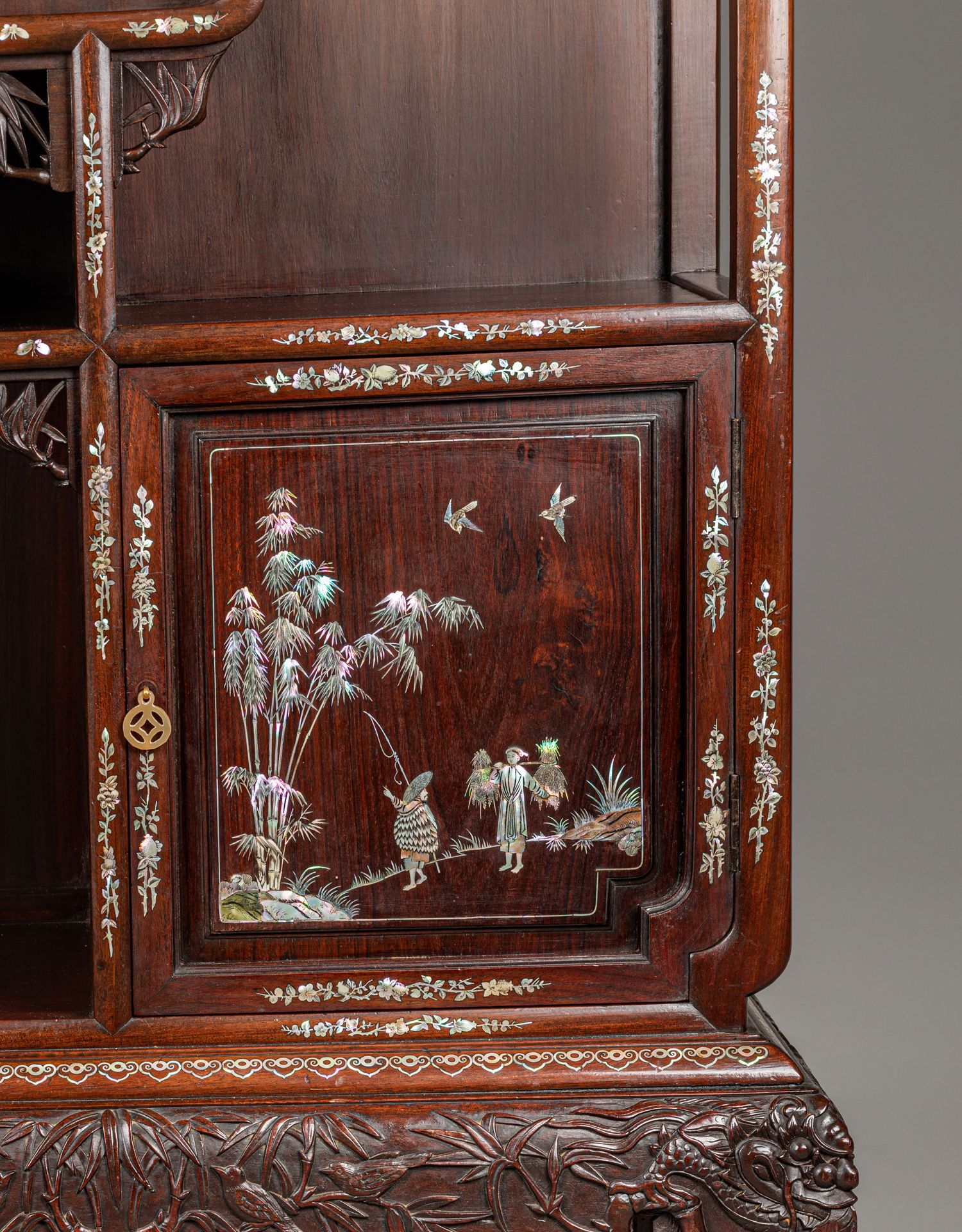 独角鹿西洋古董家具东方竹韵风景人物螺钿镶嵌镂雕漆木多宝阁