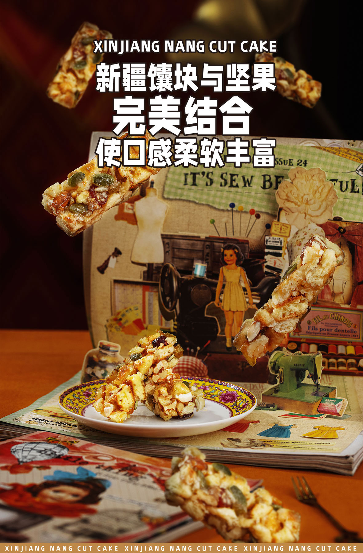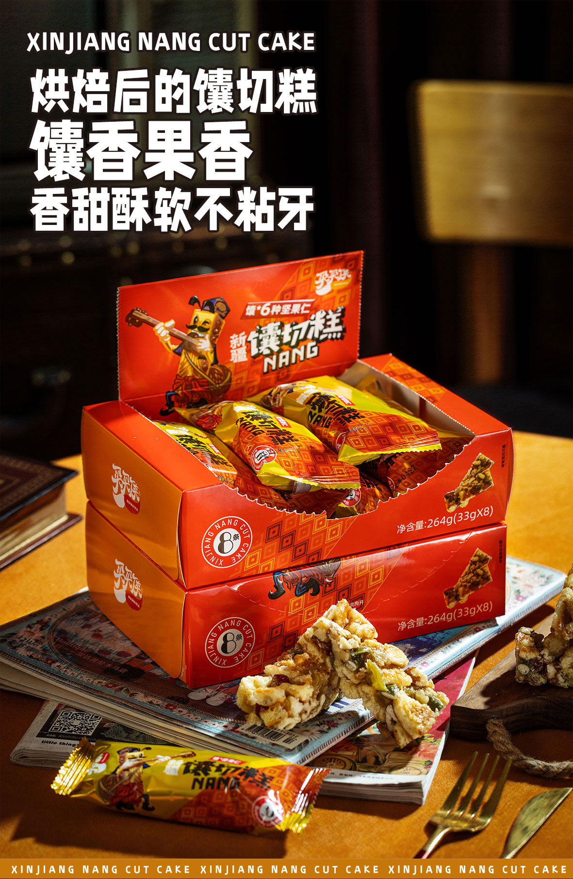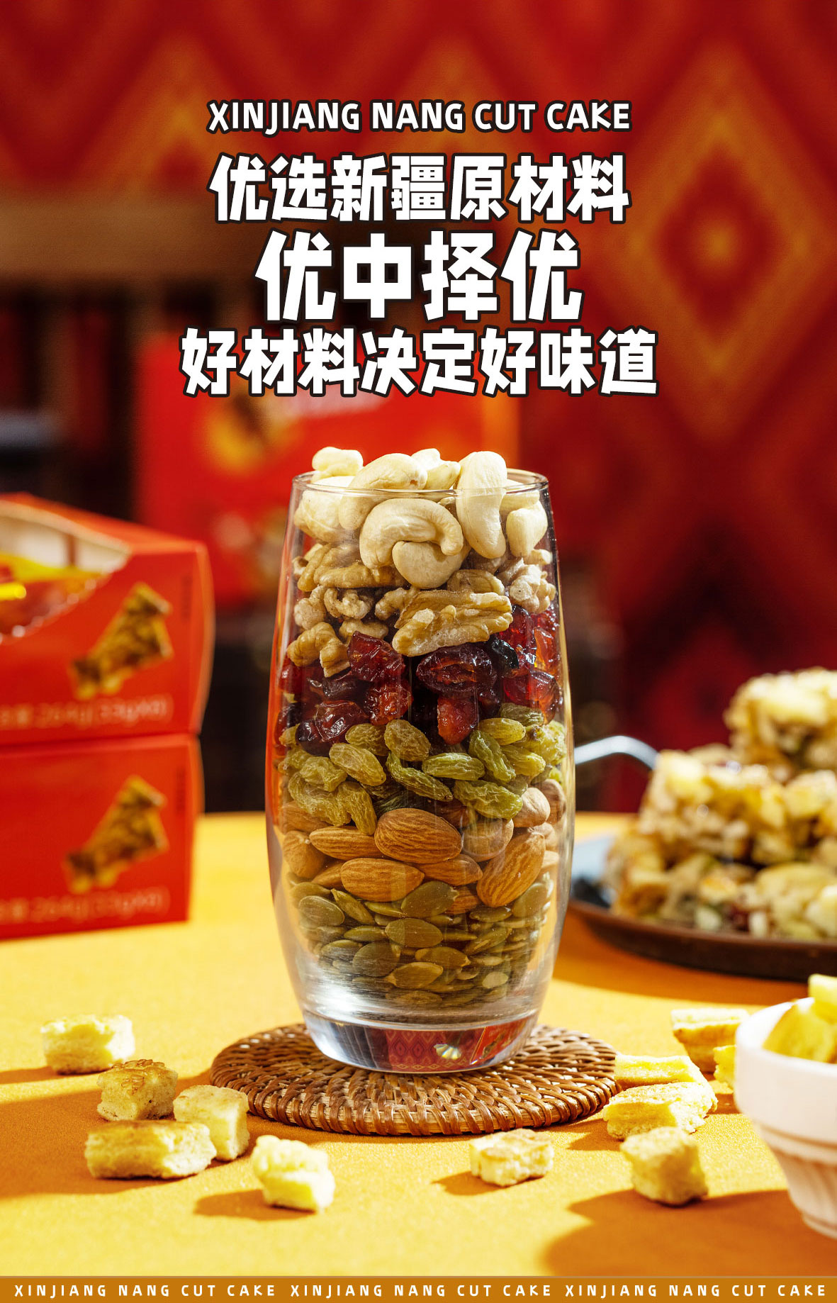 【配 料】:馕块(面粉、鸡蛋、牛奶、白砂糖、芝麻、酵母)核桃仁、扁桃仁、腰果仁、南瓜籽仁、葡萄干、蔓越莓干、麦芽糖、木糖醇、食用植物油、食用盐
