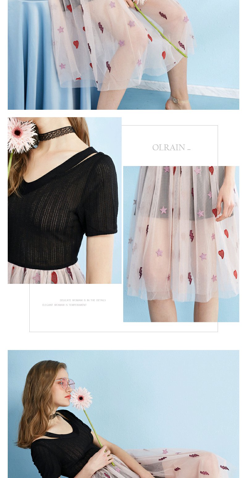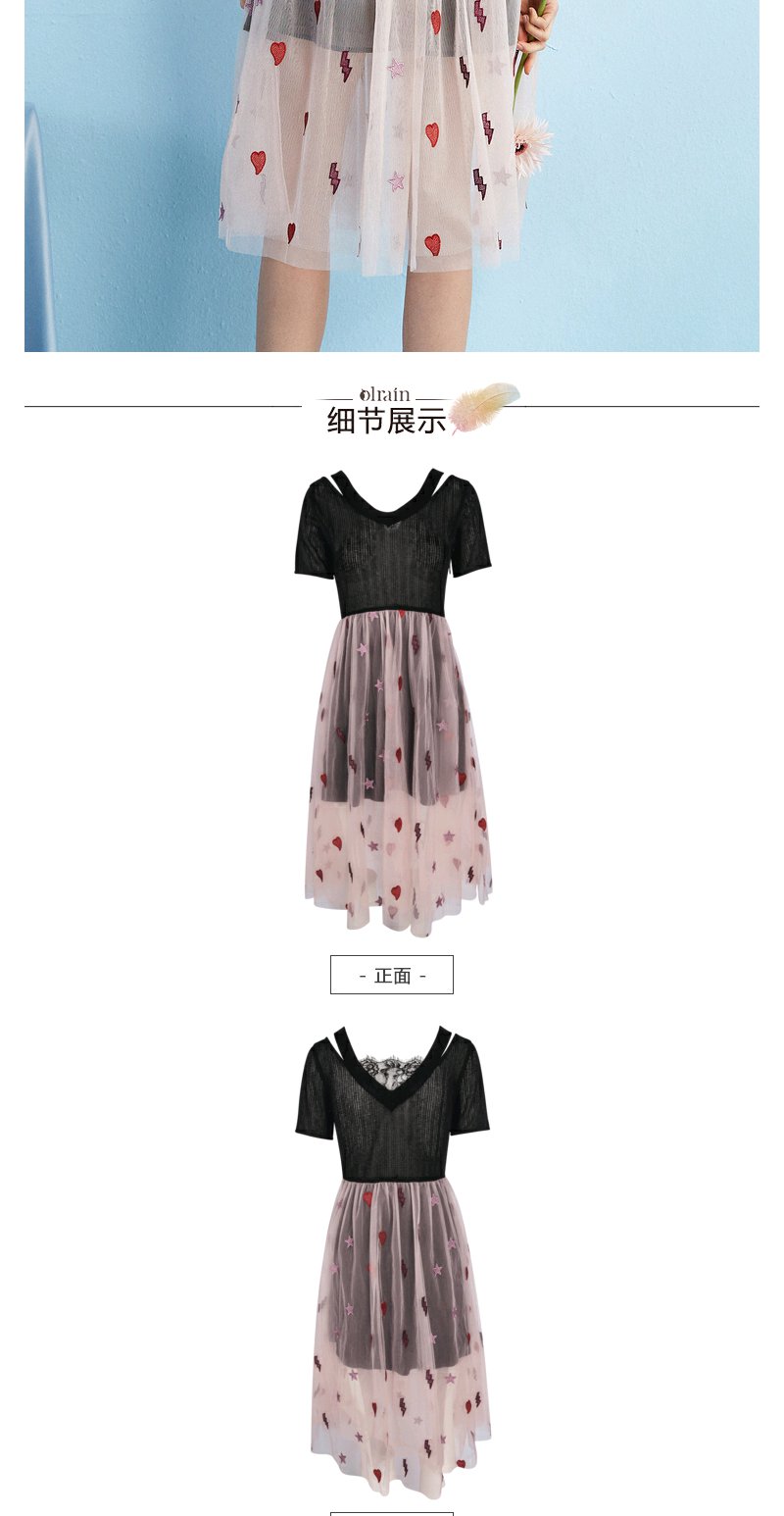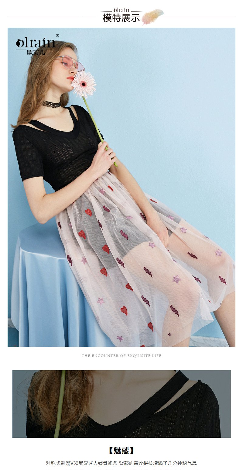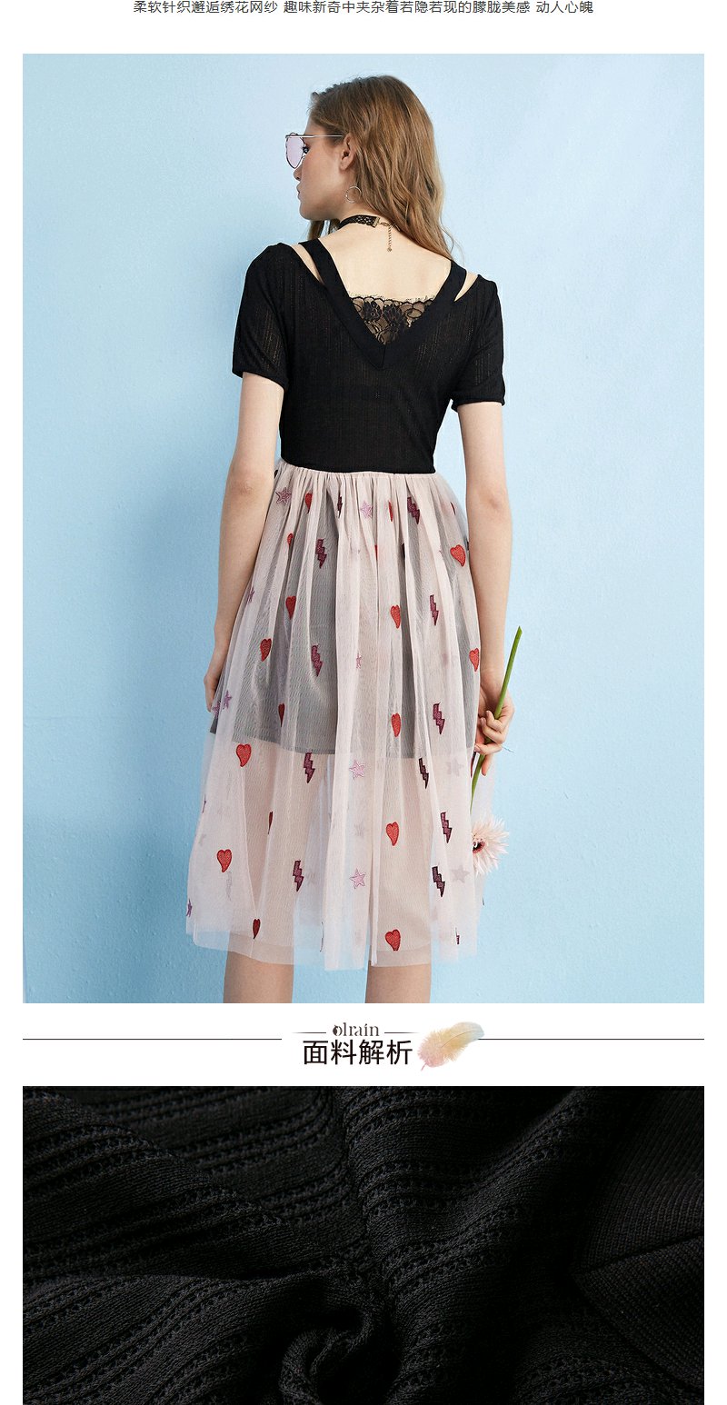 欧芮儿 夏装新款蕾丝拼接V领网纱绣花针织连衣裙女中长款裙子