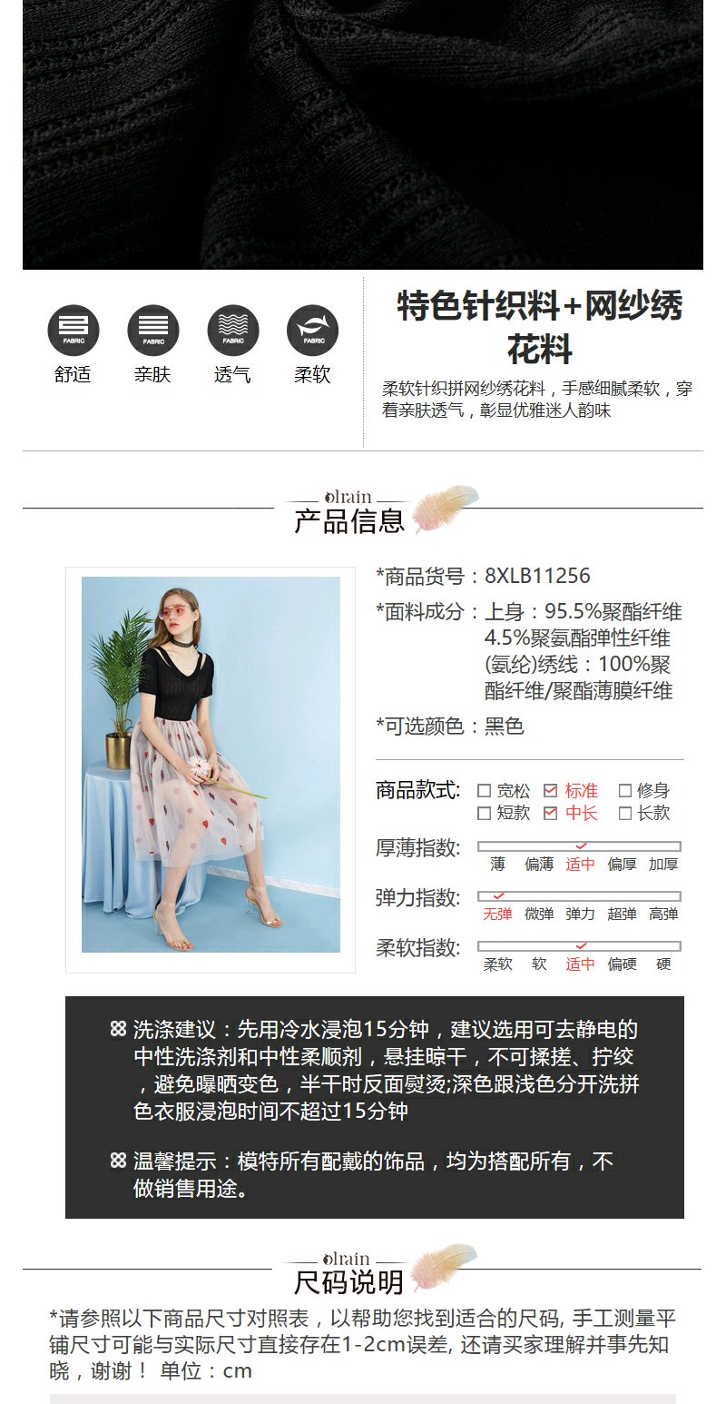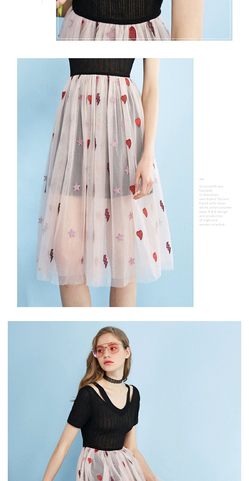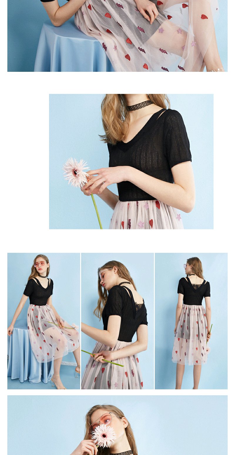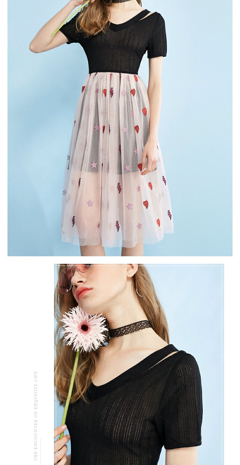 欧芮儿 夏装新款蕾丝拼接V领网纱绣花针织连衣裙女中长款裙子