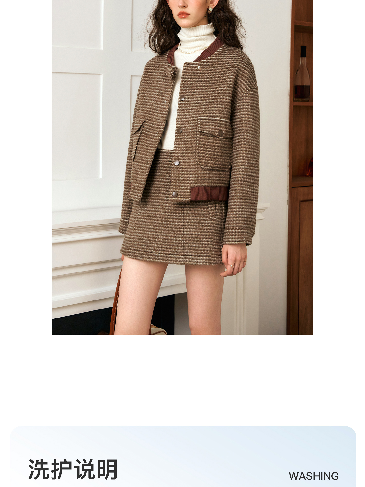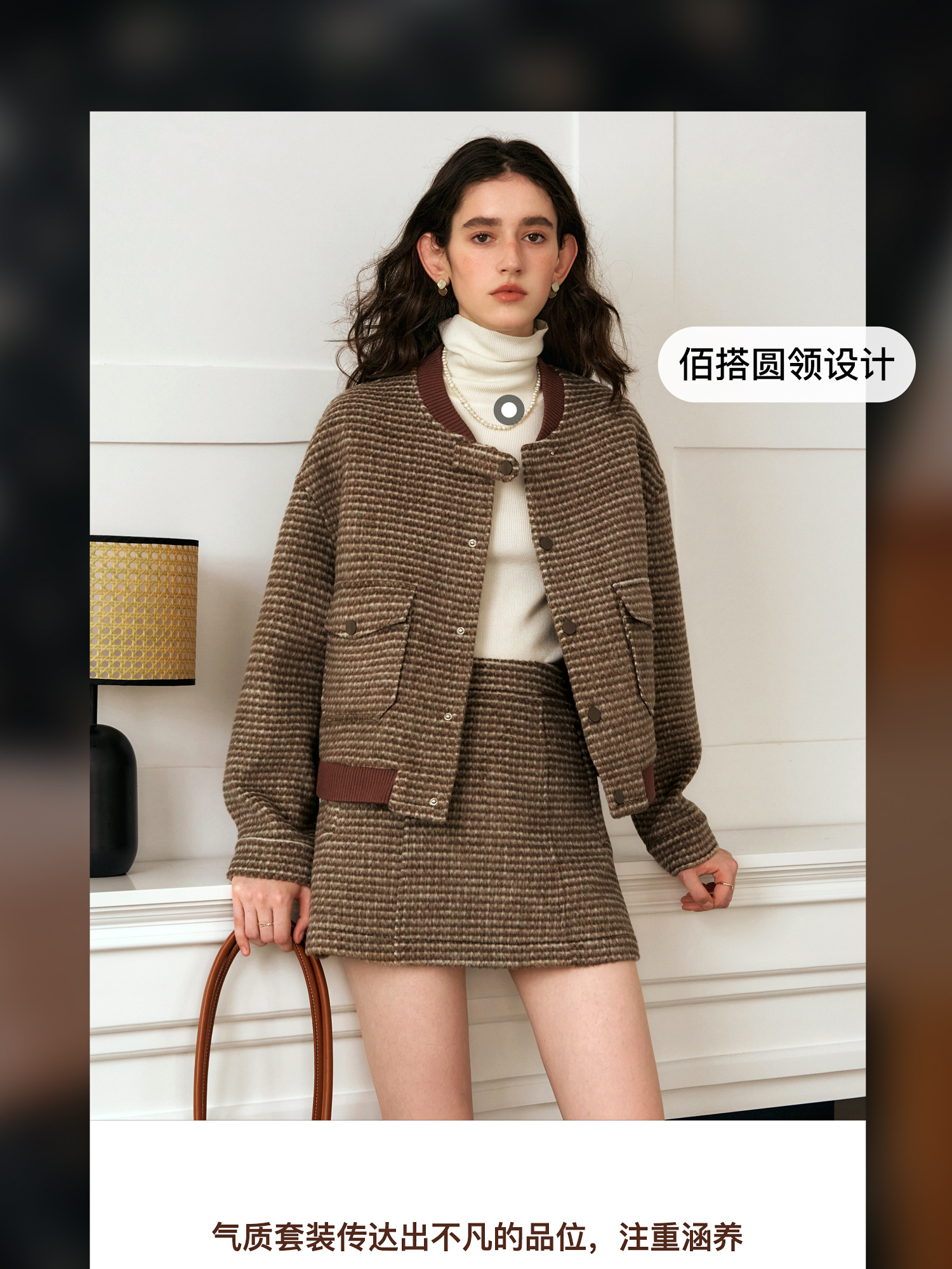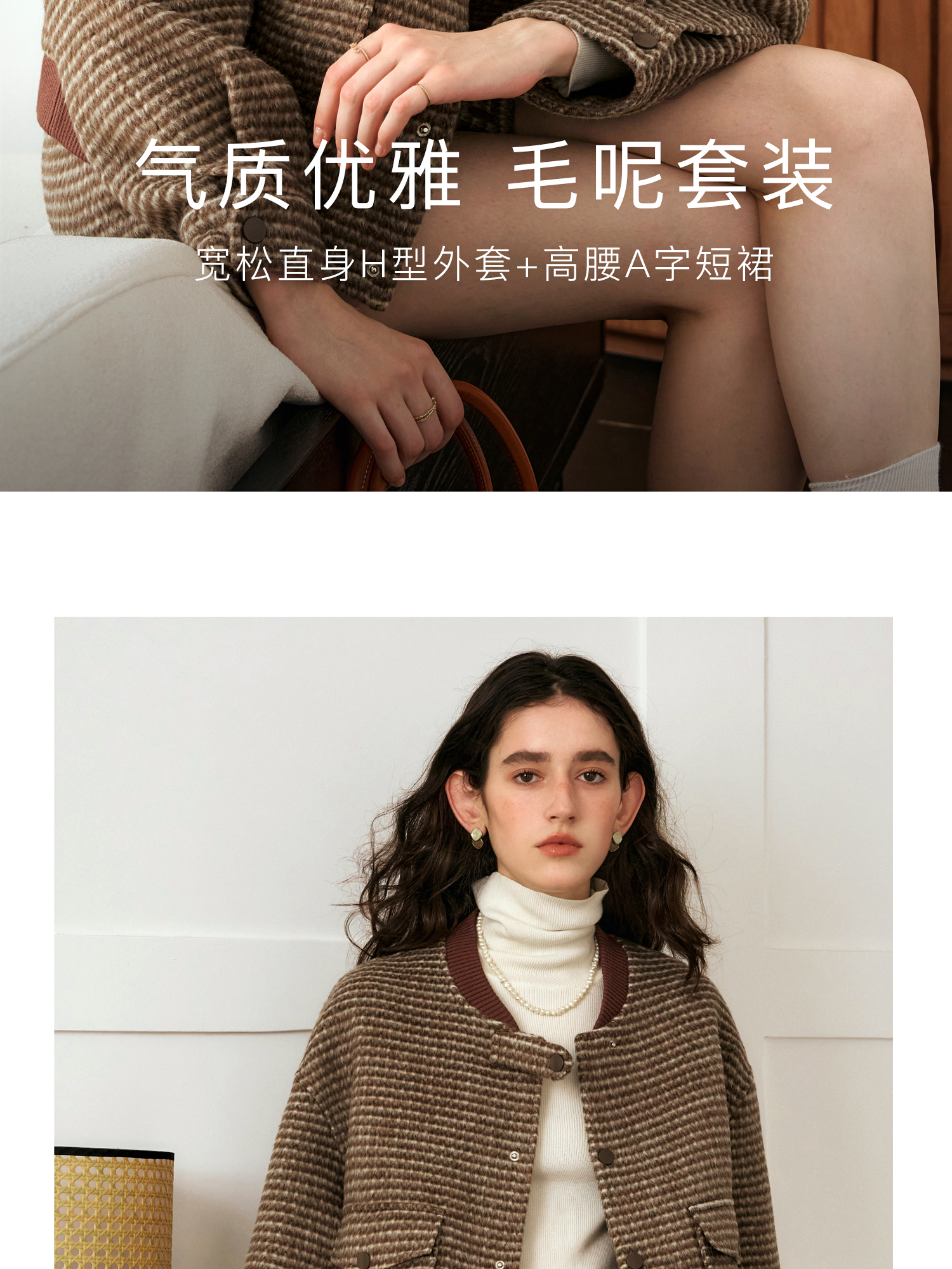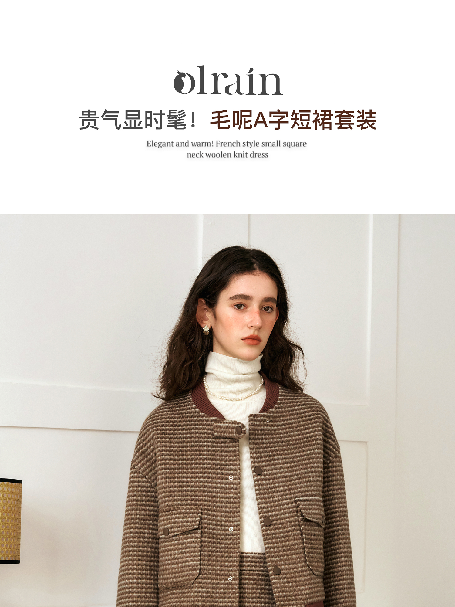 OLrain欧芮儿棕色时尚套装女冬季2024年新款毛呢A字短裙两件套