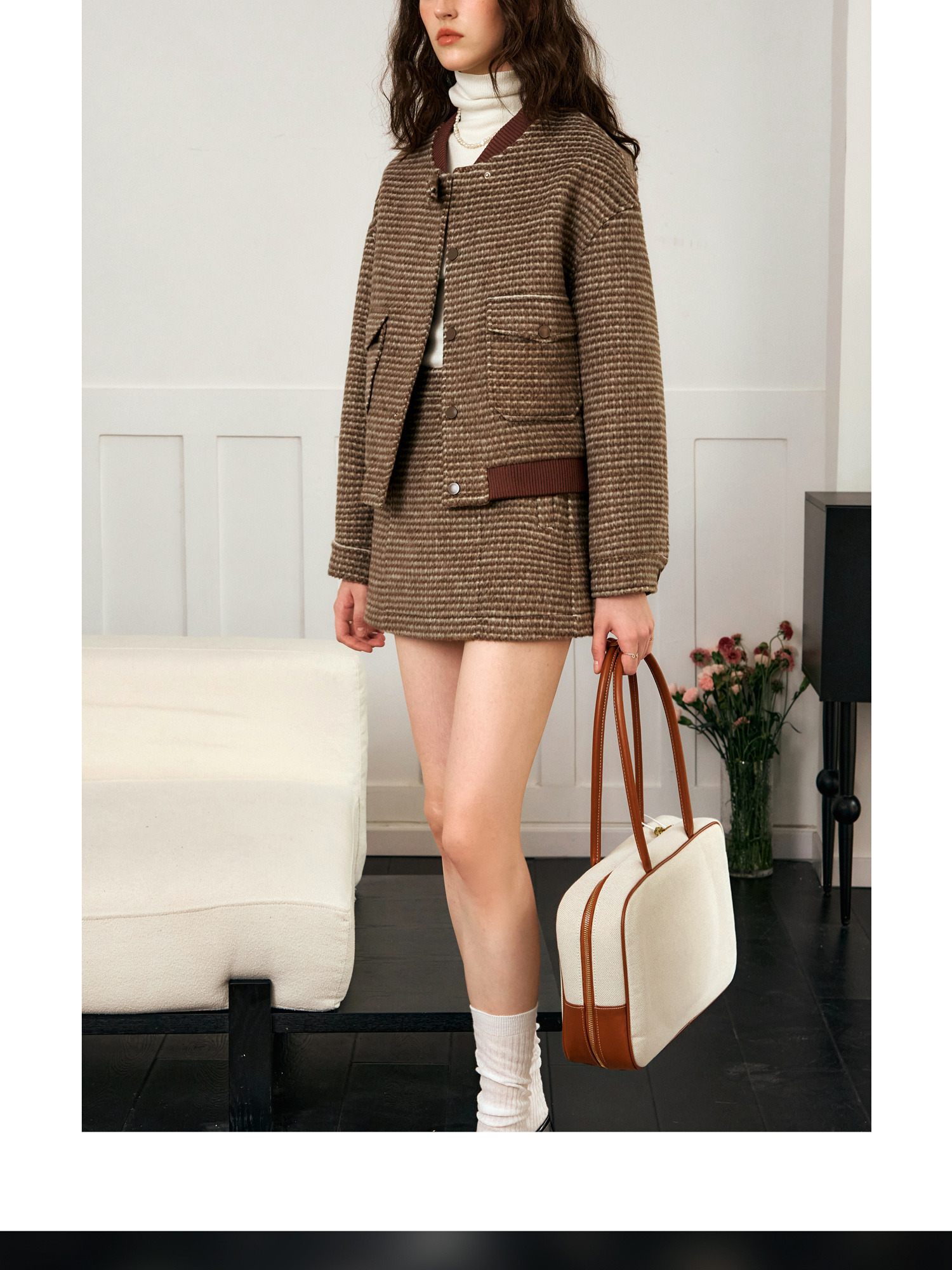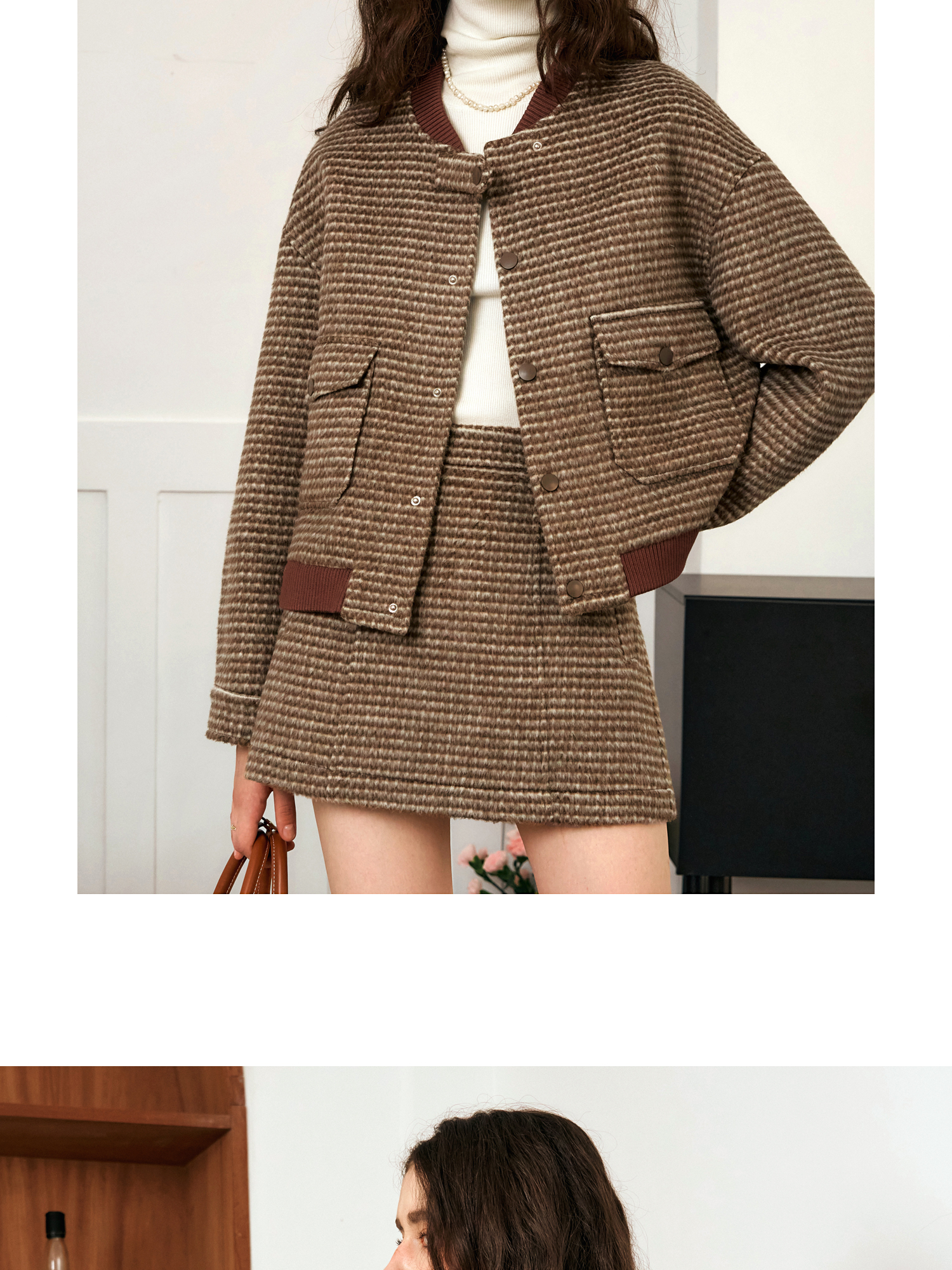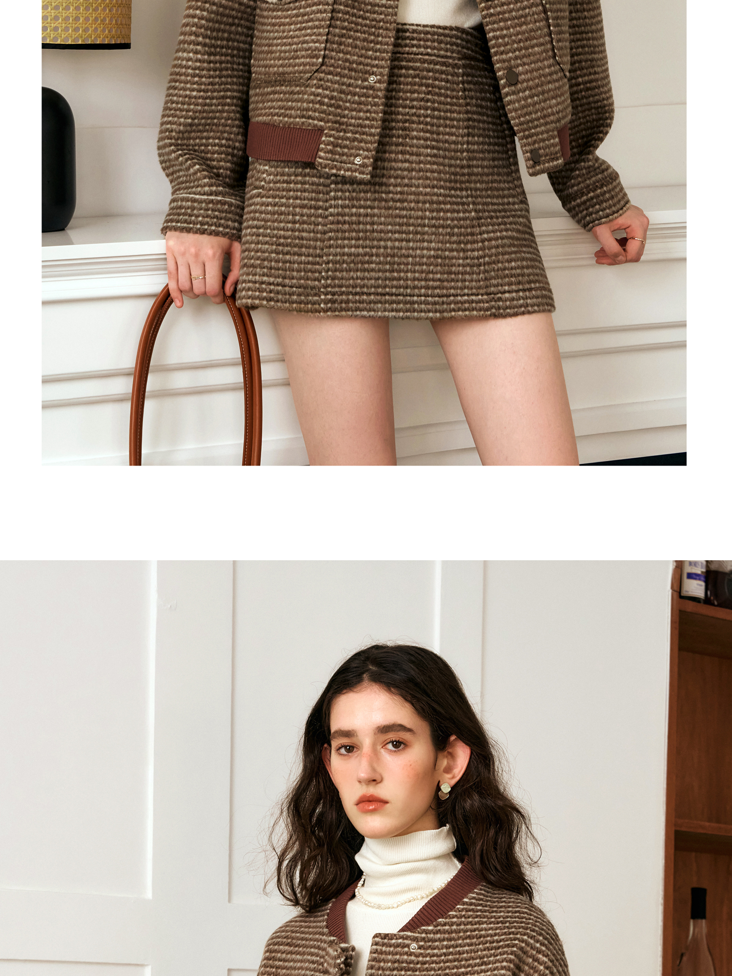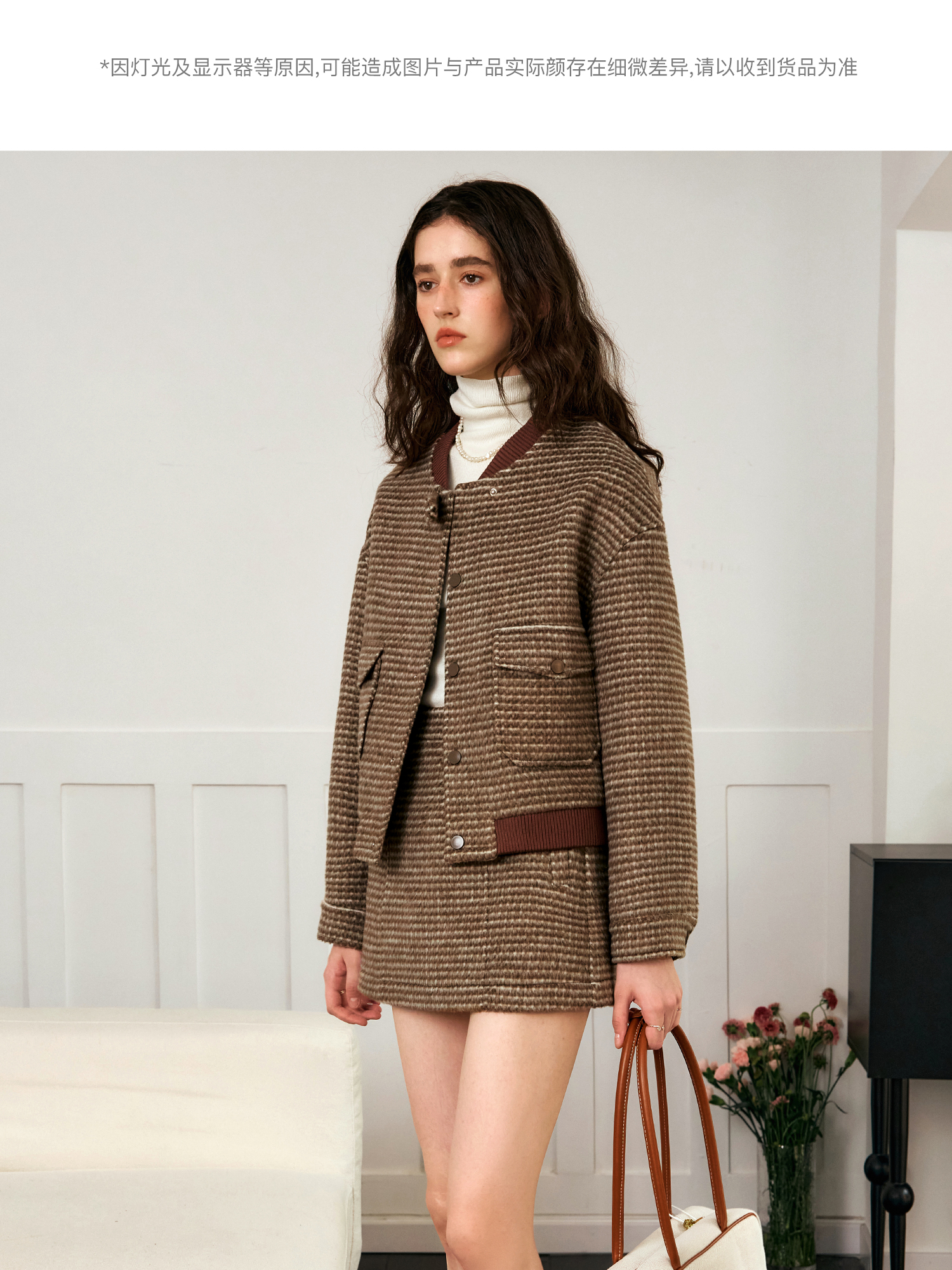 OLrain欧芮儿棕色时尚套装女冬季2024年新款毛呢A字短裙两件套