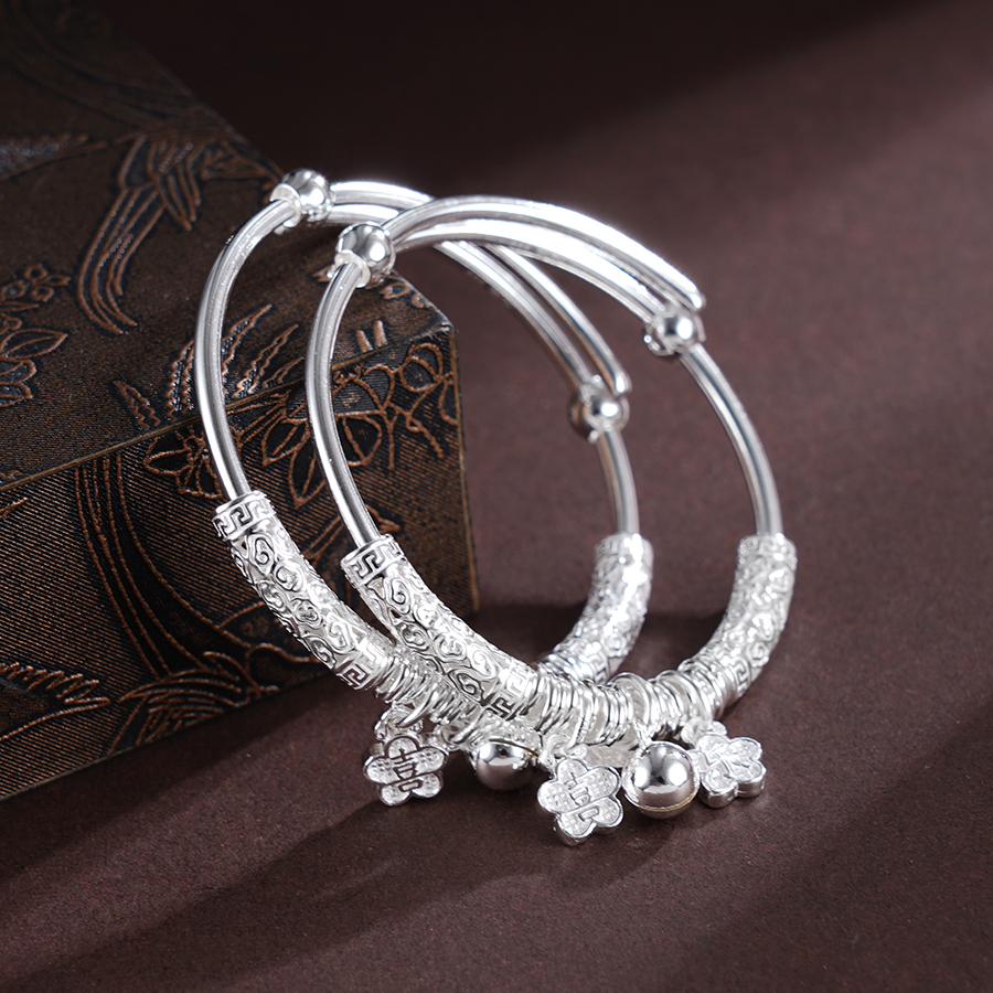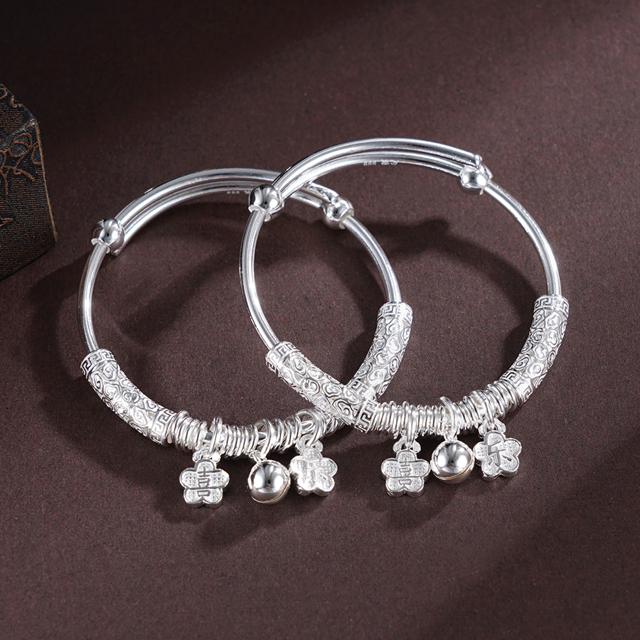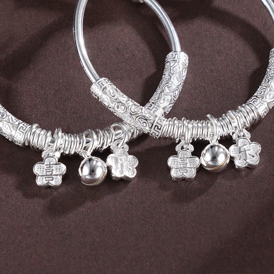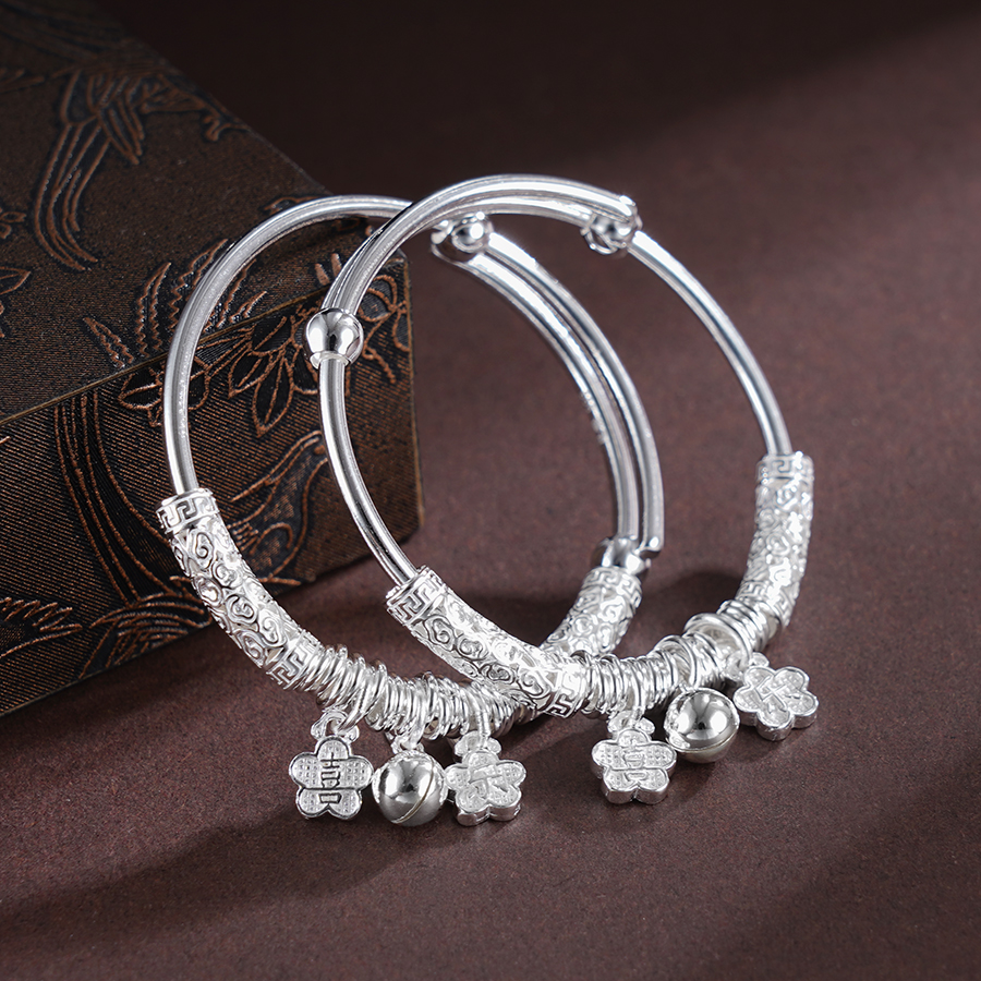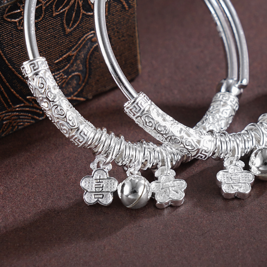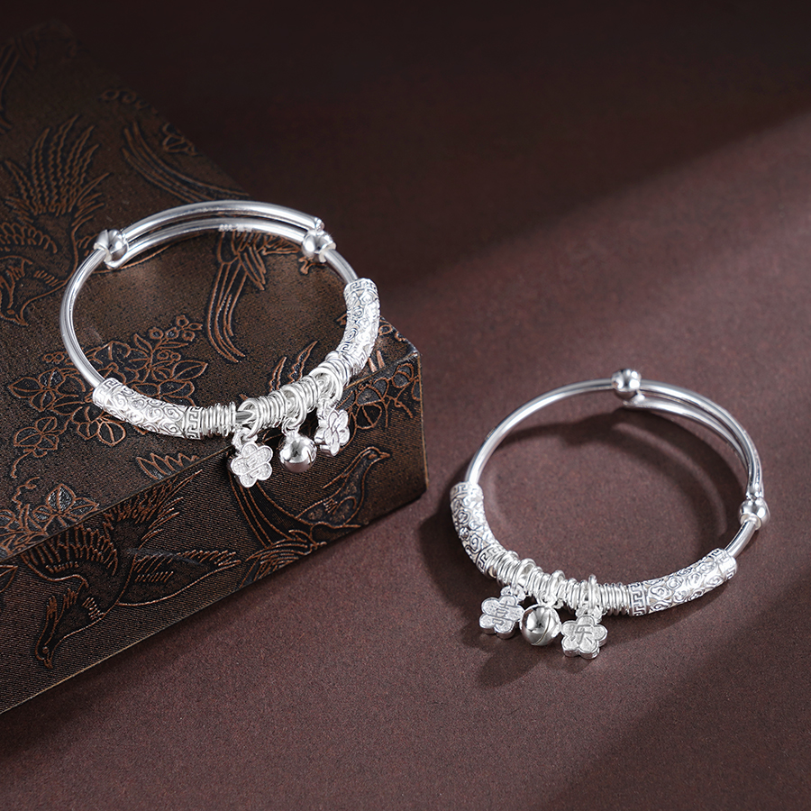 【寓意】:纯银盘缠童镯,美观且富有深意。融合了花朵与铃铛小坠饰,设计精美,质感十足。宝宝佩戴,象征繁花见喜,幸福美满。