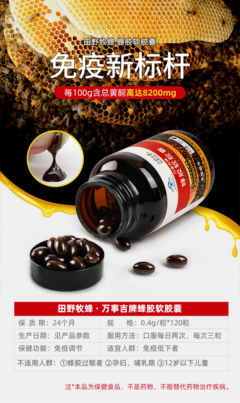 田野牧蜂蜂胶软胶囊高浓度胶原免疫力调节120粒/瓶