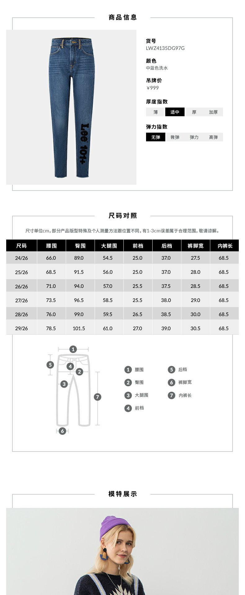 【尺码24-25】Lee商场同款2020年秋季款女士舒适小直脚牛仔裤LWZ4135DG97G