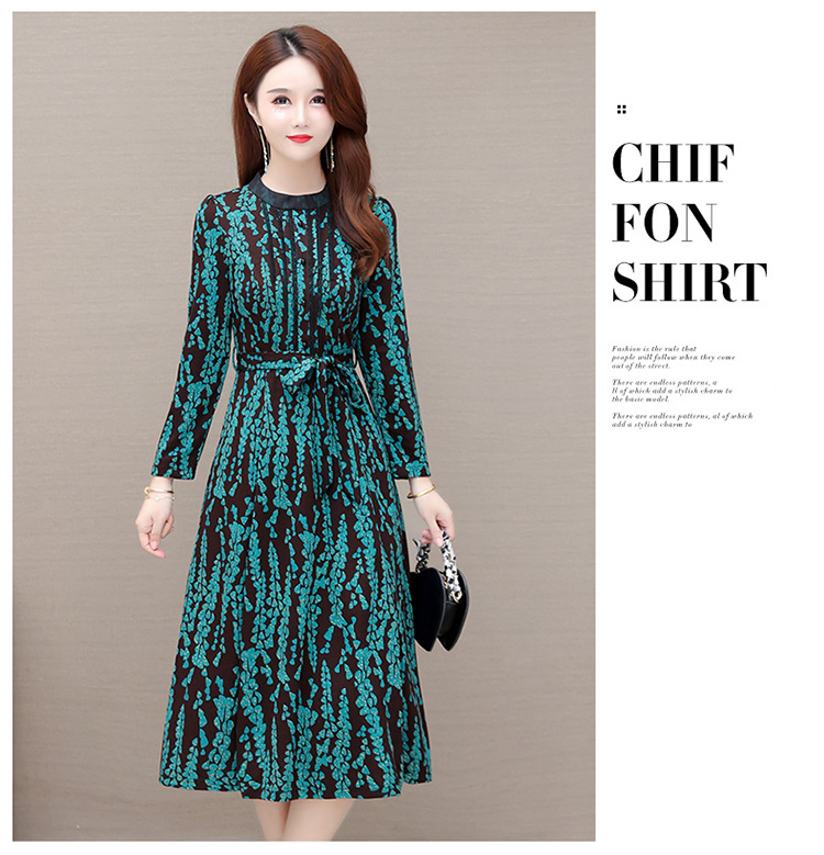 春秋新款,长袖圆领中长款腰带碎花A字裙花色连衣裙QYM-JJ-928713-Y