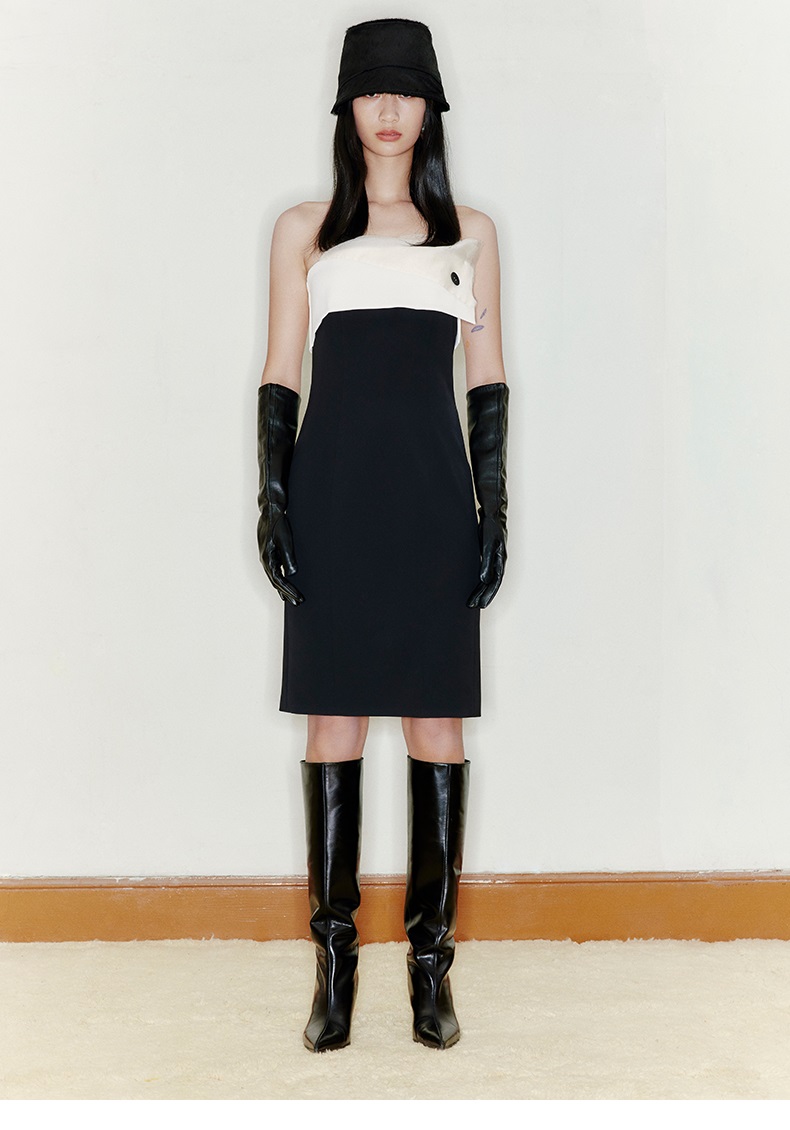 【微风】胸前多层拼纱设计纽扣抹胸修身连衣裙、22000041