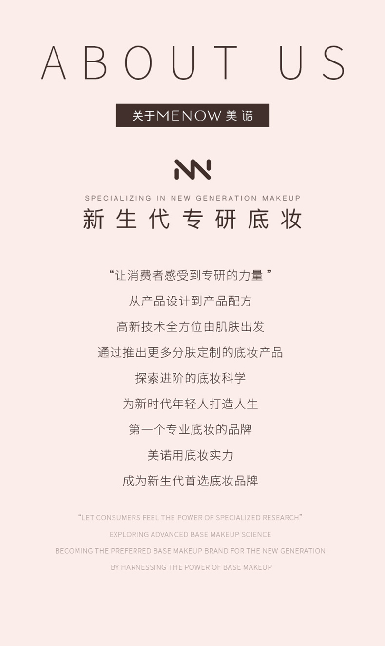 - 全球性彩妆品牌,专注开发高品质的适用性美妆产品。拥有20多年美妆经验,产品远销欧美等80多个国家。美诺彩妆致力于给用户带来“爱与美,年轻,不一样的品质彩妆体验”。