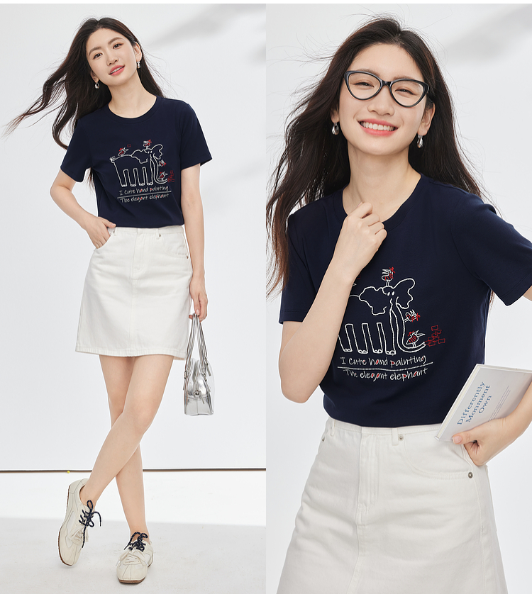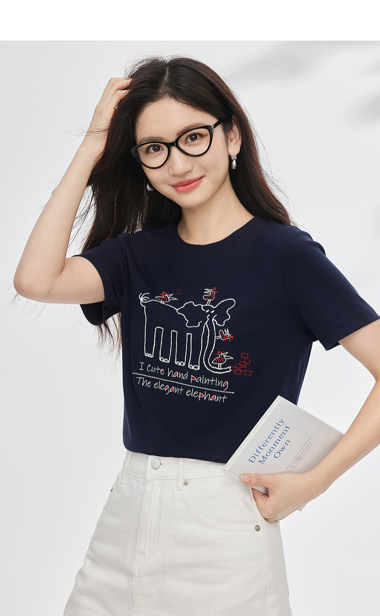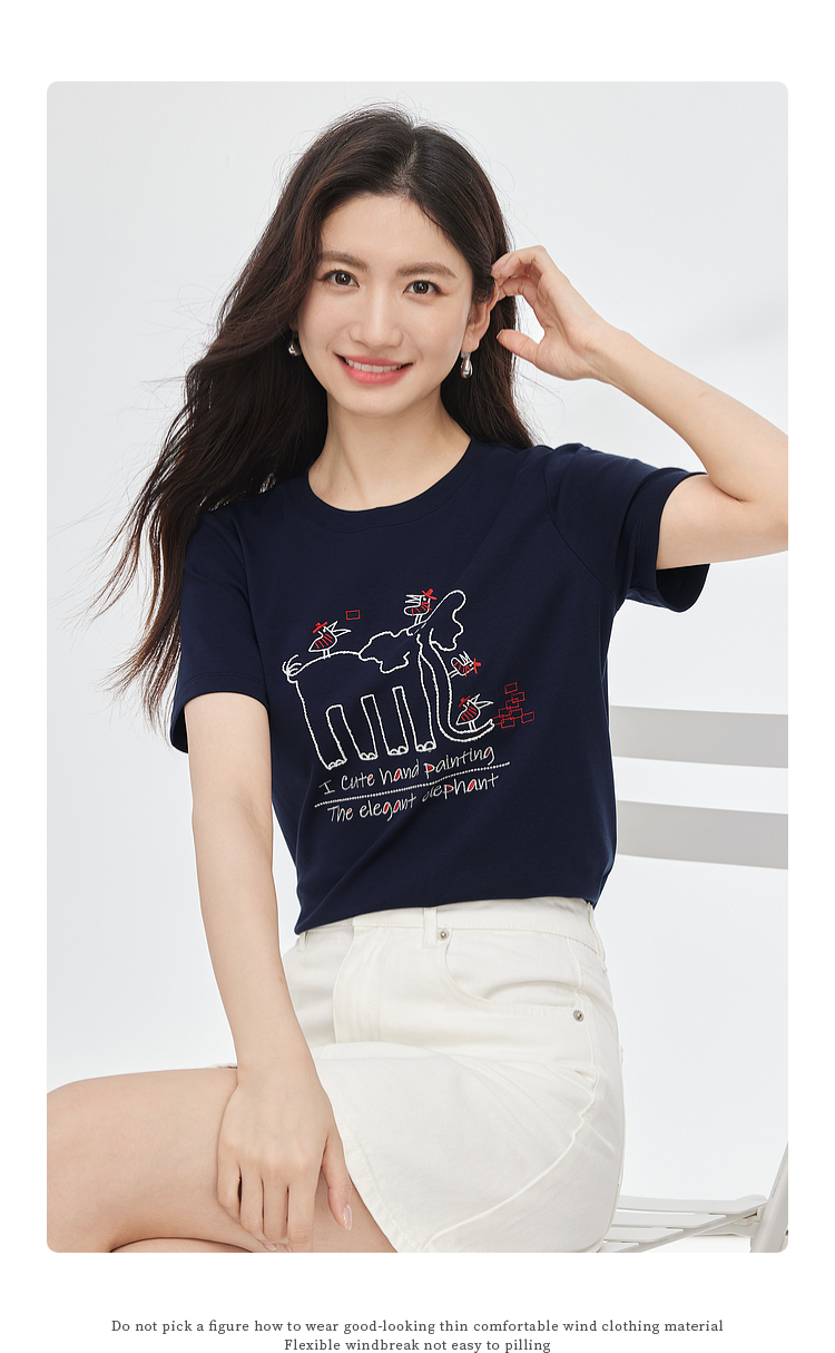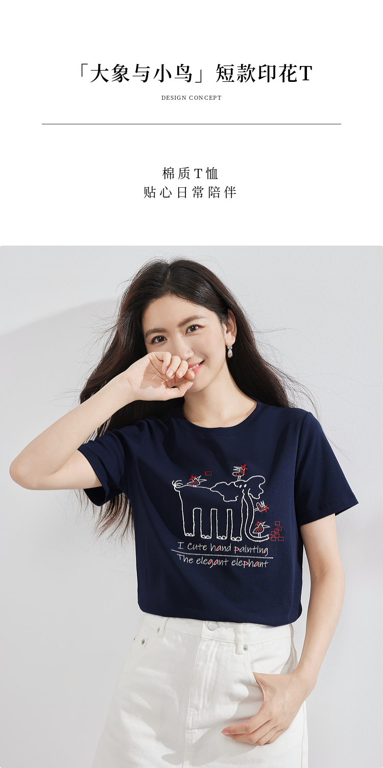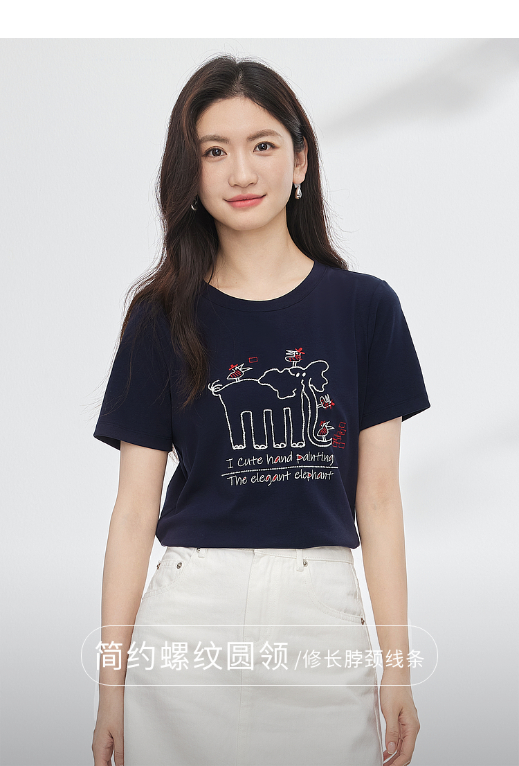 【专属特价】熙世界大象印花短袖T恤女2025夏季新款百搭休闲减龄圆领体恤上衣