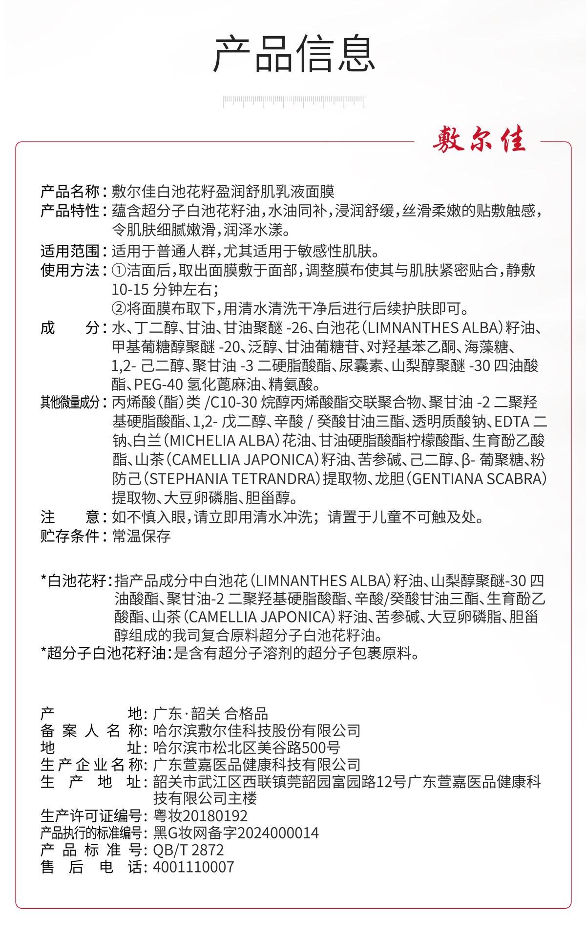 敷尔佳 白池花籽盈润舒肌乳液面膜(5片装)