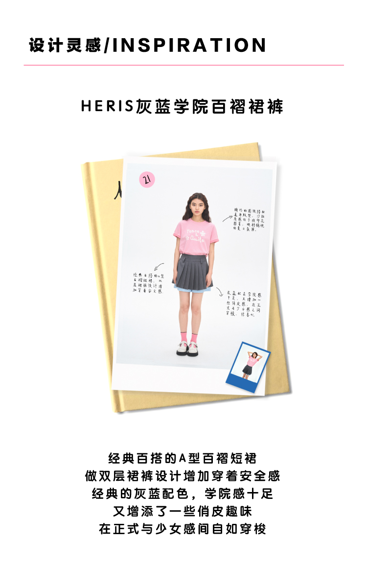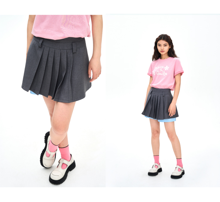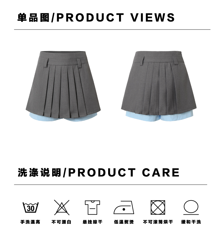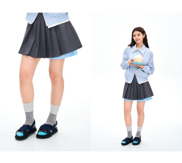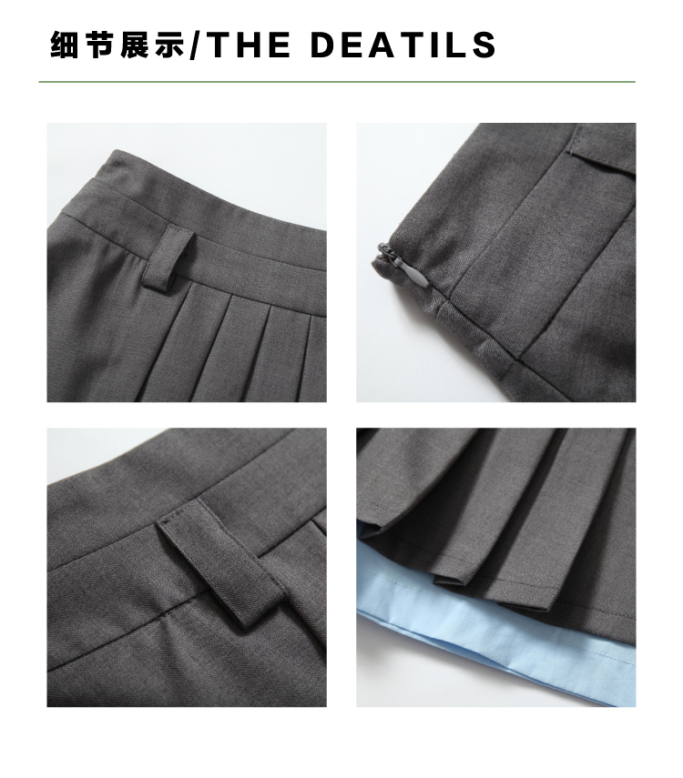 heris/H42112/灰蓝拼色假两件 学院感百褶A字 西装半身裙裙裤