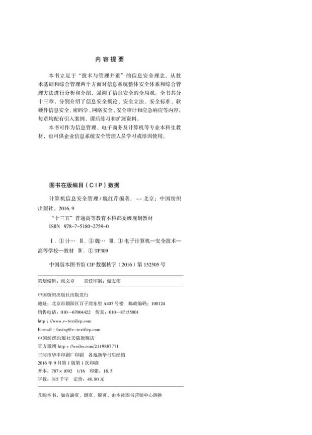 正版 计算机信息安全管理 魏红芹 中国纺织出版社 十三五规划教材 安全立法 安全标准 软硬件信息安全 密码学 网络安全 信息教材