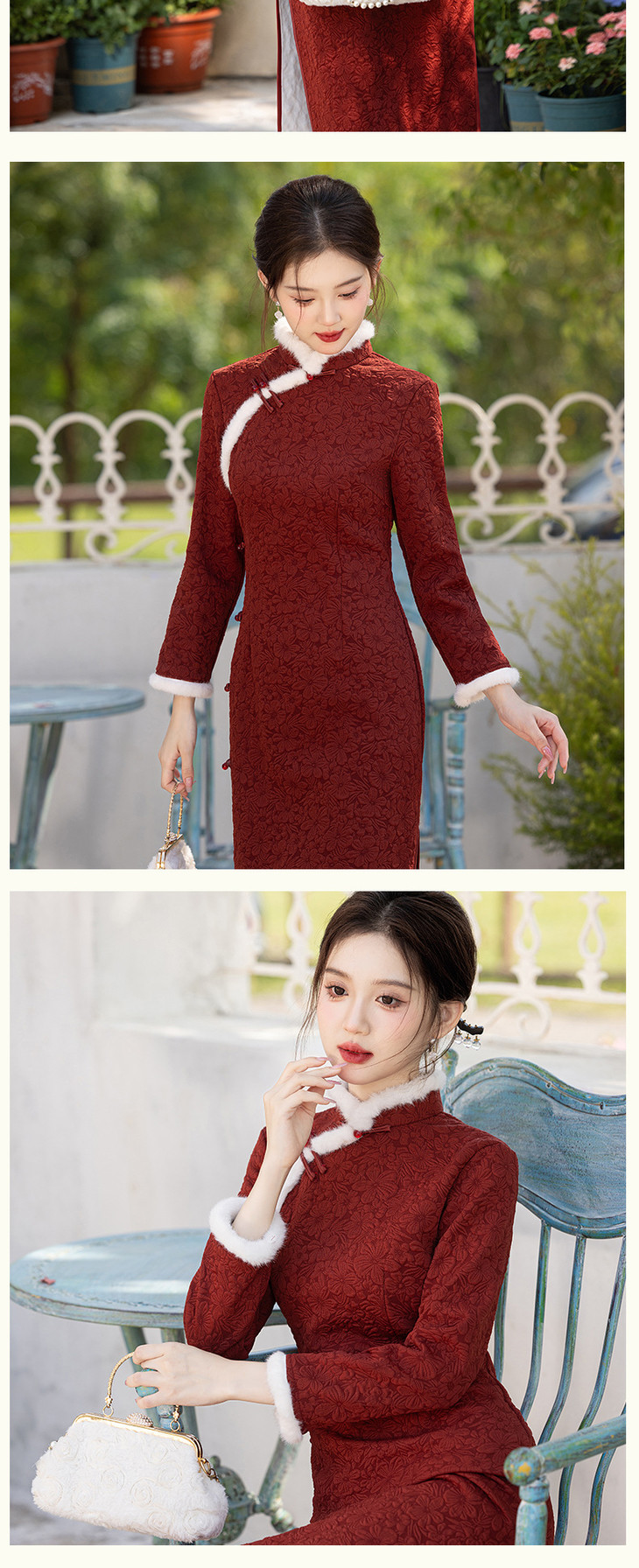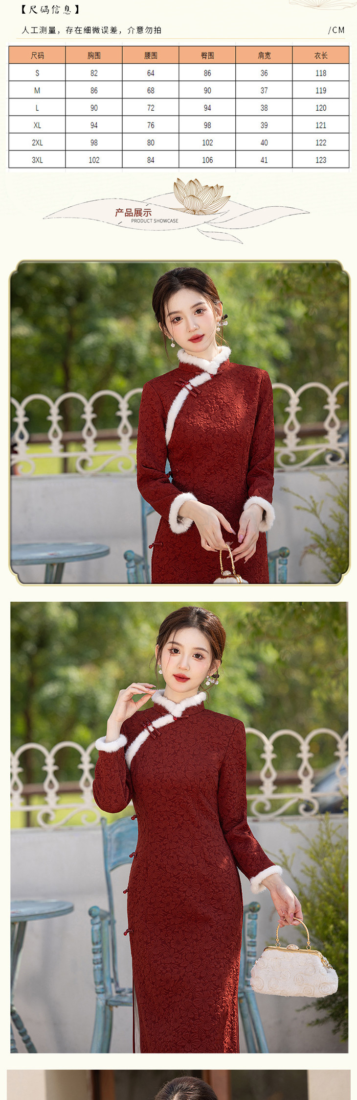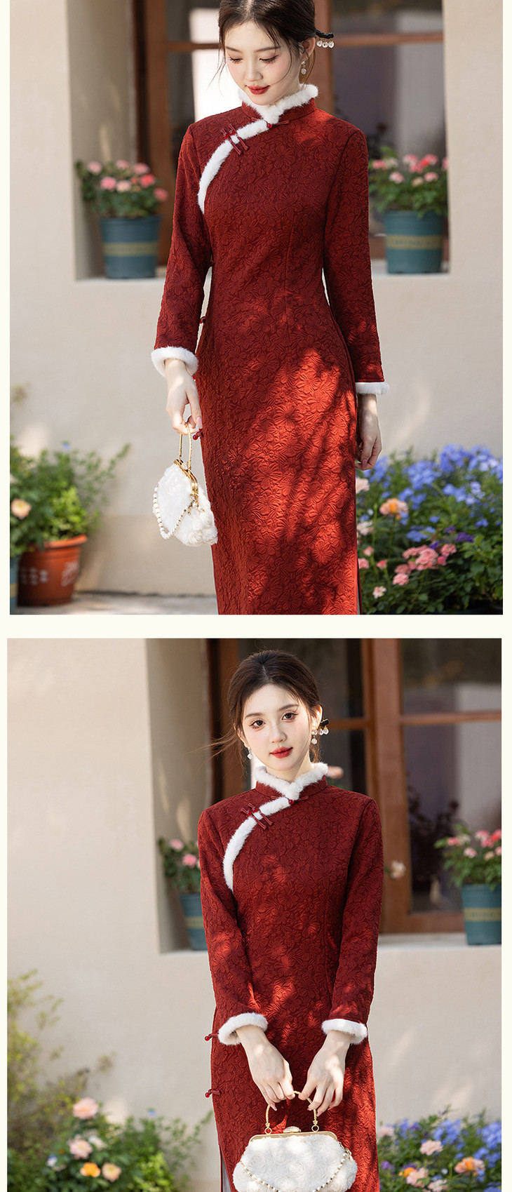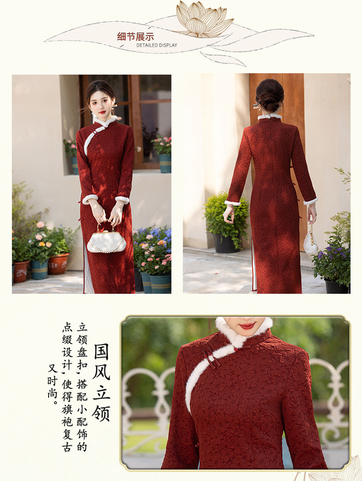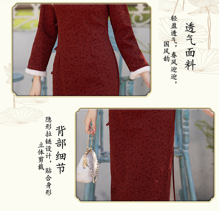 2024冬季新款提花加绒长款旗袍酒红色订婚礼服SJT720