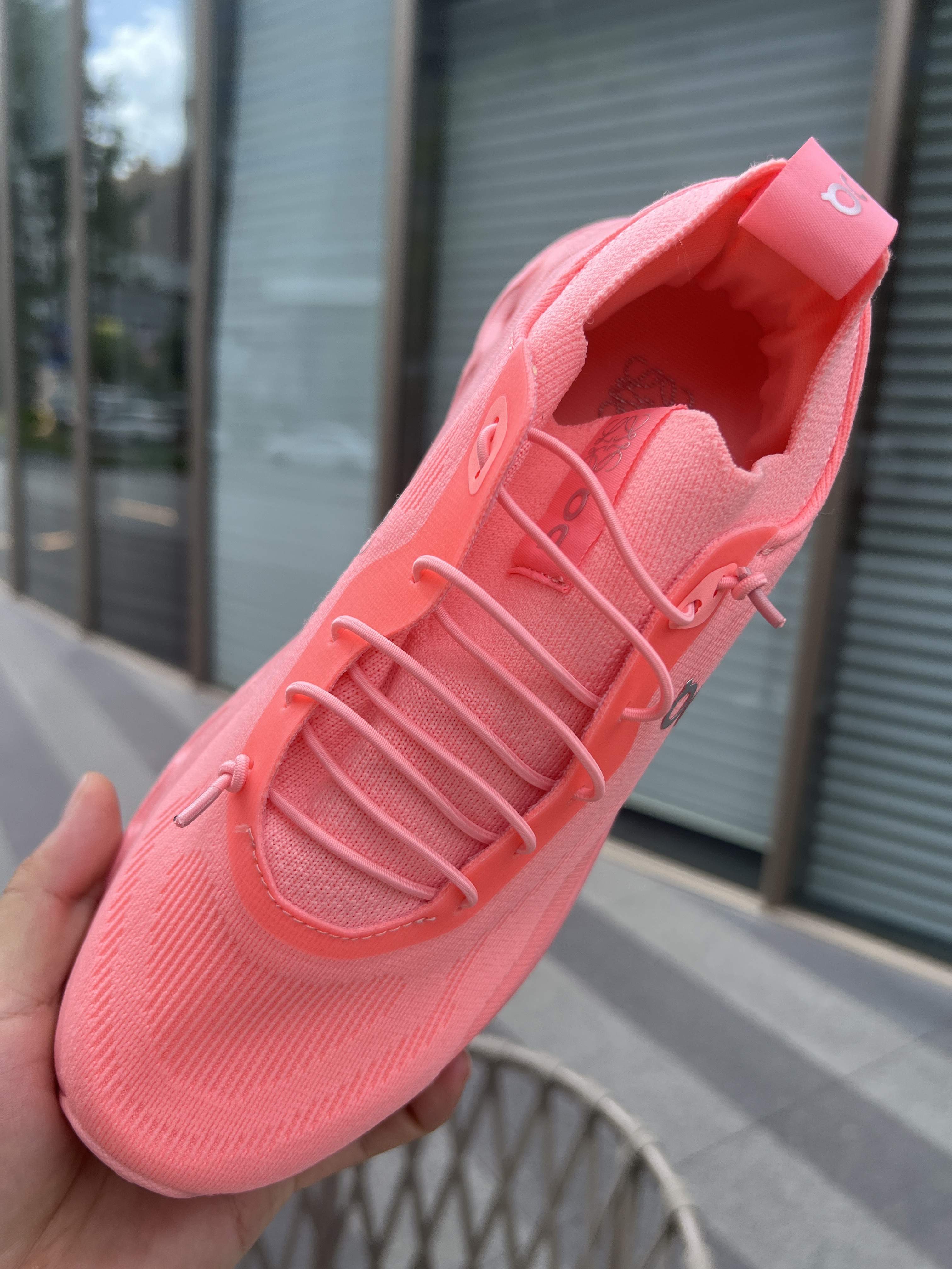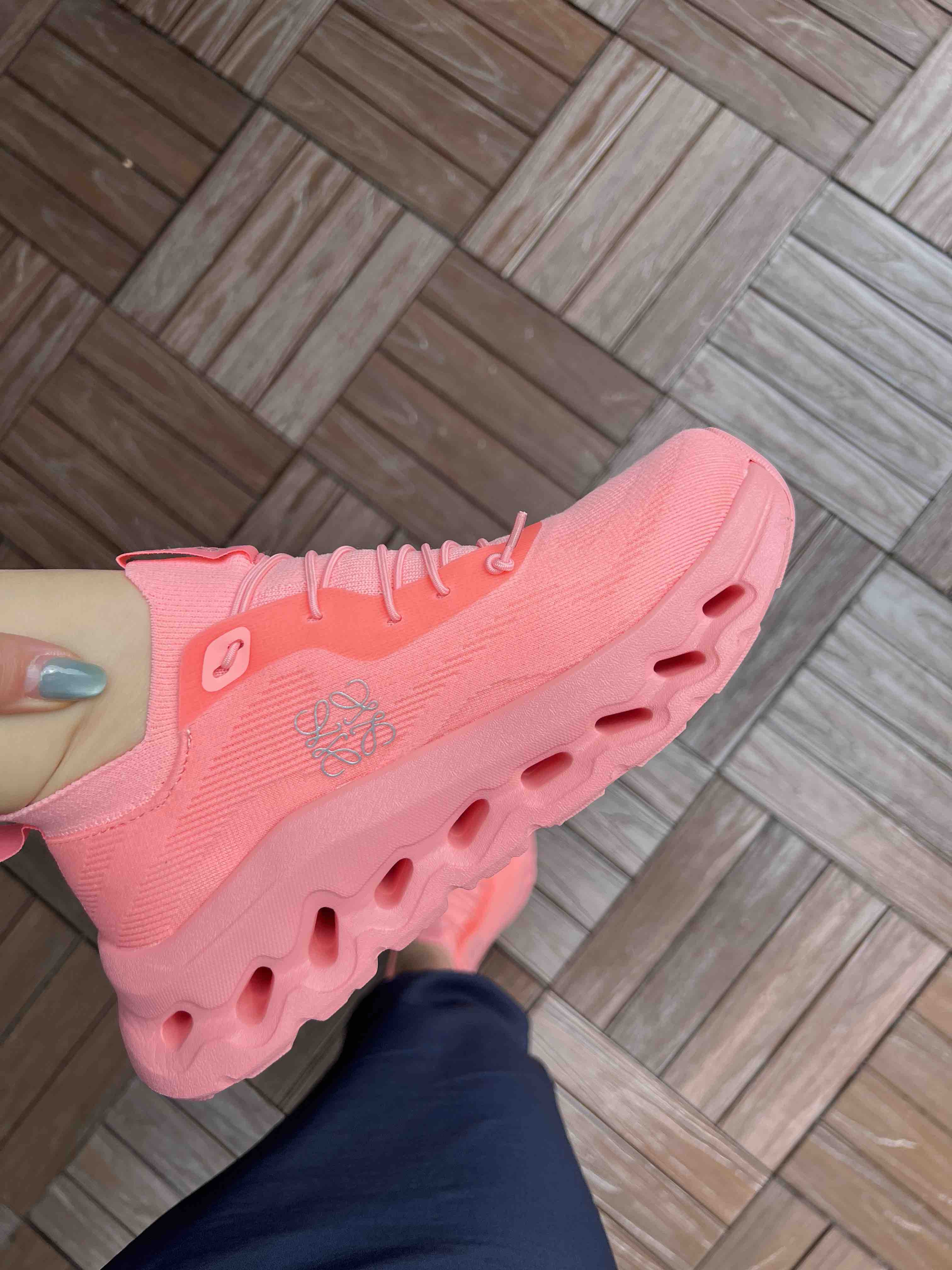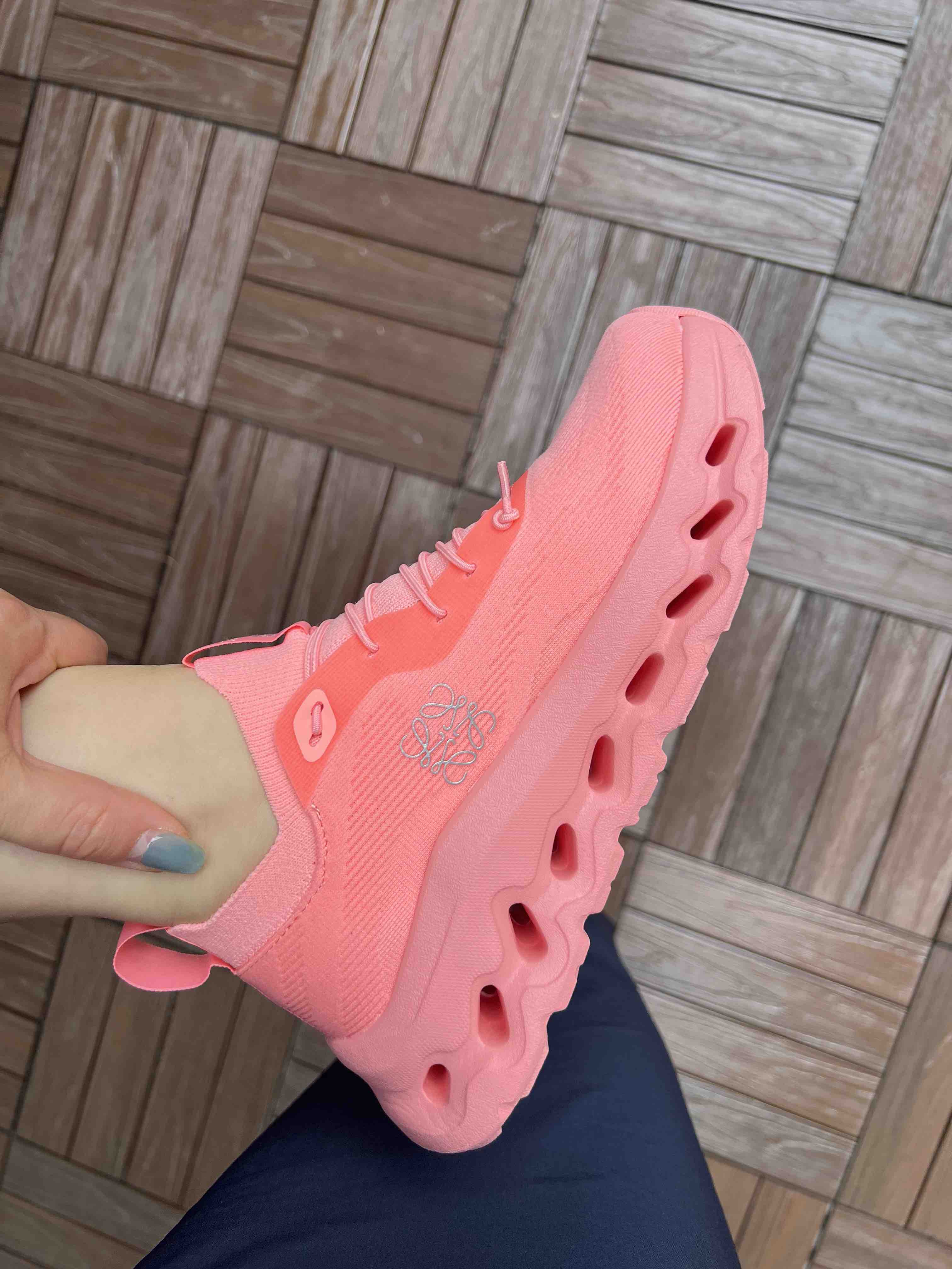 on一贯的运动针织面鞋,鞋舌和脚踝圈一是弹力紧松,on一贯的轻便厚底,空镂的设计加更减轻了重量轻,便透气同的时,显得颇有艺气术息