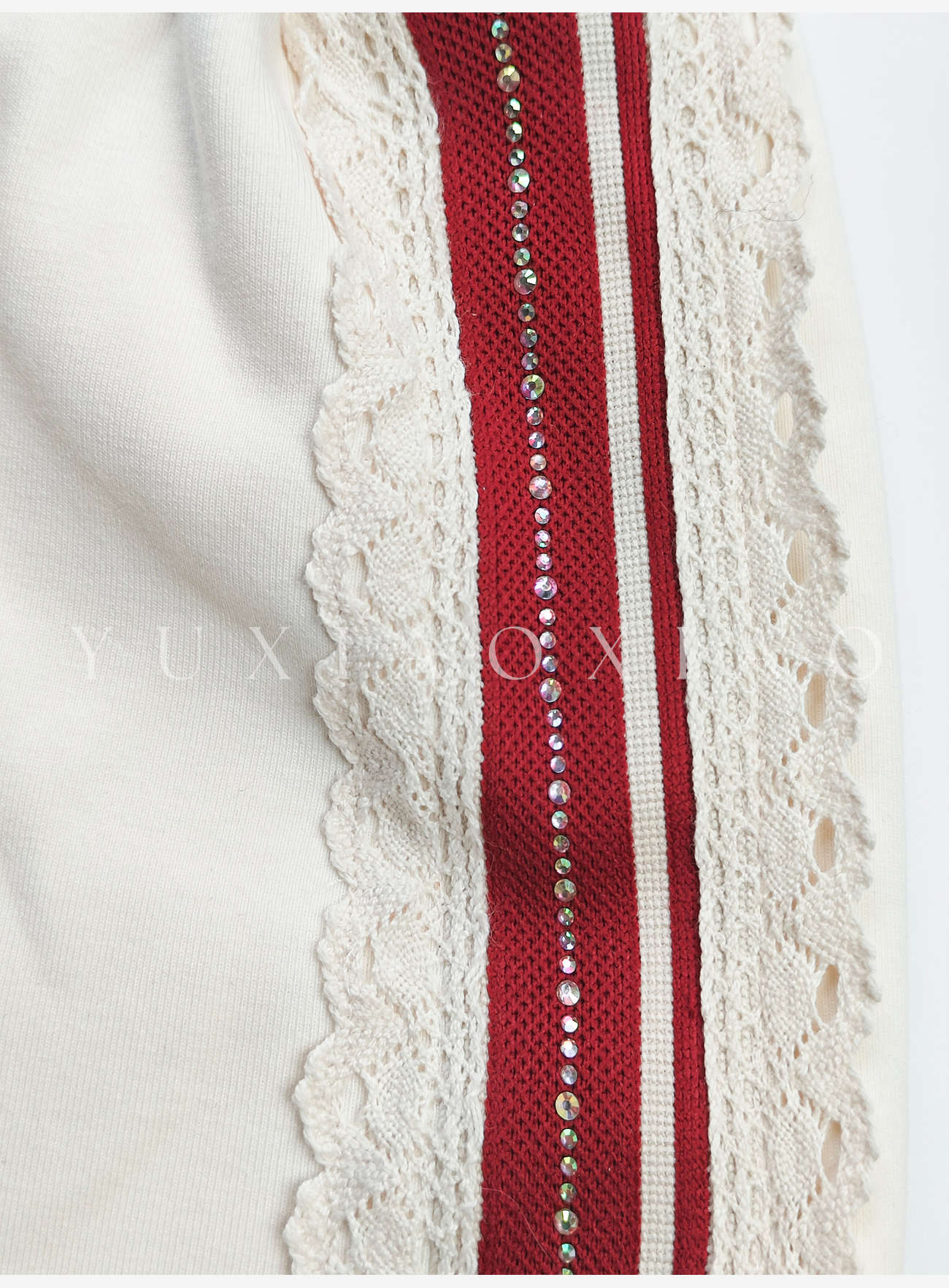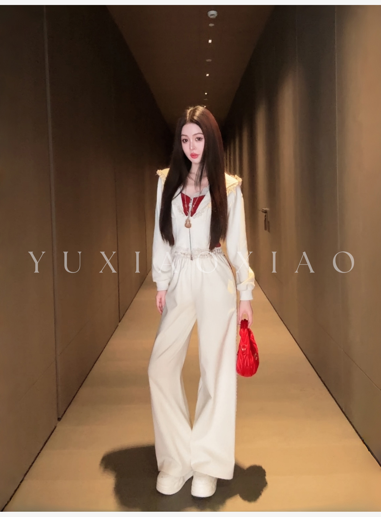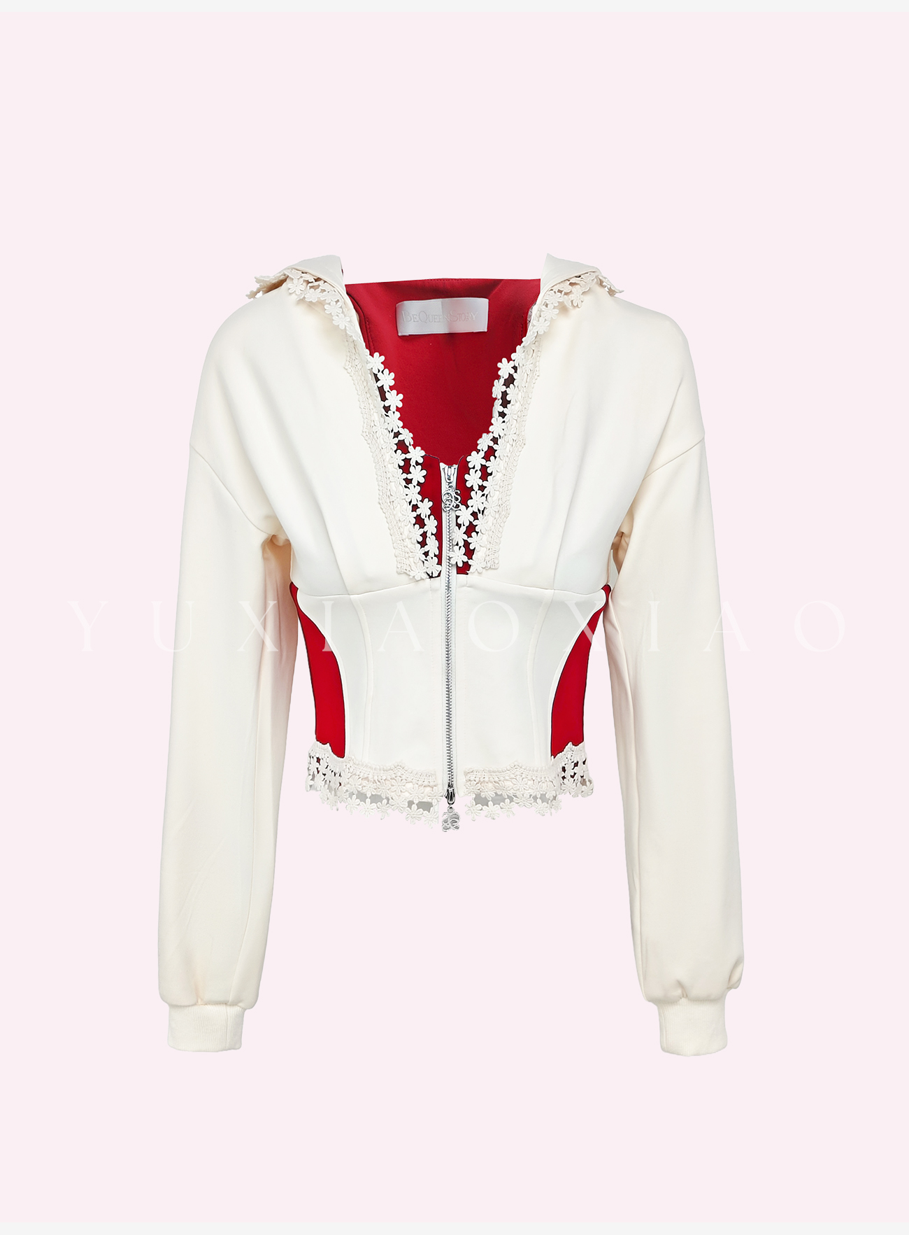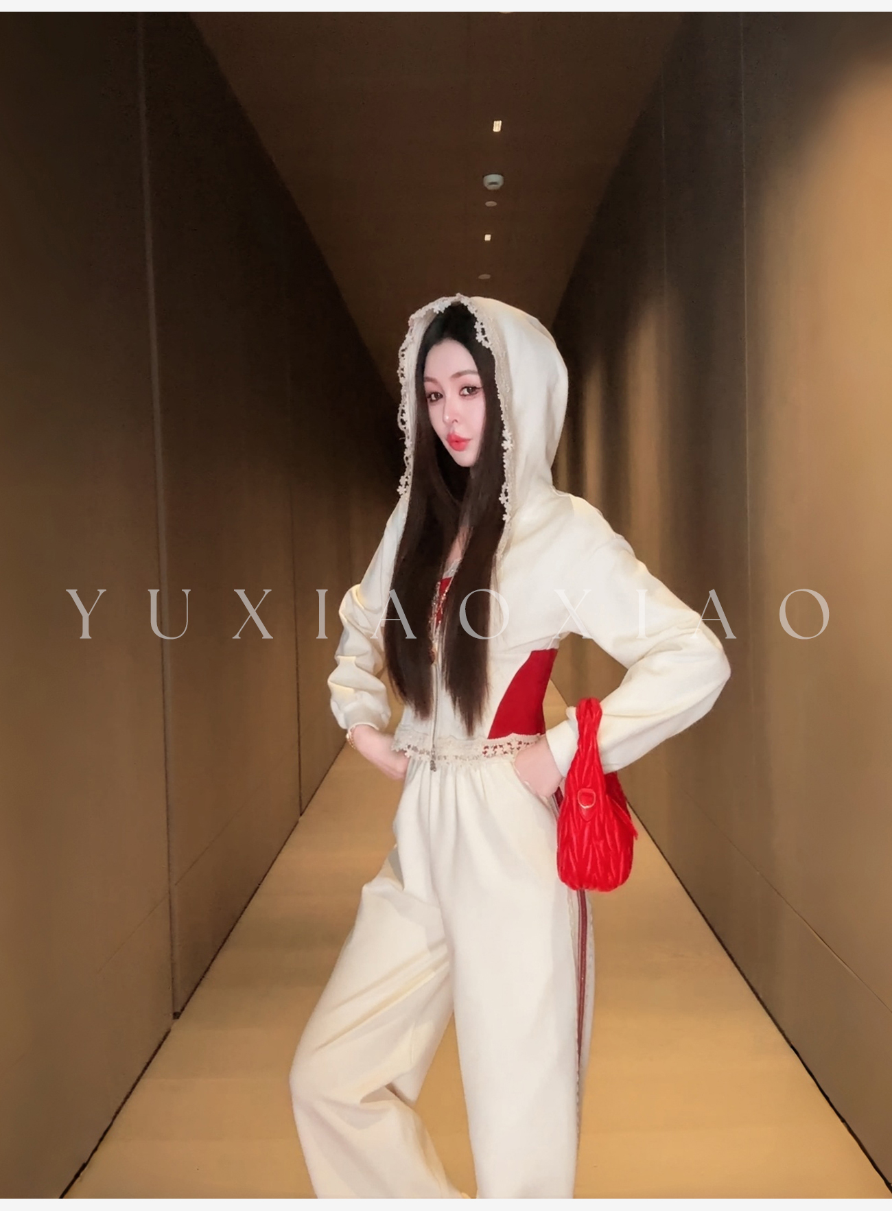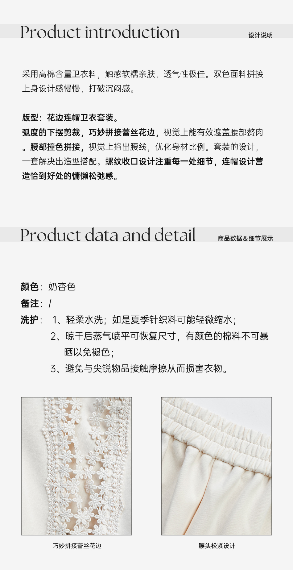 【大货捡漏,不退不换,微瑕】 【剑桥花语】高含棉双色拼接蕾丝花边连帽卫衣&休闲裤套装女