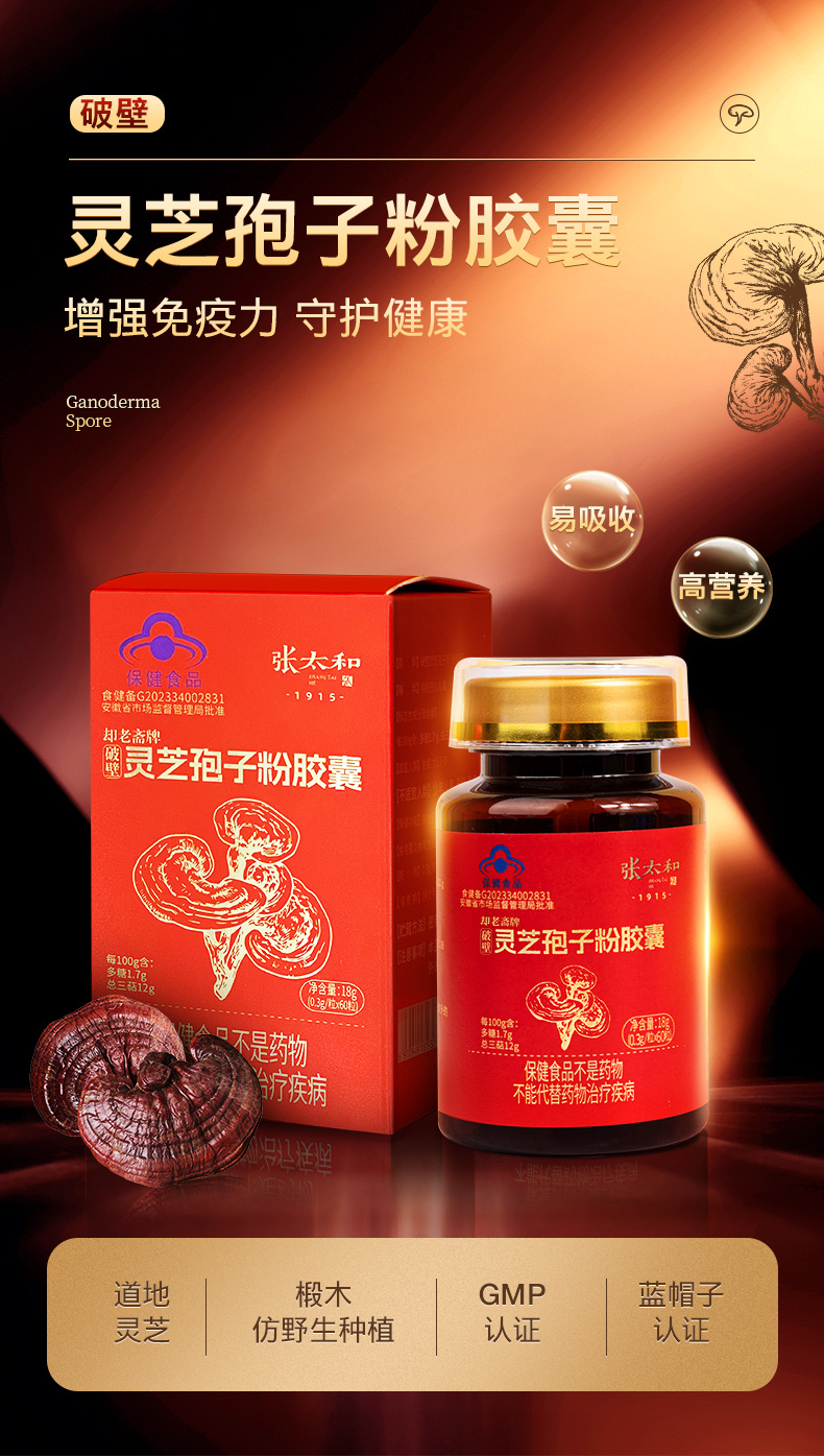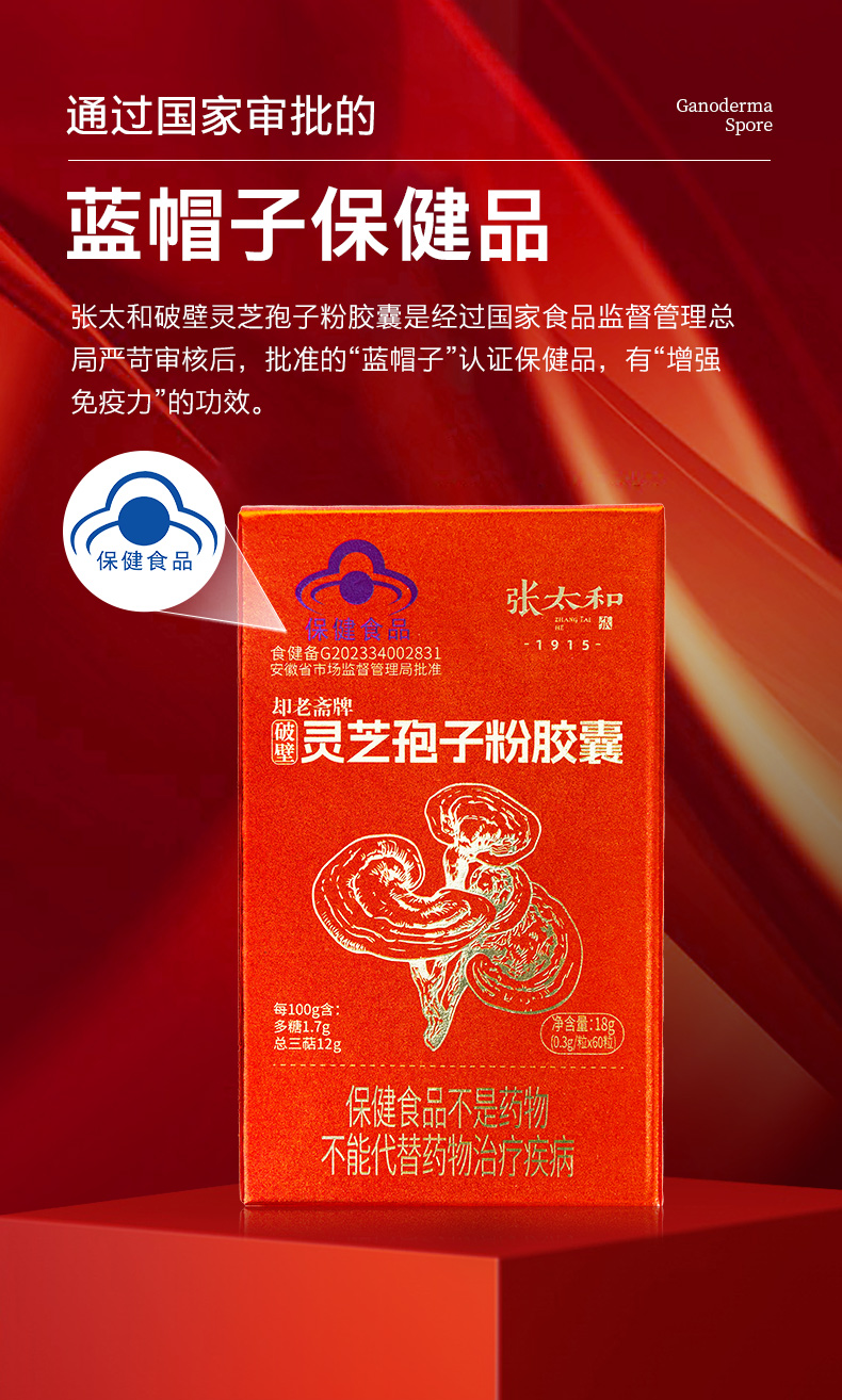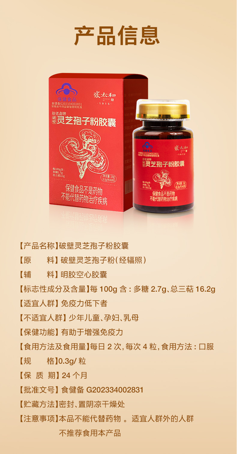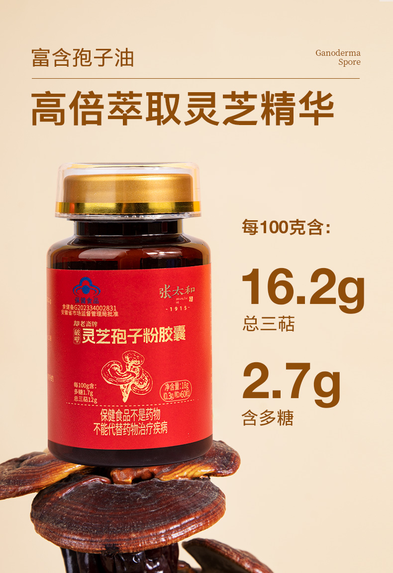 g【到手4瓶】张太和灵芝孢子粉胶囊~“蓝帽子”认证,粉纯质优含量高,不施加任何农药、化肥、激素等