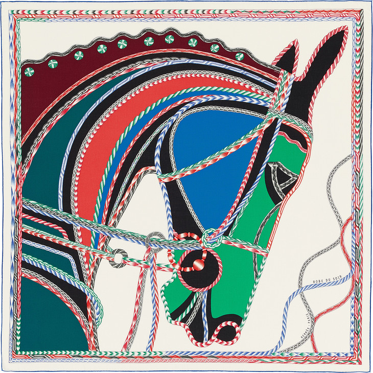 在爱马仕的丝巾史上屡屡出现以绦带、花边、边饰为主题的精彩创作。这门织品的装饰艺术不断创造出无穷尽的各式图案花样,通过图样的修饰,让原本单纯的面料幻化为华丽的织物。才艺超群的插画家弗洛伦斯·曼里克(Florence Manlik)在此方巾上创造出一匹——依她所言——非常令人“魂牵梦系”的骏马,其扣人心弦的神态组合上细绳、饰带、镶边……既是细致微妙的巧手杰作,又是视觉与美学兼具的造型臻品。
