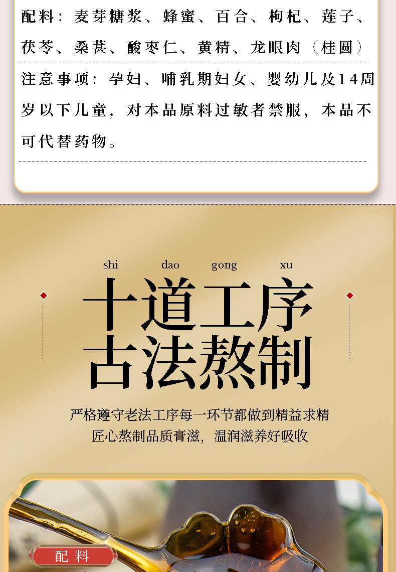 配料成分:麦芽糖浆、蜂蜜、百合、枸杞、莲子、茯苓、桑葚、酸枣仁、黄精、龙眼肉(桂圆)