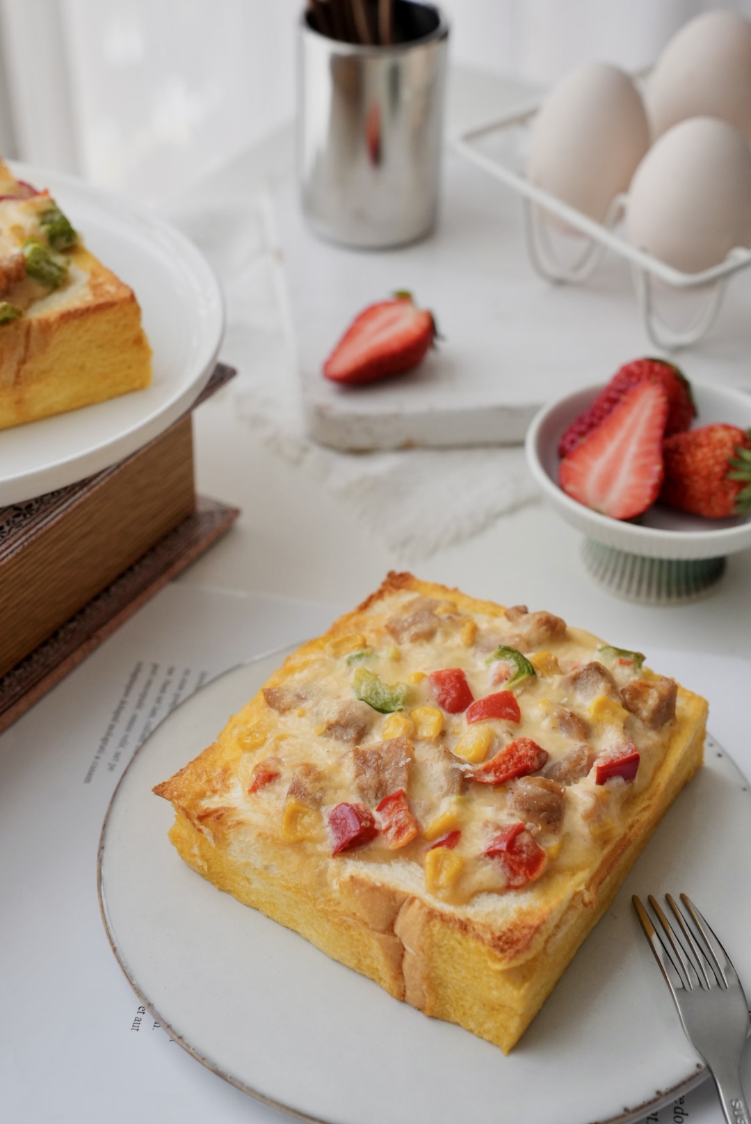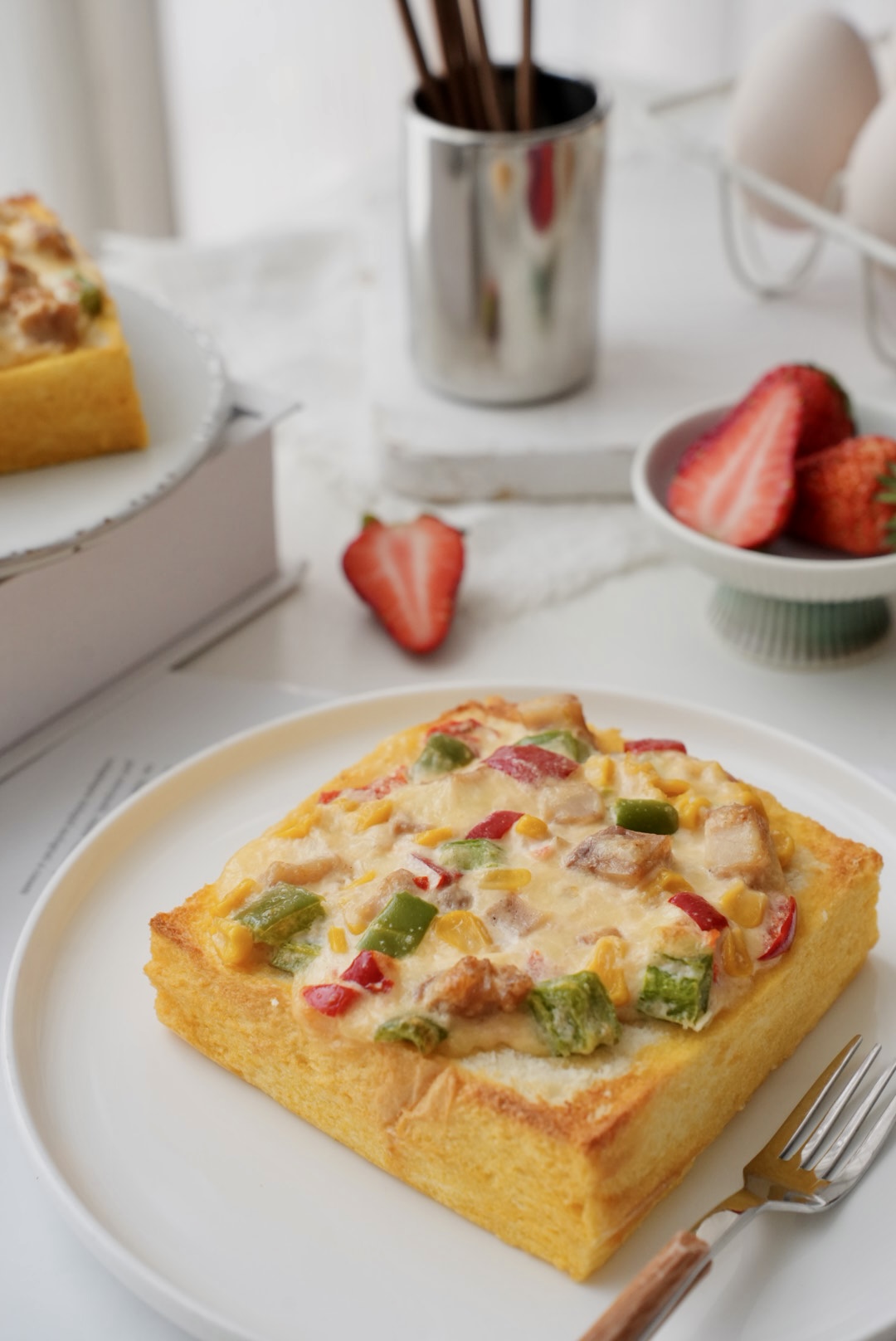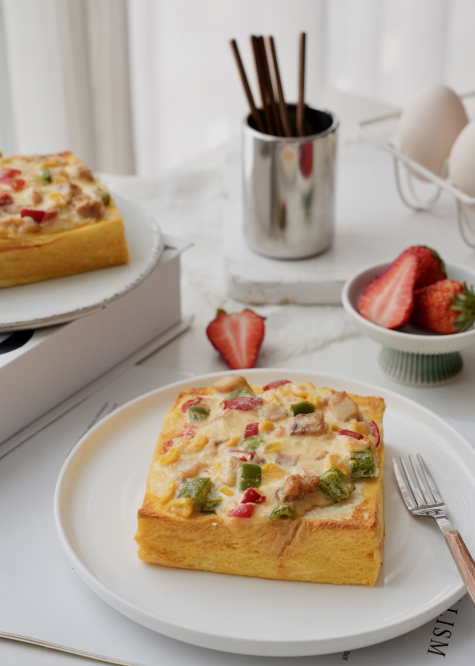 以奶香柔软的厚切吐司为基底,表面平铺调香的彩椒芝士鸡腿肉,吃之前加热一下,热乎乎的奶香味给你带来满满的幸福感!