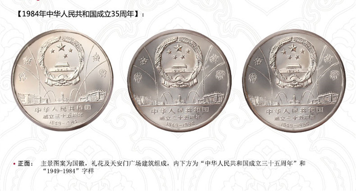 《建国35周年》币正面图案相同,主图案均为国徵、礼花和天安门广场建筑物。五彩缤纷的礼花升腾在天安门广场上空,使整个画面充满欢乐的气氛。正面下部有“中华人民共和国成立三十五周年”和“1949-1984”字样。背面图案分别为“开国大典”、“民族大团结”和“祖国万岁”。《建国35周年》币图案,生动记录着天安门前的激动,凝聚着天安门广场的壮丽辉煌。