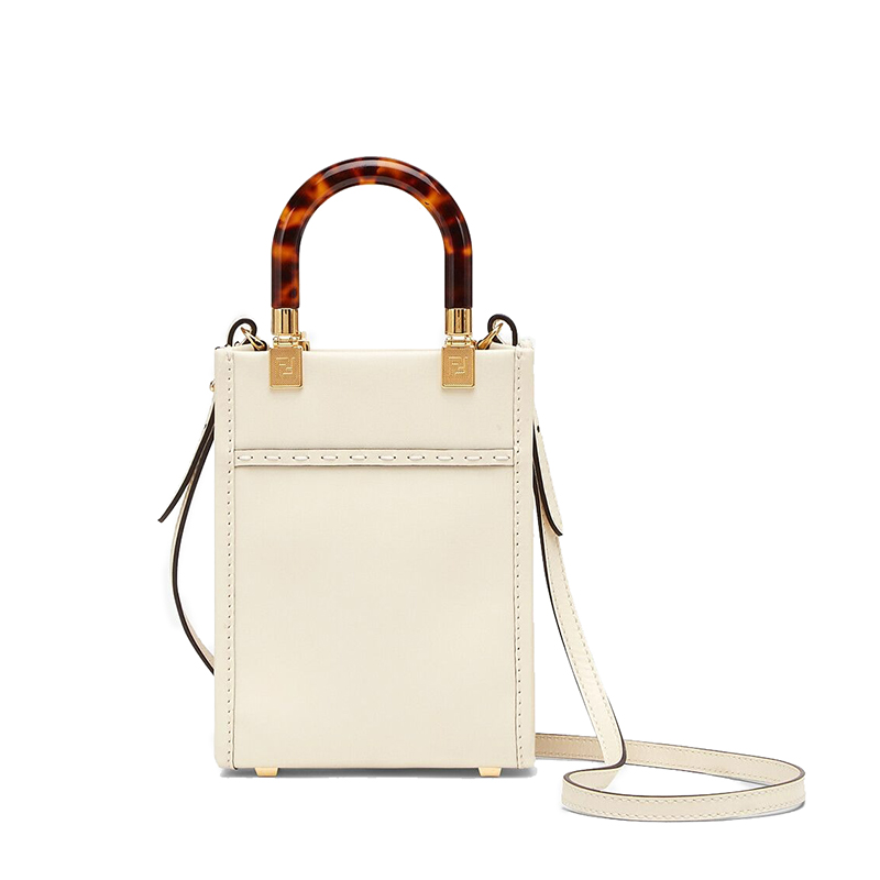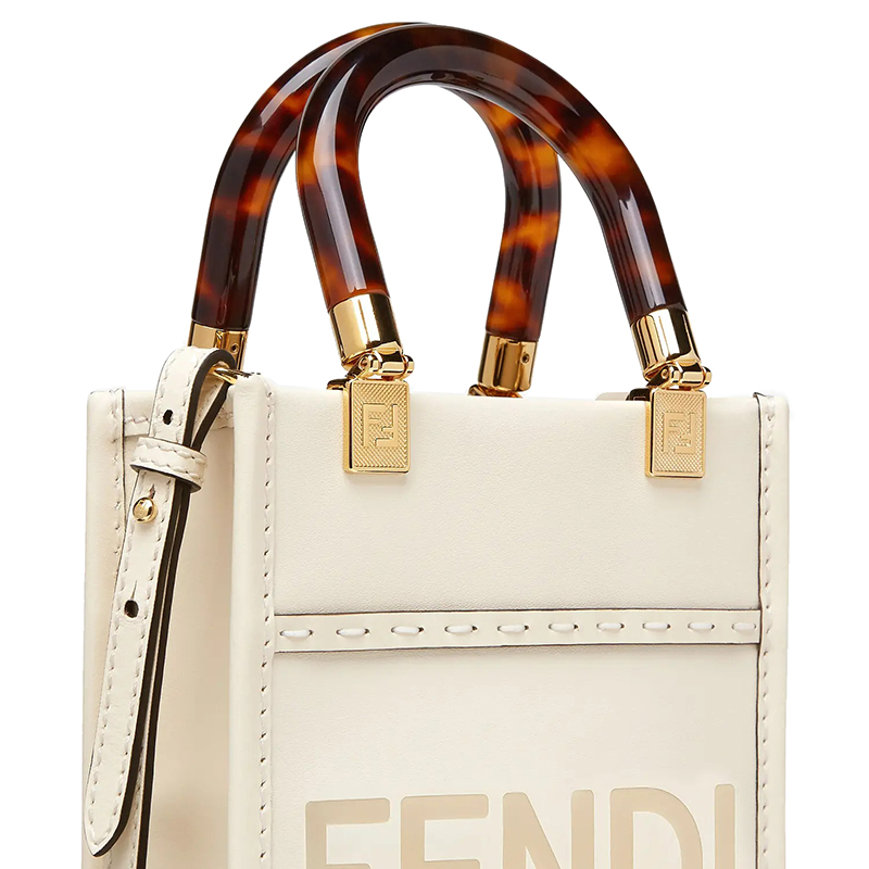 Sunshine 迷你白色皮革购物袋,带有热印“FENDI ROMA”字样和玳瑁纹有机玻璃硬质手柄。