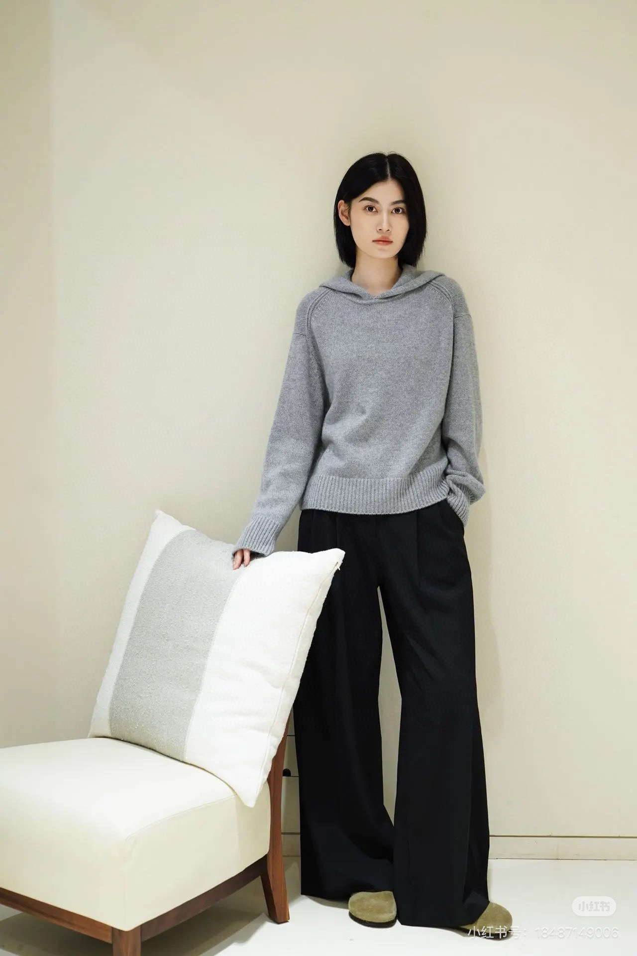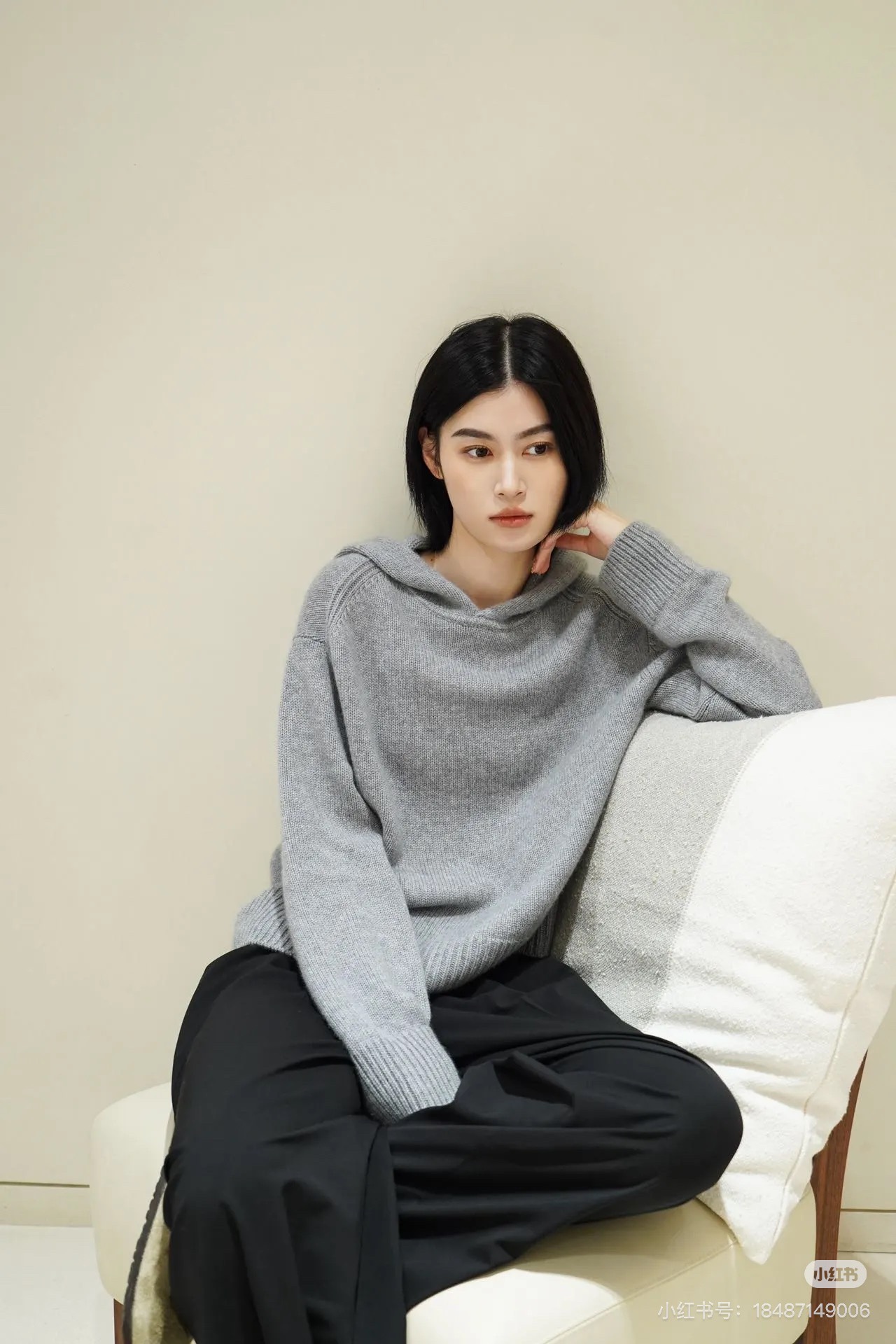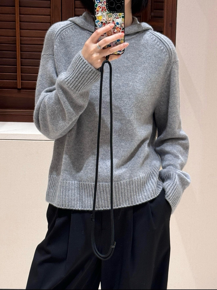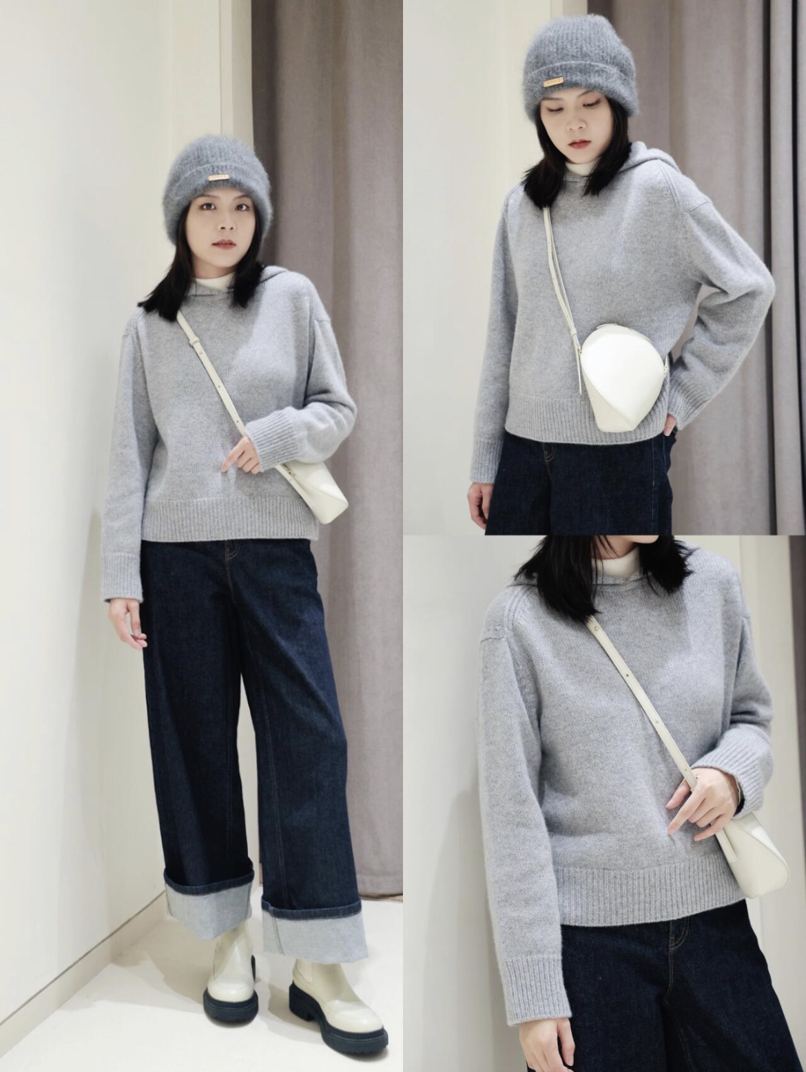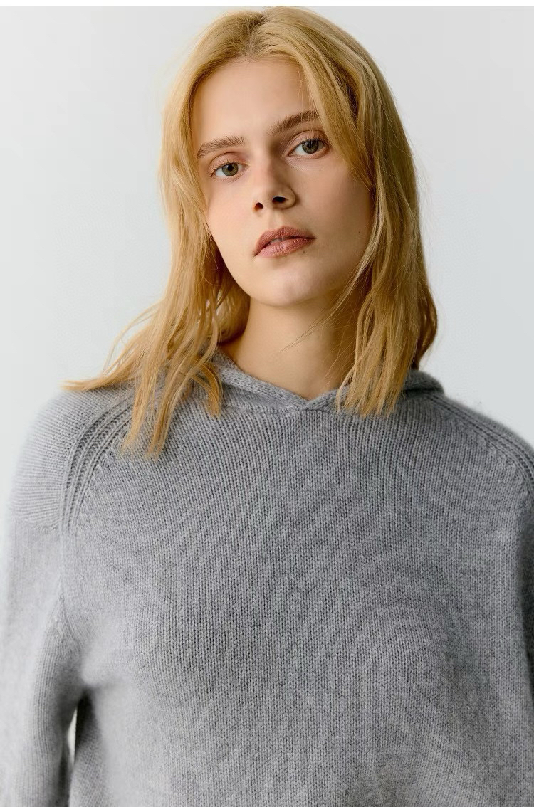 羊绒帽衫,知性灰色,中性知性,柔和温和,再配上牛仔裤,舒适休闲的代名词,休闲、利落大方~