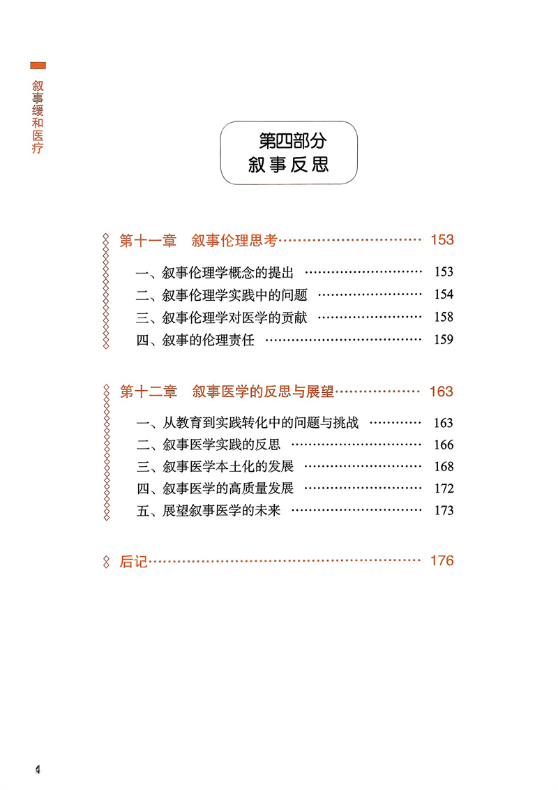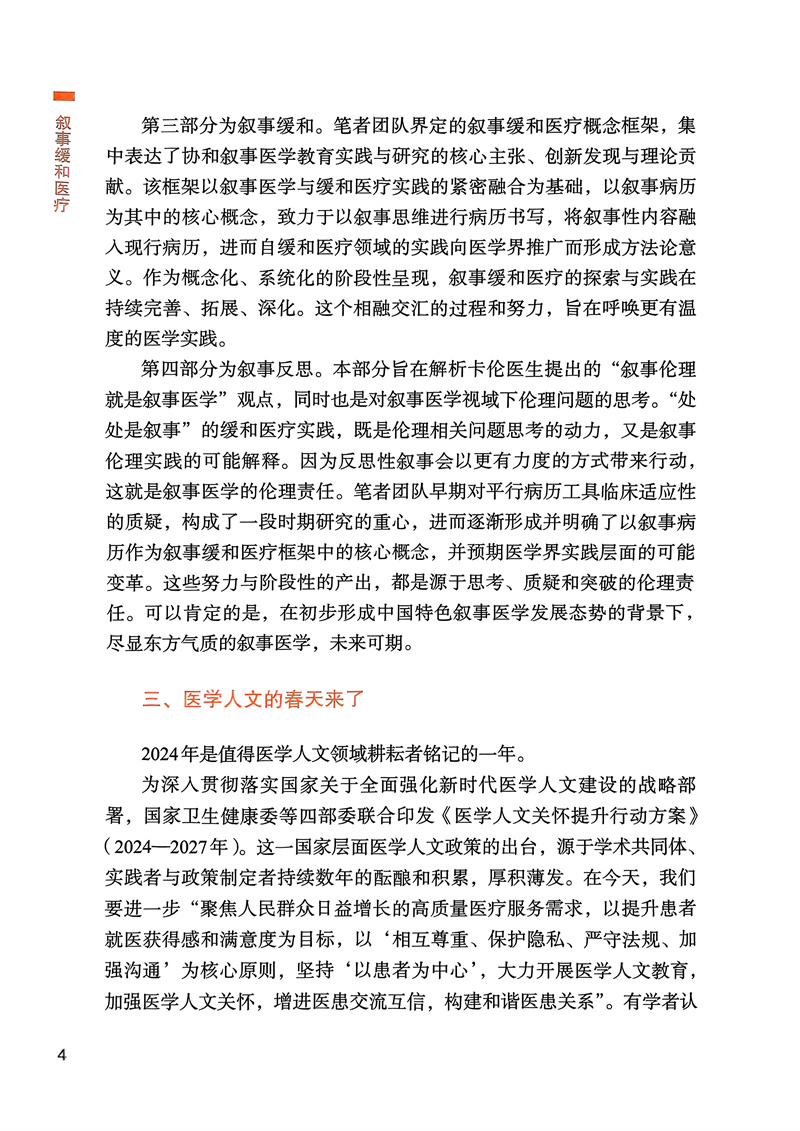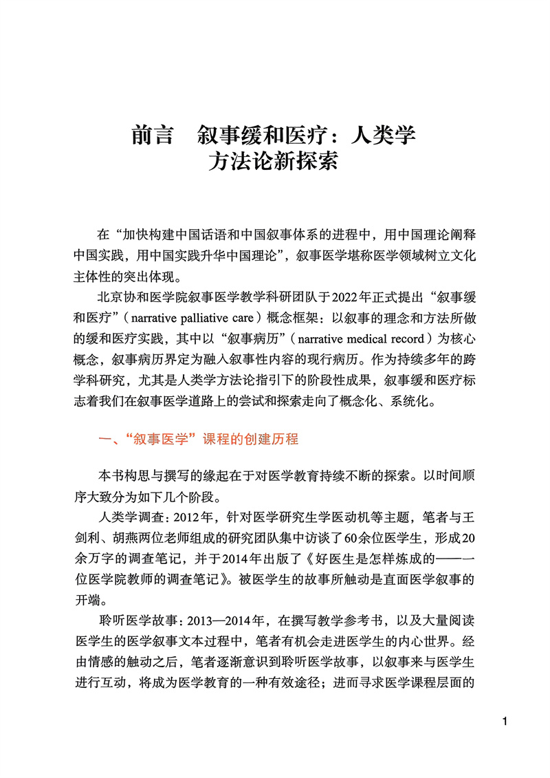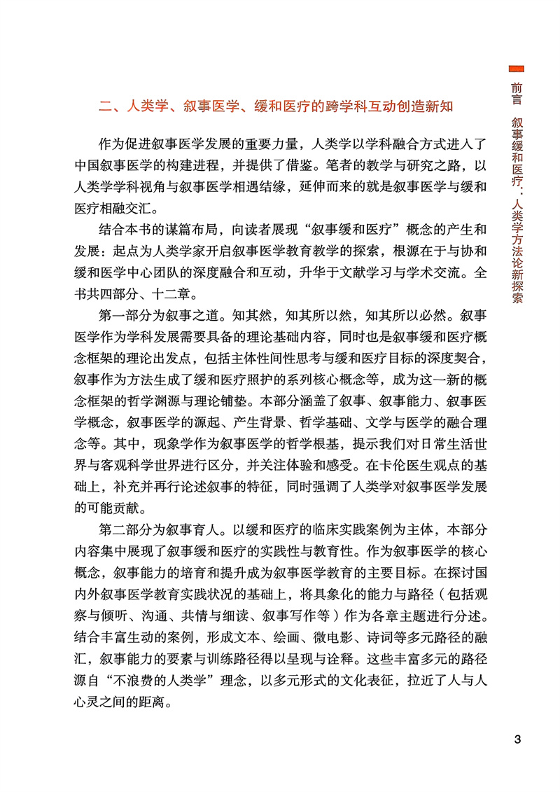 结合本书的谋篇布局,向读者展现“叙事缓和医疗”概念的产生和发展:起点为人类学家开启叙事医学教育教学的探索,根源在于与协和缓和医学中心团队的深度融合和互动,升华于文献学习与学术交流。全书共四部分、十二章。第一部分为叙事之道。本部分涵盖了叙事、叙事能力、叙事医学概念,叙事医学的源起、产生背景、哲学基础、文学与医学的融合理念等。其中,现象学作为叙事医学的哲学根基,提示我们对日常生活世界与客观科学世界进行区分,并关注体验和感受。在卡伦医生观点的基础上,补充并再行论述叙事的特征,同时强调了人类学对叙事医学发展的可能贡献。第二部分为叙事育人。以缓和医疗的临床实践案例为主体,本部分内容集中展现了叙事缓和医疗的实践性与教育性。作为叙事医学的核心概念,叙事能力的培育和提升成为叙事医学教育的主要目标。在探讨国内外叙事医学教育实践状况的基础上,将具象化的能力与路径(包括观察与倾听、沟通、共情与细读、叙事写作等)作为各章主题进行分述。结合丰富生动的案例,形成文本、绘画、微电影、诗词等多元路径的融汇,叙事能力的要素与训练路径得以呈现与诠释。这些丰富多元的路径源自“不浪费的人类学”理念,以多元形式的文化表征,拉近了人与人心灵之间的距离。第三部分为叙事缓和。笔者团队界定的叙事缓和医疗概念框架,集中表达了协和叙事医学教育实践与研究的核心主张、创新发现与理论贡献。该框架以叙事医学与缓和医疗实践的紧密融合为基础,以叙事病历为其中的核心概念,致力于以叙事思维进行病历书写,将叙事性内容融入现行病历,进而自缓和医疗领域的实践向医学界推广而形成方法论意义。作为概念化、系统化的阶段性呈现,叙事缓和医疗的探索与实践在持续完善、拓展、深化。这个相融交汇的过程和努力,旨在呼唤更有温度的医学实践。第四部分为叙事 反思。本部分旨在解析卡伦医生提出的“叙事伦理就是叙事医学”观点,同时也是对叙事医学视域下伦理问题的思考。“处处是叙事”的缓和医疗实践,既是伦理相关问题思考的动力,又是叙事伦理实践的可能解释。因为反思性叙事会以更有力度的方式带来行动,这就是叙事医学的伦理责任。笔者团队早期对平行病历工具临床适应性的质疑,构成了一段时期研究的重心,进而逐渐形成并明确了以叙事病历作为叙事缓和医疗框架中的核心概念,并预期医学界实践层面的可能变革。这些努力与阶段性的产出,都是源于思考、质疑和突破的伦理责任。