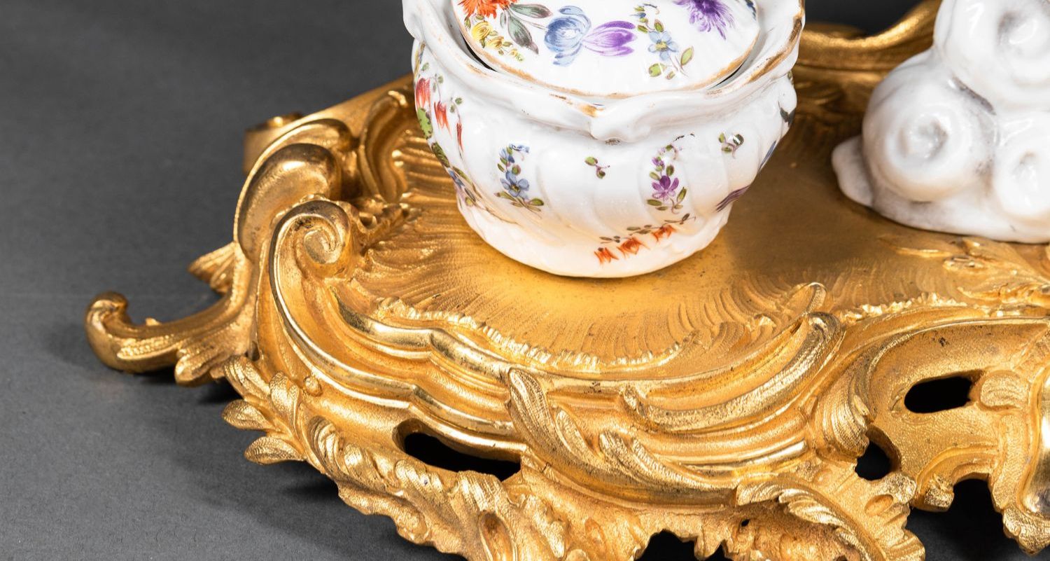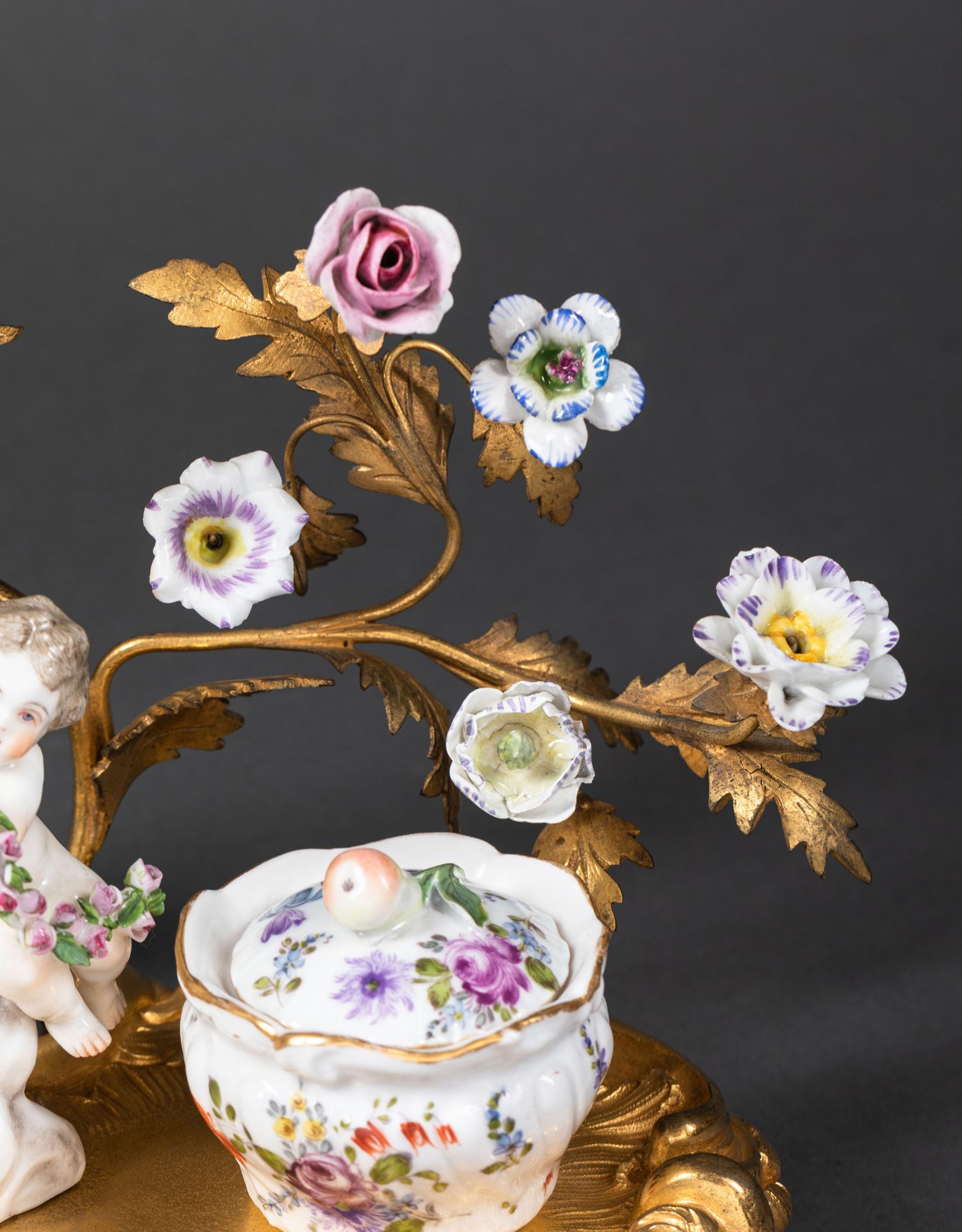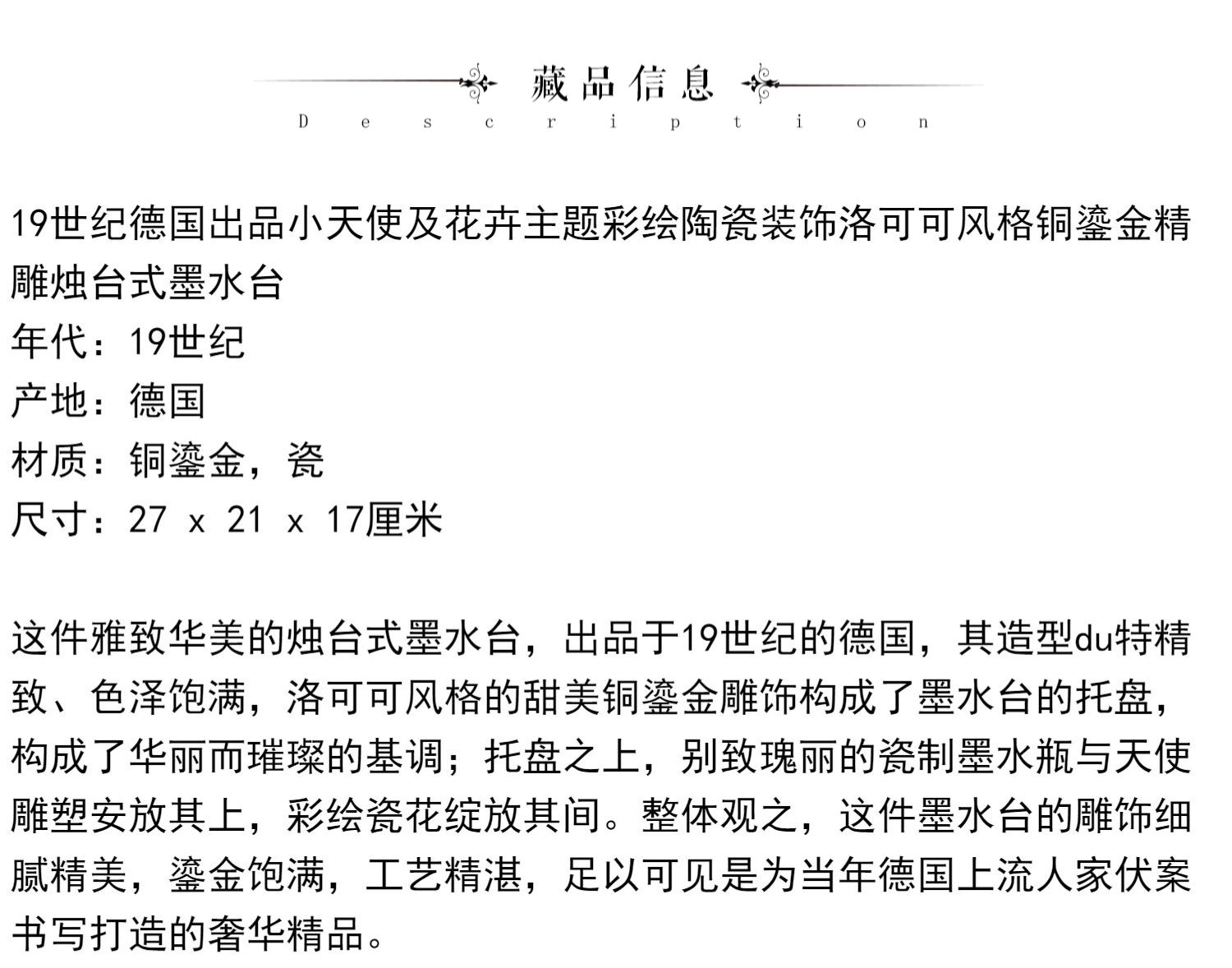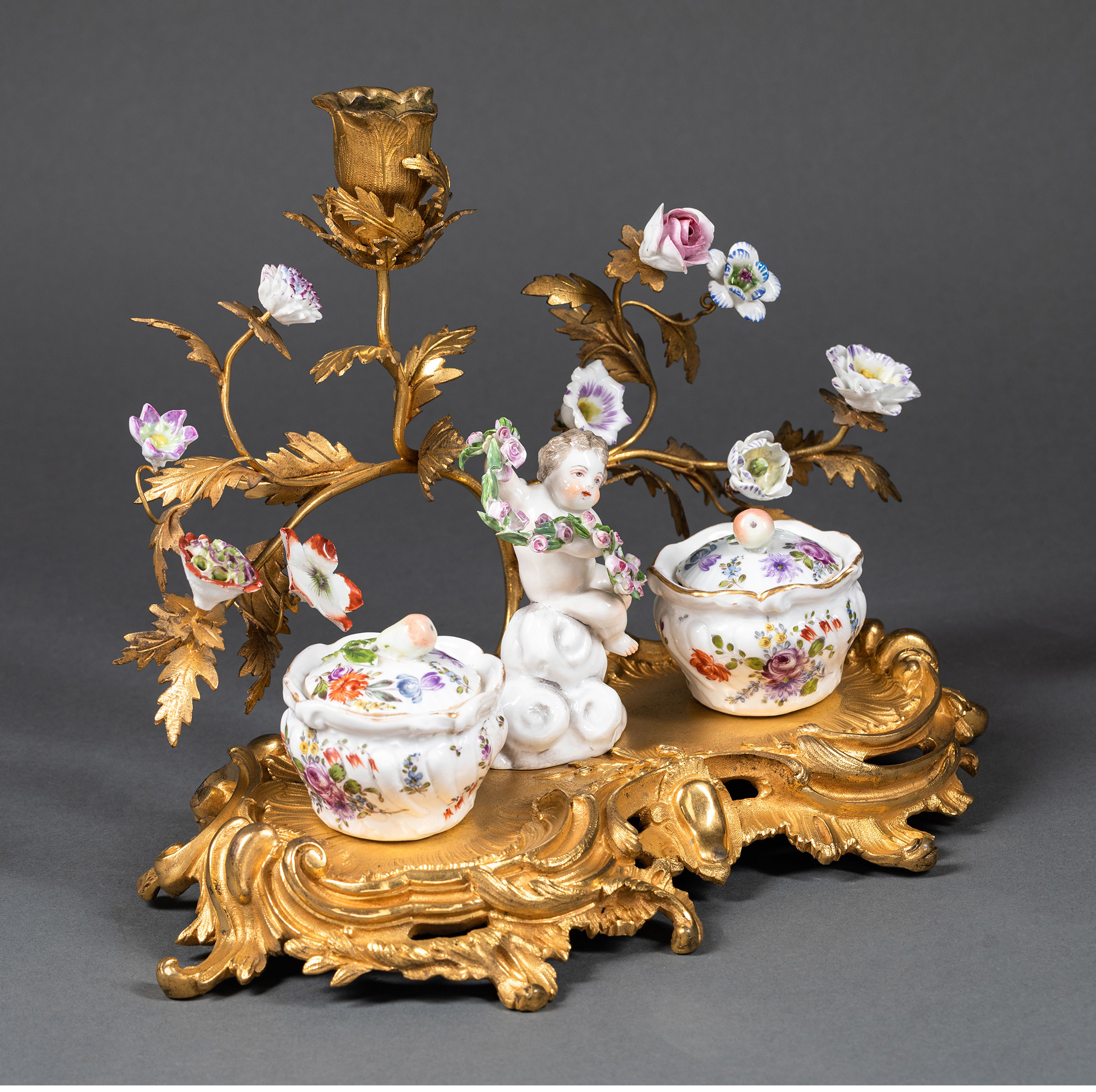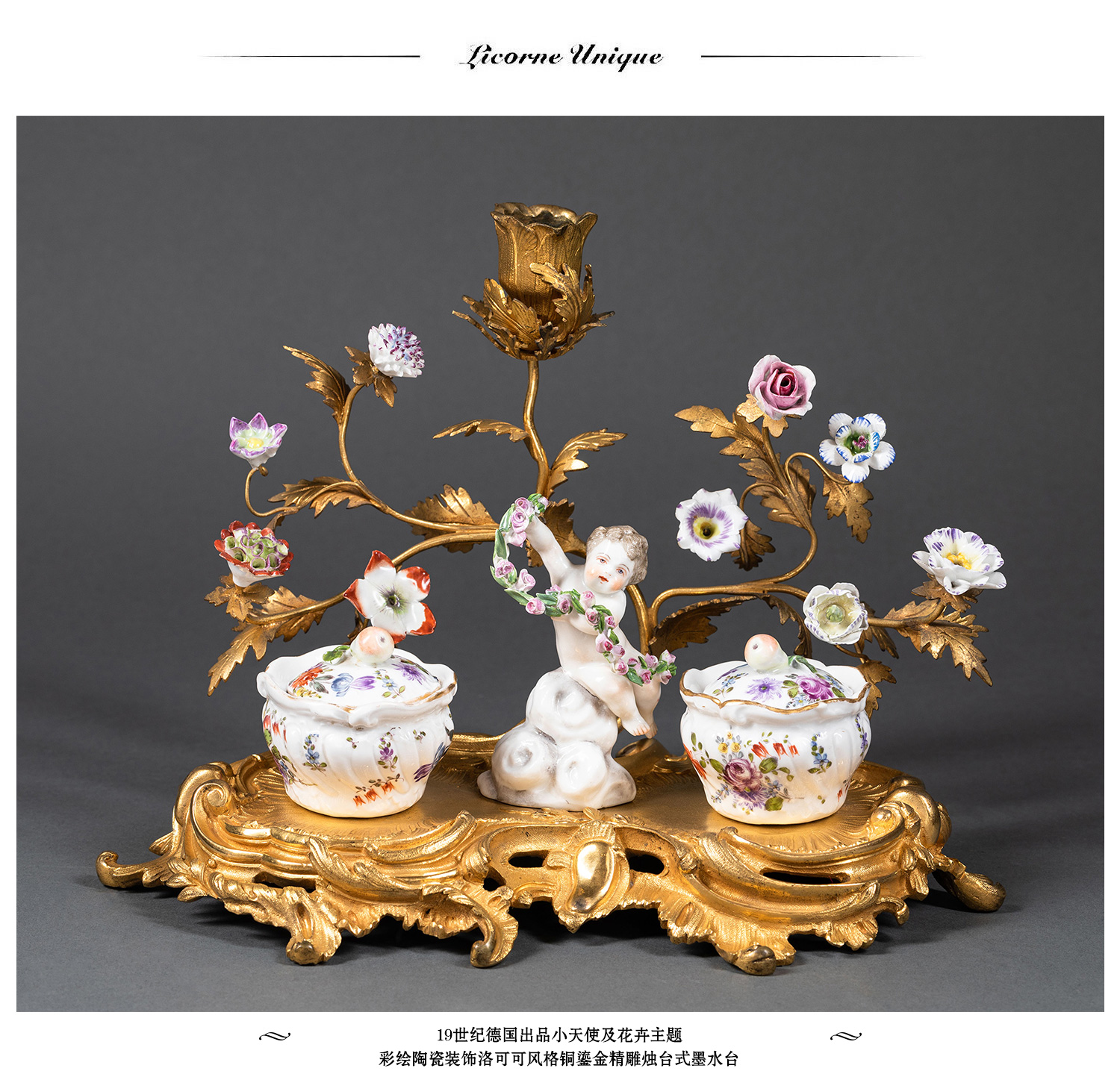 独角鹿西洋古董小天使花卉彩绘陶瓷洛可可风铜鎏金烛台式墨水台