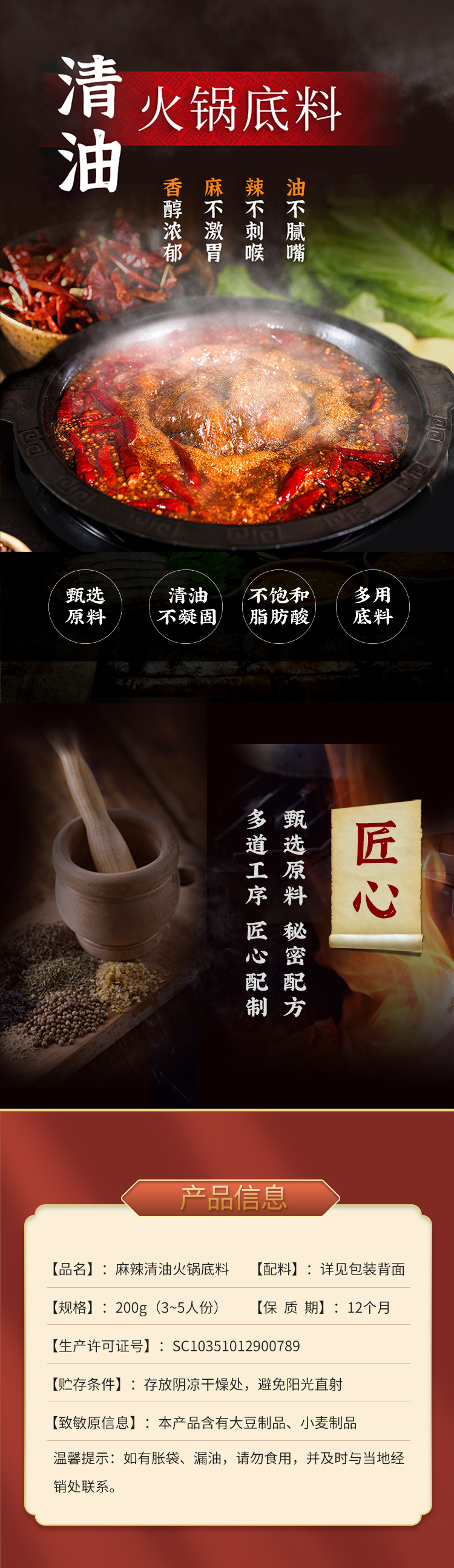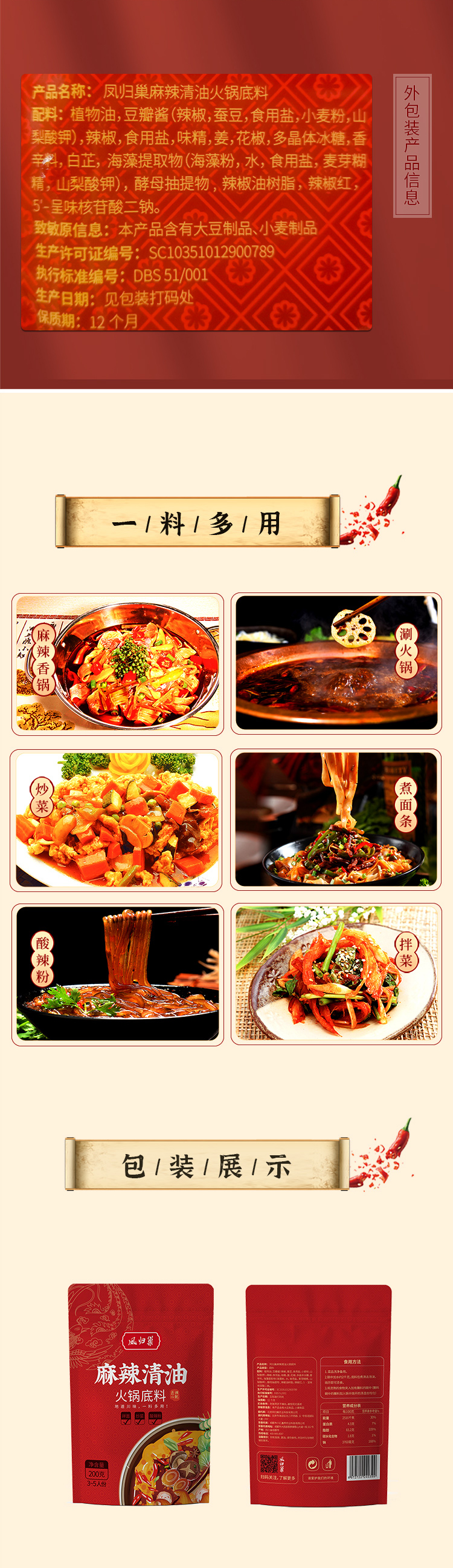 凤归巢 清油火锅底料 200g袋 麻辣烫香锅冒菜酸辣粉调料 多用火锅底料 一料多用