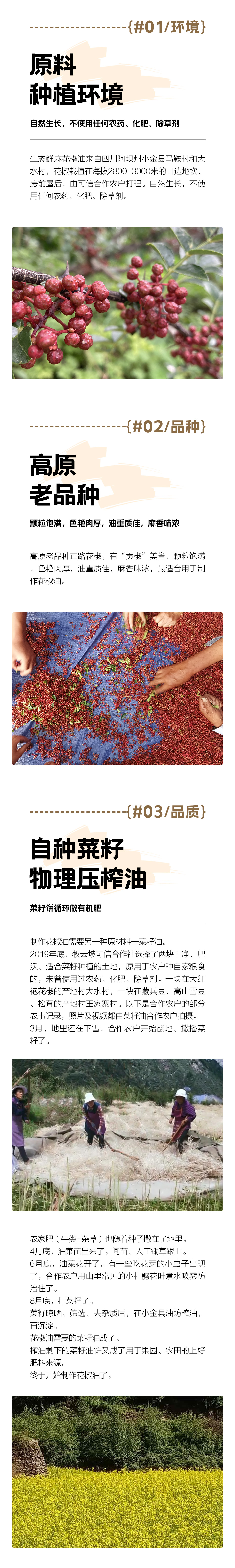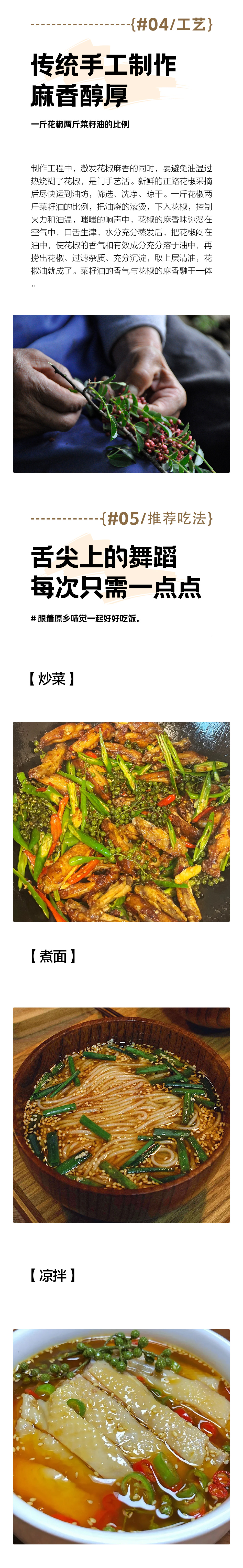 【生产者】:牧云坡可信合作社 【配料】:新鲜高原老品种正绿花椒、菜籽油,均为生态种植 【产地】:四川省小金县海拔3000米左右藏寨 【种植方式】:原料花椒及菜籽均为生态种植,不使用农药、化肥、除草剂等 【加工方式】:采用鲜花椒,菜籽油,传统工艺熬制 【保质期】:18个月 【规格】:249ml 【温馨提示】: 1.若有沉淀物属天然析出物,不影响品质。 2.因麻香味较重,初次使用,建议少量添加。 【售后标准】: 1. 品相、外观、口感不在售后范围内。 2. 收货后请尽快开箱验货,若有质量问题,请在签收12小时内拍照联系客服,逾期不售后。 3. 若需售后,请将快递面单与问题产品一起拍照提供给客服,须可清晰看到快递单号与产品问题。 4. 地址不详、收件信息有误、拒收、超时签收、发出后更改收件地址等问题件,无法售后赔付。 |
