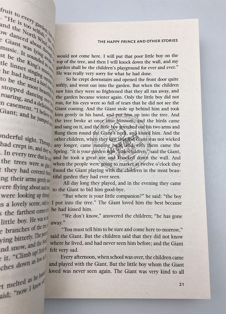 The Happy Prince and Other Stories《快乐王子及其他故事》收入王尔德两部著名的童话集:《快乐王子集》和《石榴之家》,是唯美主义童话的代表作。作家除遵循一般童话中应有的惩恶扬善、锄强扶弱、劫富济贫以及褒美贬丑等主题外,还以他的唯美主义观点,探讨“幸福”、“心之美”“灵魂、肉体与心灵”等重大命题,而且在童话写作形式和内容表达两方面都取得突破,取得实绩,创作出“世上很美的童话”。