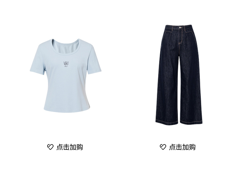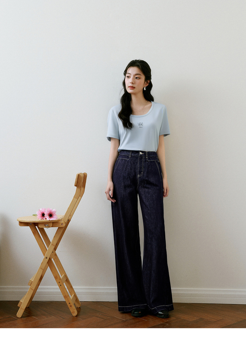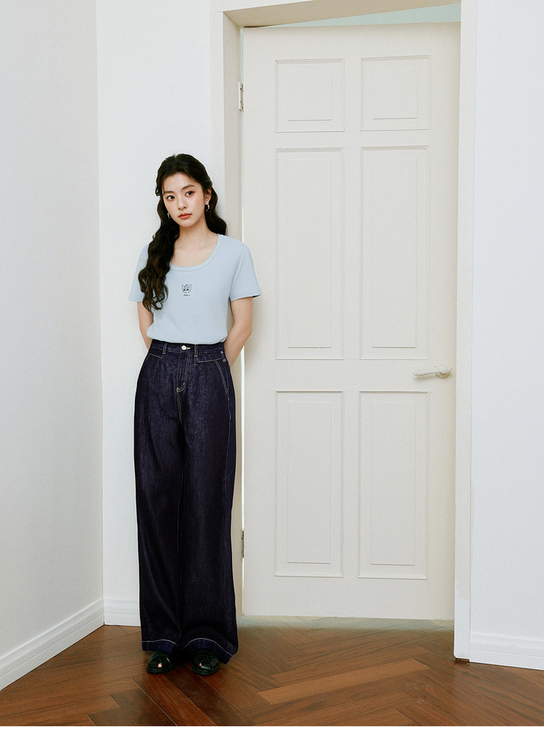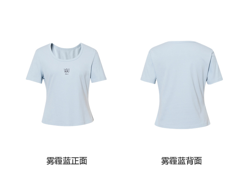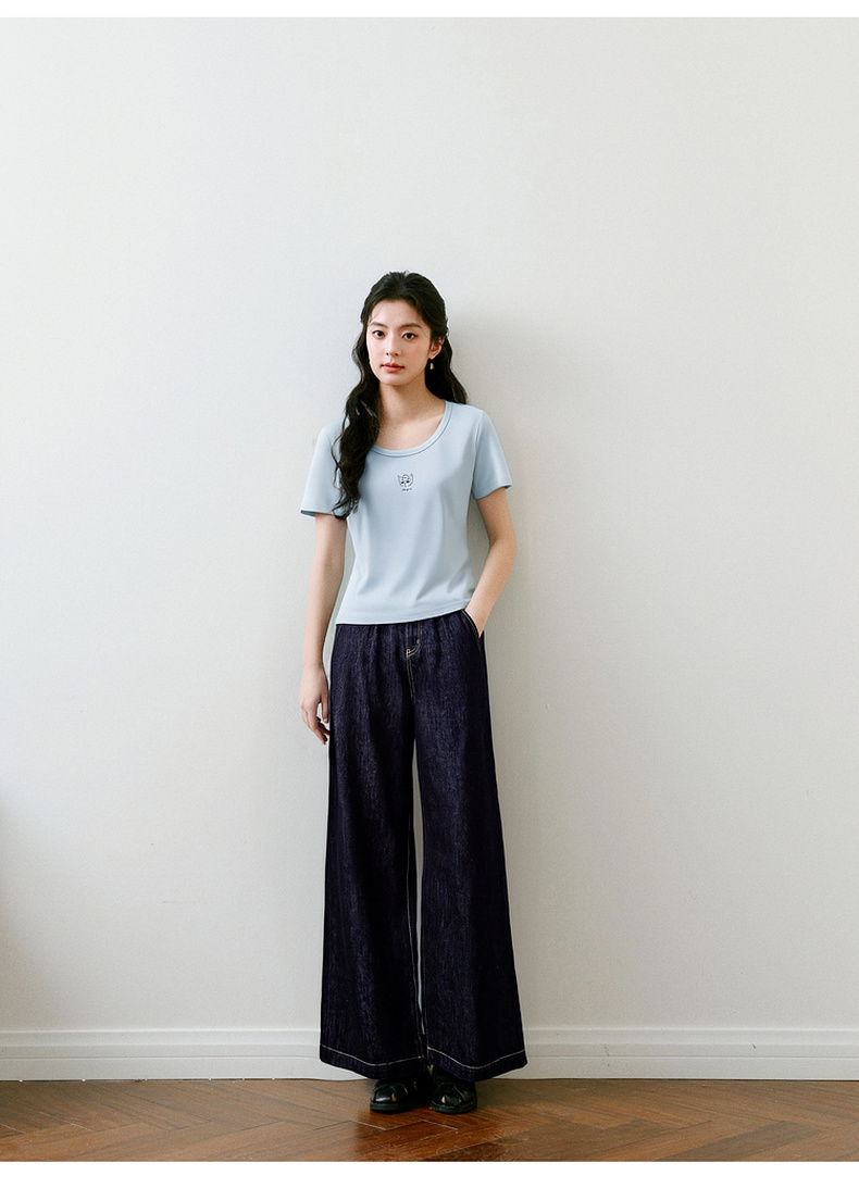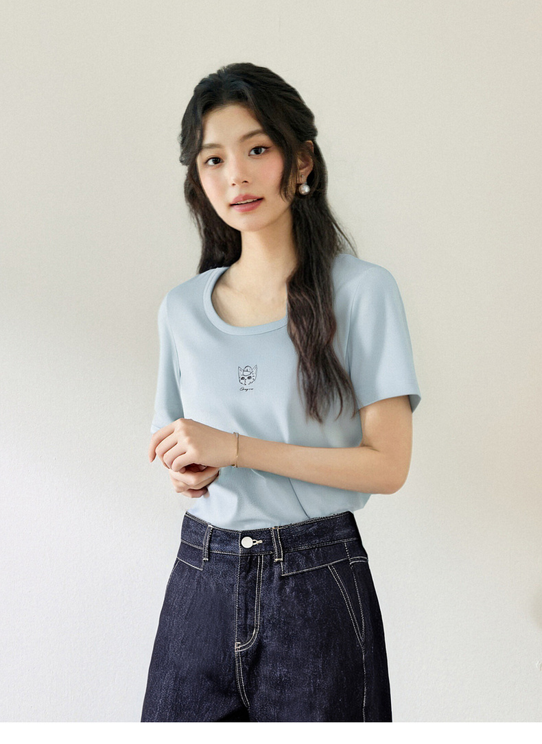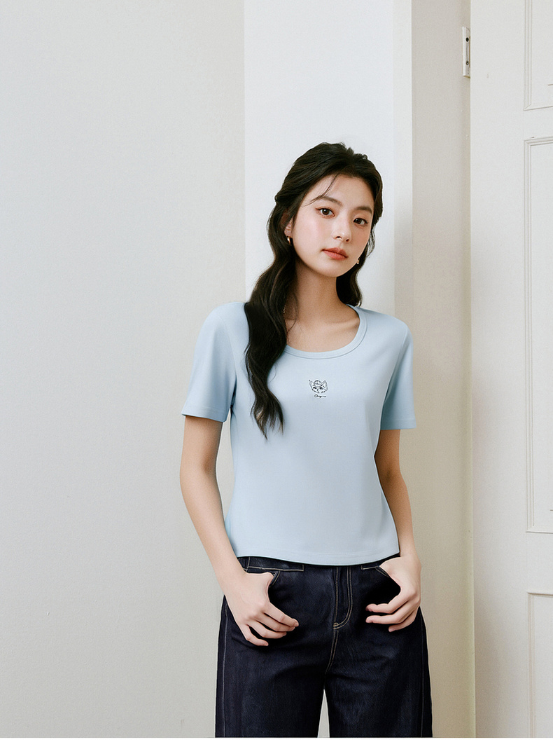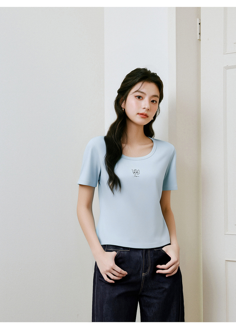 【商场同款】诗凡黎【萌宠系列】诗凡黎蓝色U领正肩T恤2025夏新款薄款上衣3G4600641