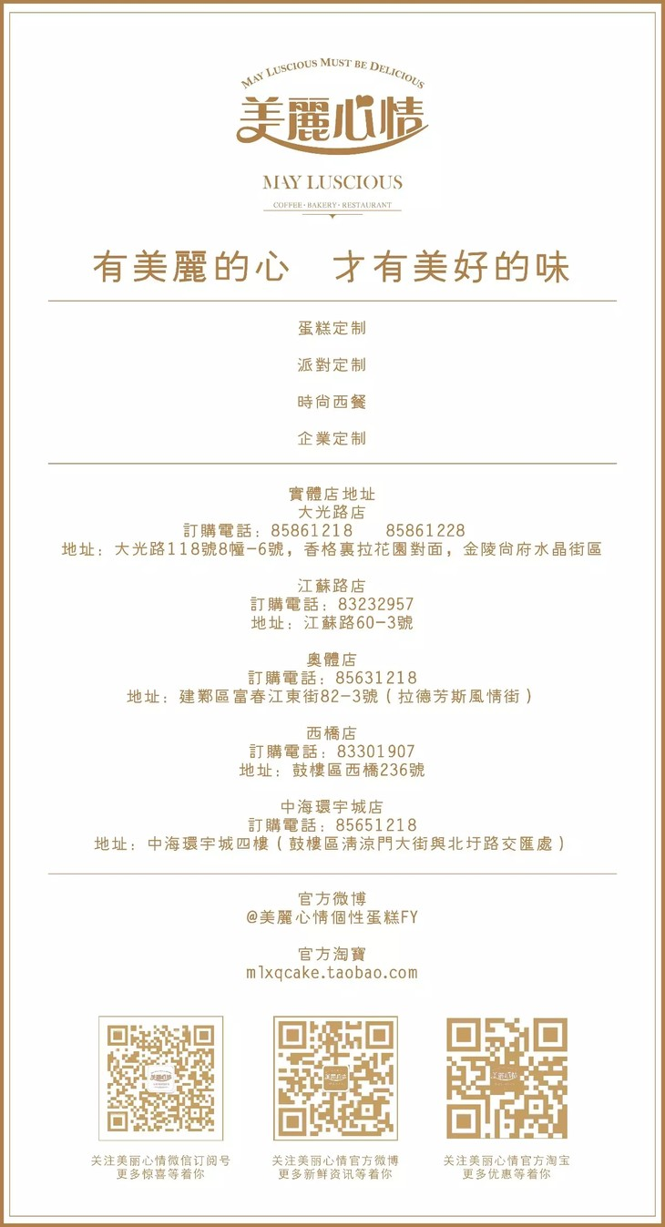 - 一家集烘焙、西餐、外烩等为一体的南京本土餐饮品牌,同时也是全国首家使用动物性奶油并主推个性定制蛋糕的综合型店铺。 自2004年成立至今,已拥有五家直营门店,每年约超过7万顾客定制美丽心情个性蛋糕。