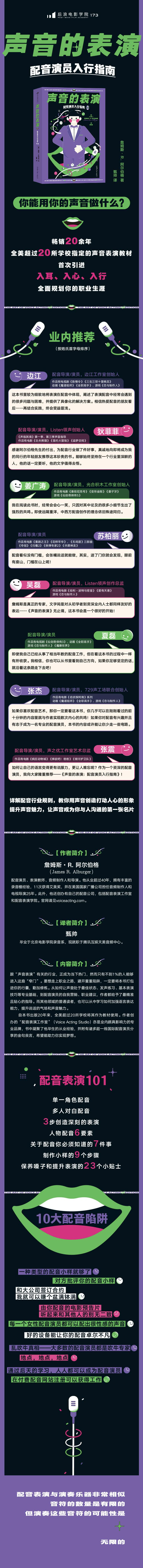 感谢阿尔伯格先生的付出,为配音行业做了件好事,真诚地向即将成为我的同行的年轻朋友推荐这本珍贵的书。能够始终坚持在一个行业里深耕的人,他的话一定要听,他的文字值得去悟。