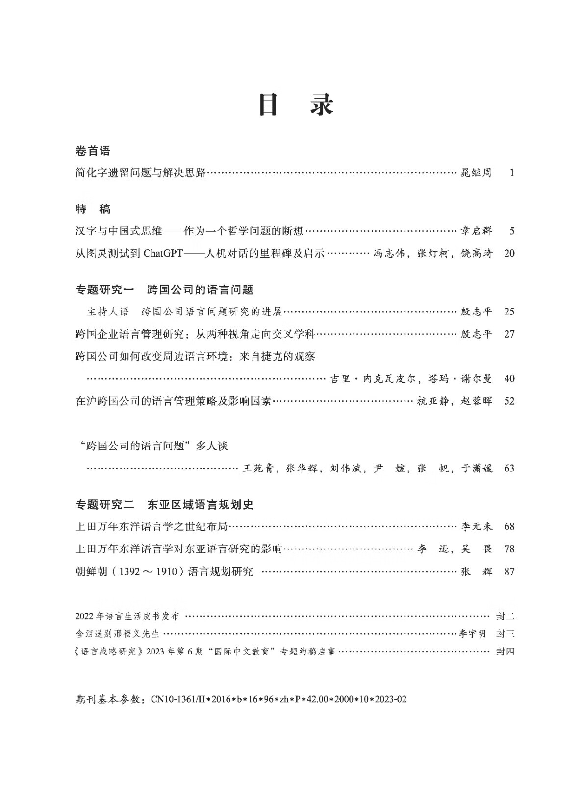 本期卷首语为晁继周力作《简化字遗留问题与解决思路》。专题研究包括两个主题:语言与跨国公司、东亚区域语言规划史。语言与跨国公司专题包括主持人语一篇、论文三篇和多人谈六篇;东亚区域语言规划史有三篇论文。除此之外,还设置了一篇特稿以及一篇学术随笔。语言与跨国公司专题论文既有理论探讨,也有实证研究,有针对国外跨国公司语言管理方法的研究,也有针对中国跨国公司语言需求的调查,显示了学者们的多方面探索。东亚区域语言规划史则对日本语言学和朝鲜朝语言学的发展及影响进行了探究。