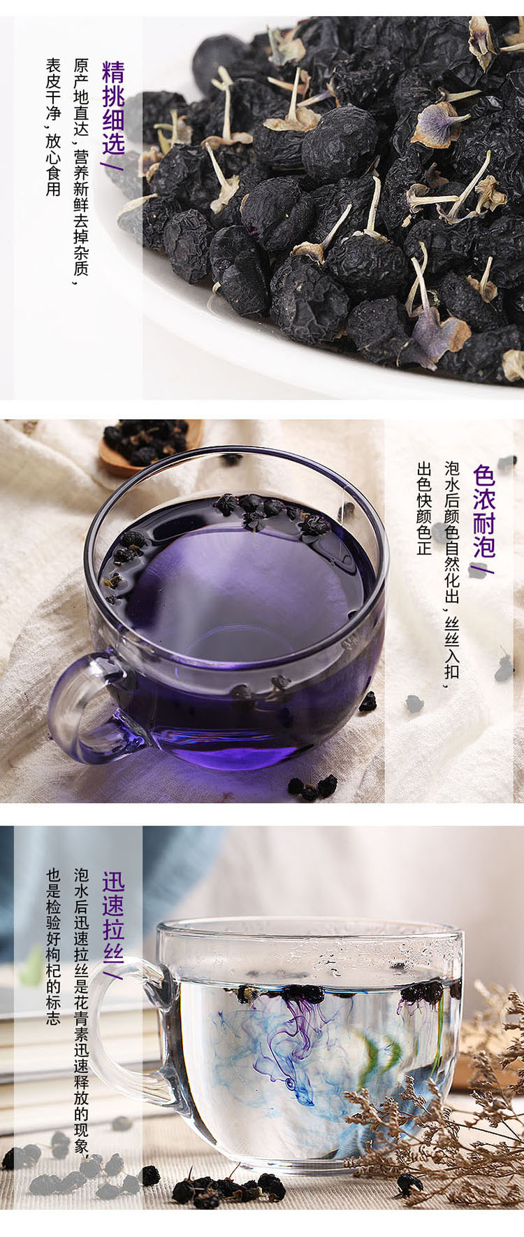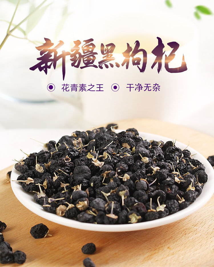 品质黑枸杞,采摘新鲜果低温制干,原生原色,自然本味,无硫熏染色,大粒乌黑油亮,内在饱满多籽,快速拉丝,味道微甜带香,色浓耐泡,一瓶即可满足全家花青素补充,是普通小果花青素含量的4倍