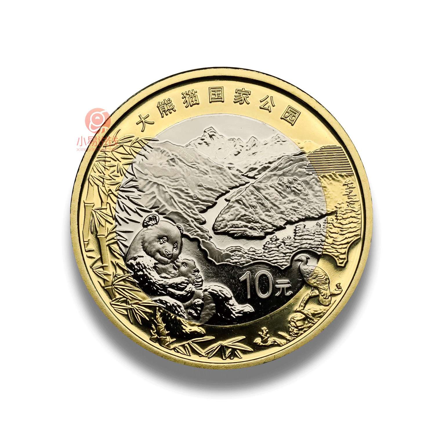该币正面图案为中华人民共和国国徽,并刊国名、年号。背面图案为大熊猫母子和四姑娘山等,辅以绿尾虹雉、竹林等,并刊“大熊猫国家公园”字样及面额。