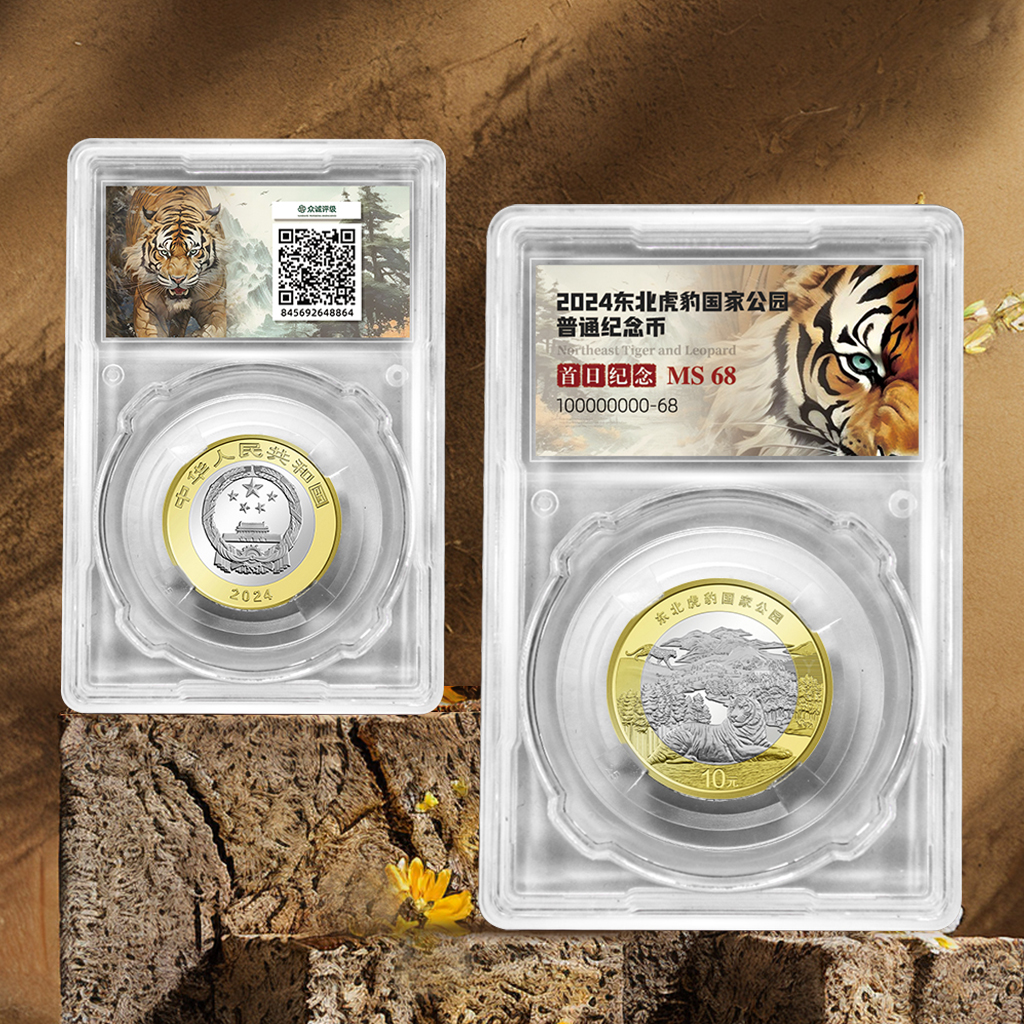 正面图案:为中华人民共和国国徽,国徽上方刊“中华人民共和国”国名,下方刊年号“2024”字样。背面主景图案:为东北虎、东北豹、红松等,辅以老爷岭、珲春河、梅花鹿等,并刊“东北虎豹国家公园”字样及面额“10元”字样。