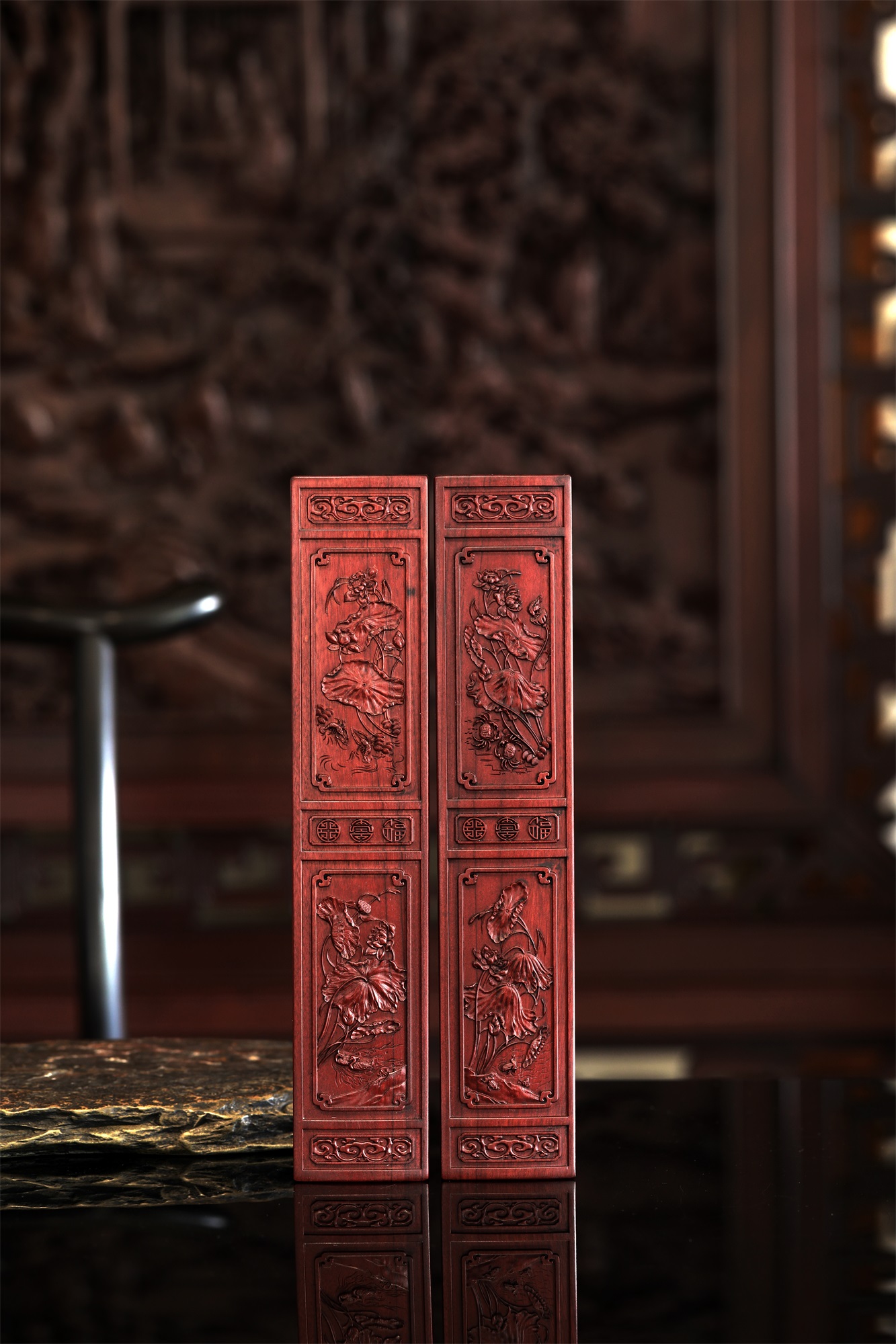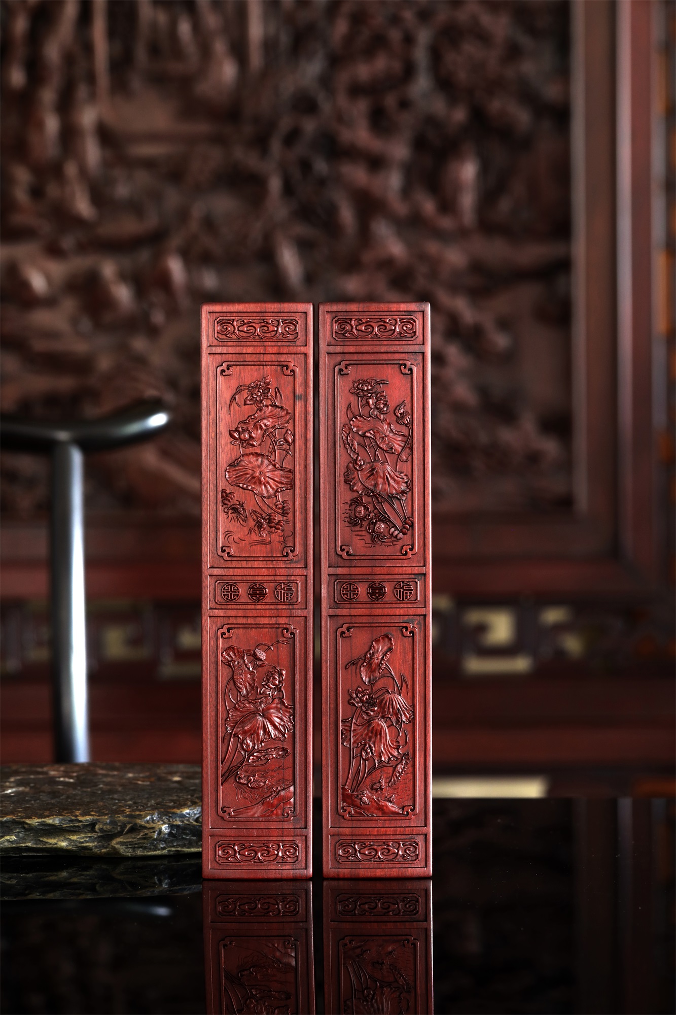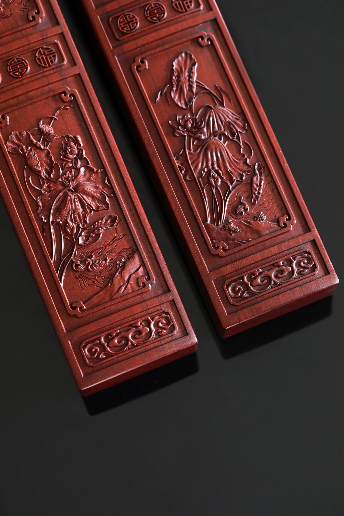 作品精选胡氏宗祠隔门精美和谐、和鸣图案组合,和顺、和美图案组合,将其微缩于非洲酸枝木材之上,使得徽州龙川木雕艺术得以走入寻常百姓之家。荷花与螃蟹,意为“和(荷)谐(蟹)”;取蛙鸣荷下,意为“和鸣”;荷花与对虾,意为“和顺”(在中国传统艺术中,由于虾通体光滑,且有弹性,故对虾纹饰有和顺之意);荷花与鸳鸯,意为“和美”(鸳鸯有和和美美之意)。社会要和谐,家庭要和美,人与人要和顺,世间万物奏出和鸣之声。