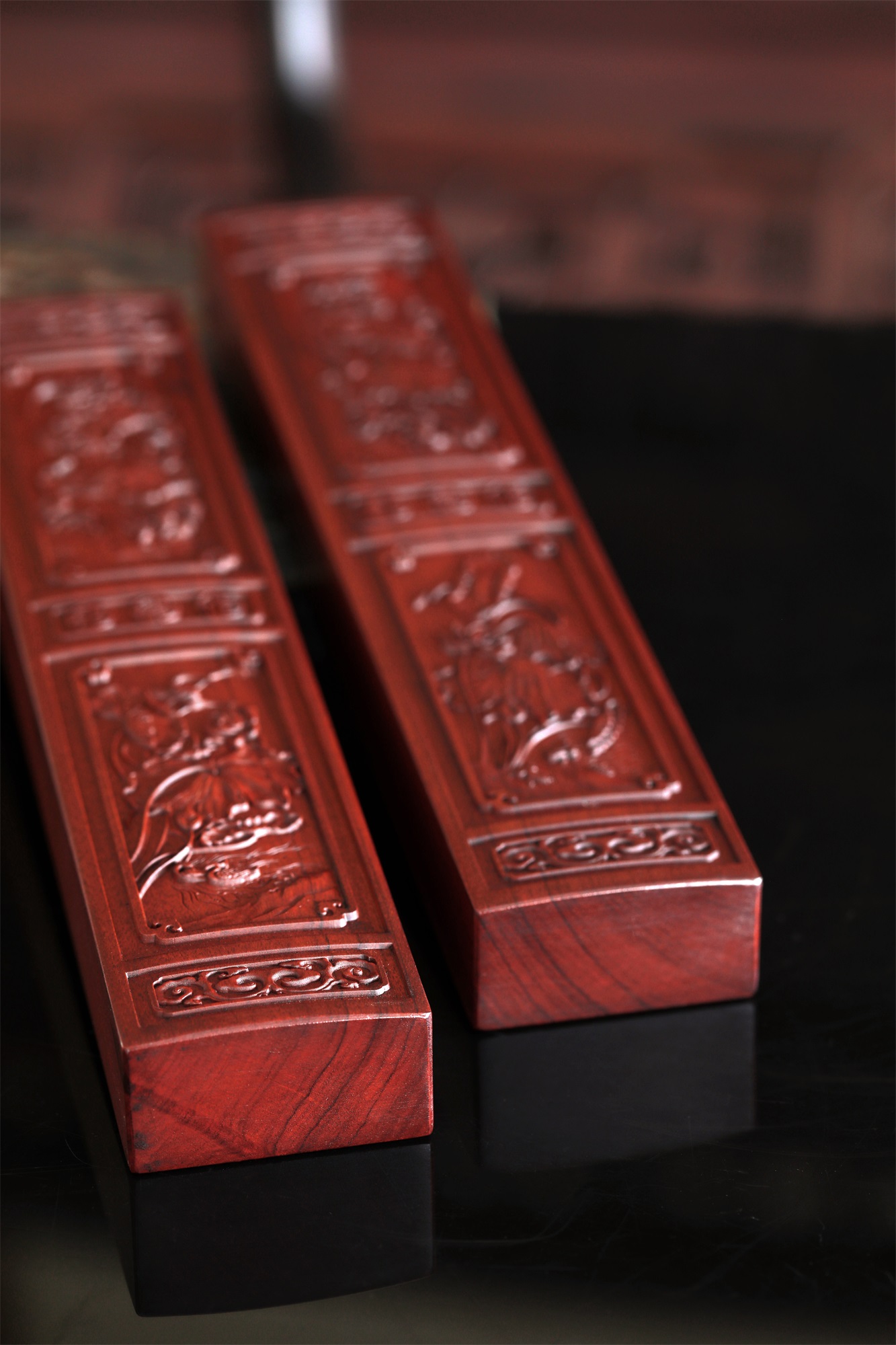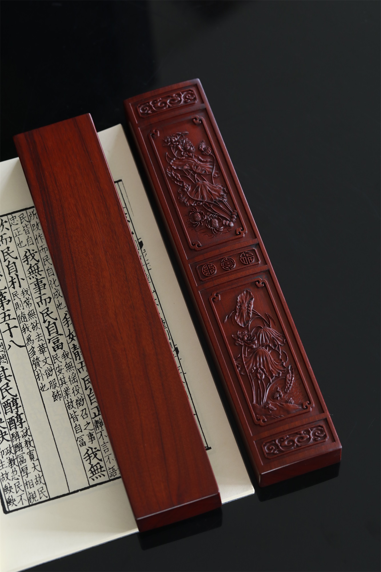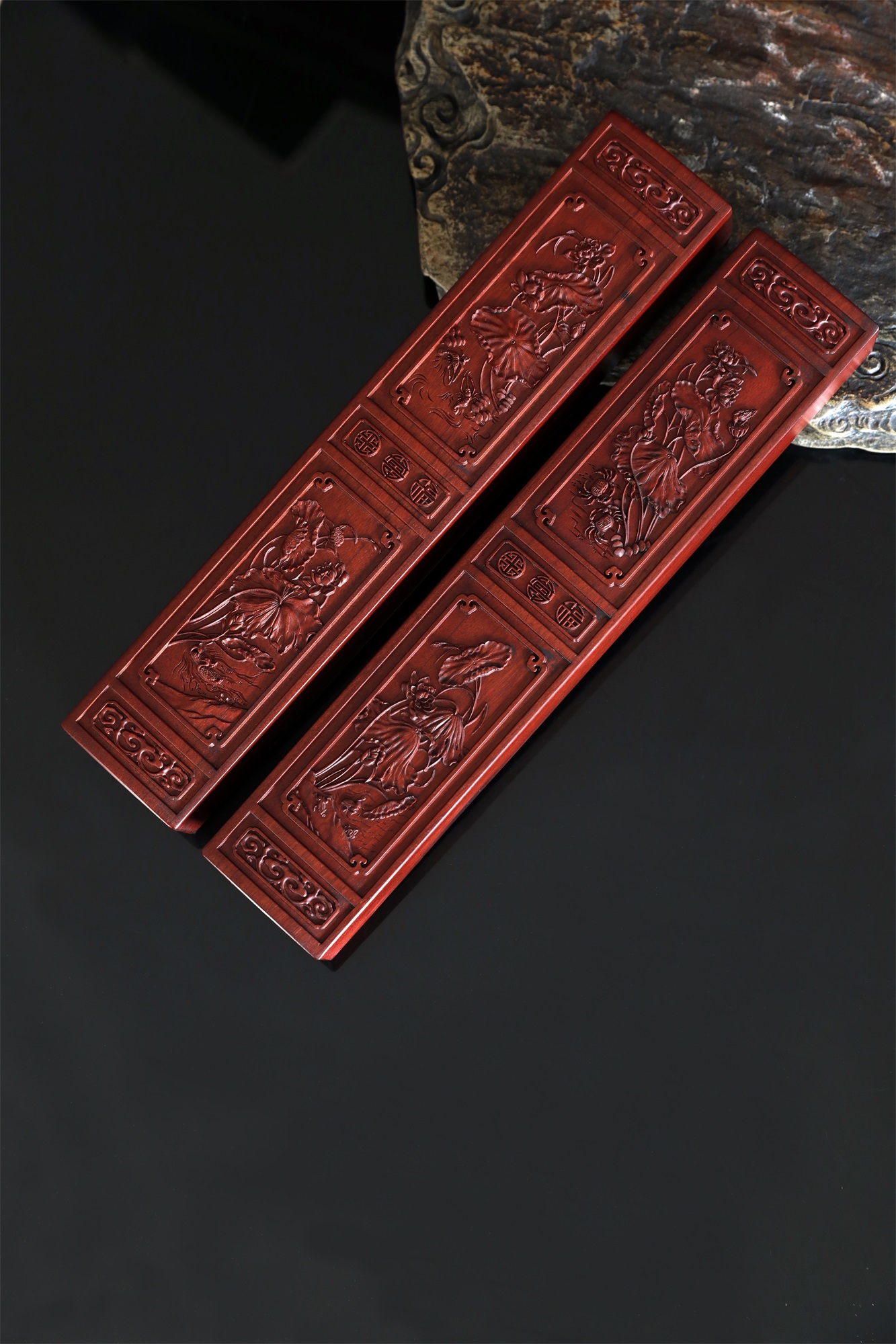 作品精选胡氏宗祠隔门精美和谐、和鸣图案组合,和顺、和美图案组合,将其微缩于非洲酸枝木材之上,使得徽州龙川木雕艺术得以走入寻常百姓之家。荷花与螃蟹,意为“和(荷)谐(蟹)”;取蛙鸣荷下,意为“和鸣”;荷花与对虾,意为“和顺”(在中国传统艺术中,由于虾通体光滑,且有弹性,故对虾纹饰有和顺之意);荷花与鸳鸯,意为“和美”(鸳鸯有和和美美之意)。社会要和谐,家庭要和美,人与人要和顺,世间万物奏出和鸣之声。