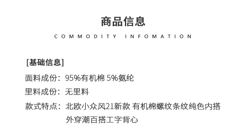 这款工字背心,版型和长度真的完美,尤其领口弧度到锁骨之下,无形拉长颈部线条,挖肩设计,上身显瘦,视觉修饰肩膀,弹力螺纹面料,修身不紧绷,面料软软糯糯。日常可以任意搭配裤装单穿,日常通勤出门度假或者运动休闲