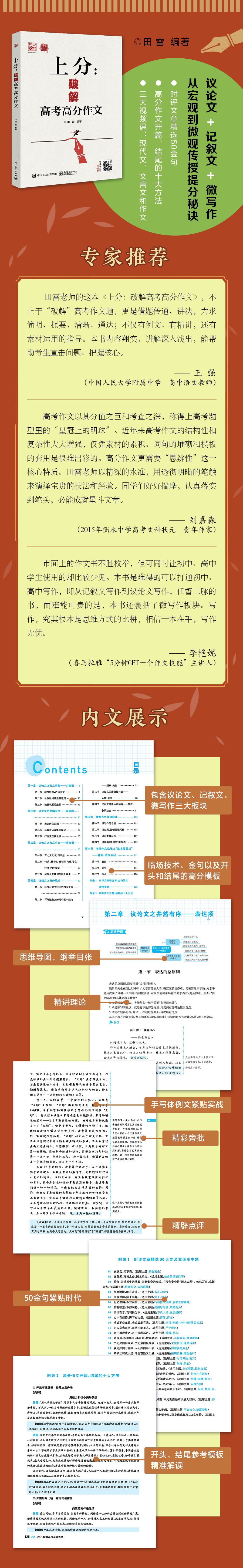该书以高考作文评分标准为依据,以近几年高考作文题为实例,结合作者多年高考一线教学经验,讲透考场议论文、近年来的高考作文在命题上更加凸显主旋律、时代性和灵活性,立足于社会热点和生活,重视考查考生的思维品质,难度较大。 高考作文失分的主要原因是言之无物、言之无序、言之无文。本书旨在帮助考生深入剖析高考作文的写作规律和本质,手把手传授精准审题、有序分析、巧妙立意、具象使用素材、熔铸词汇与句式、布局谋篇等方面的高分秘籍。本书内容全面,包含议论文、记叙文、微写作的写作技法讲析;分六章专项讲析高效写作方法,确立从宏观到微观的写作方法,传授高考作文冲刺、提分的秘诀;附录包含时评文章精选50金句及其适用主题,以及高分作文开篇、结尾的十大方法。 本书适合高中学生使用。认真领悟本书破解的高分作文之道,将有助于作文获取高分。