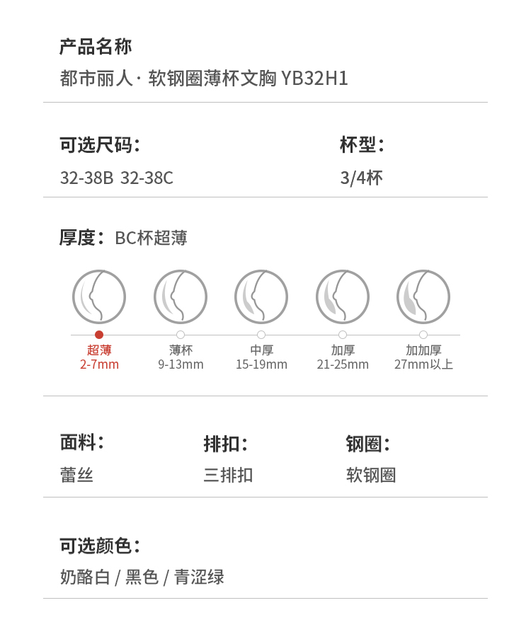 都市丽人聚拢杯内衣BC超薄3/4杯蕾丝文胸三排软钢圈YB32H1