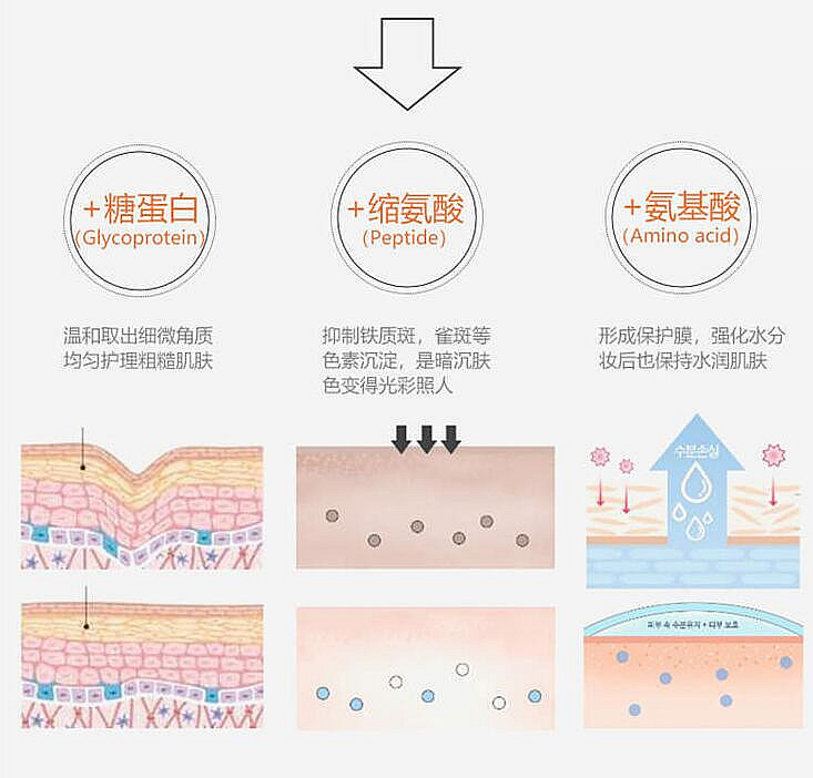 首尔大学专业皮肤化妆品学会认为,蛋白质是维持皮肤组织和抗氧化的核心成分。随着人体老化,身体中的蛋白结构产生变化,由于面部皮肤蛋白质不足导致保湿力下降,弹力减少。