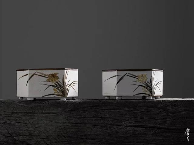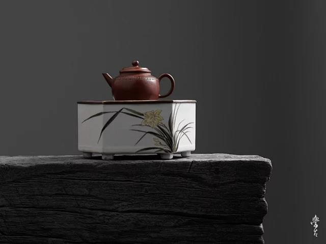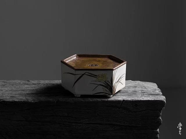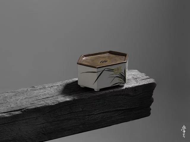 器型来源:民国六方形粉彩兰花壶承。民国瓷绘艺术整体百花齐放。开始介入文人画因素,表达瓷画的意趣。壶承胎体精致小巧,顶手工铜盖,双铜钱纹下水孔,有招财进宝寓意。绘制兰花气韵生动,幽香清逸。
