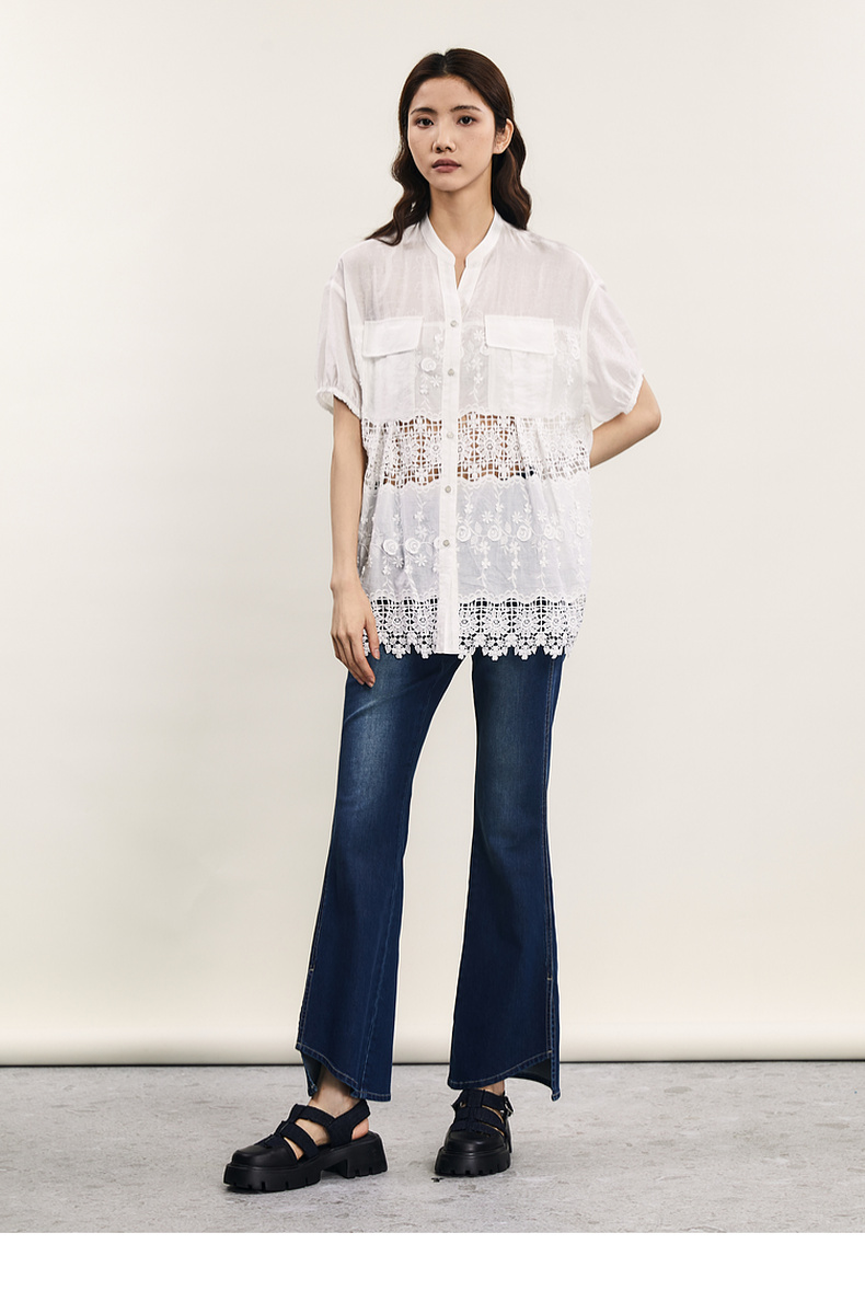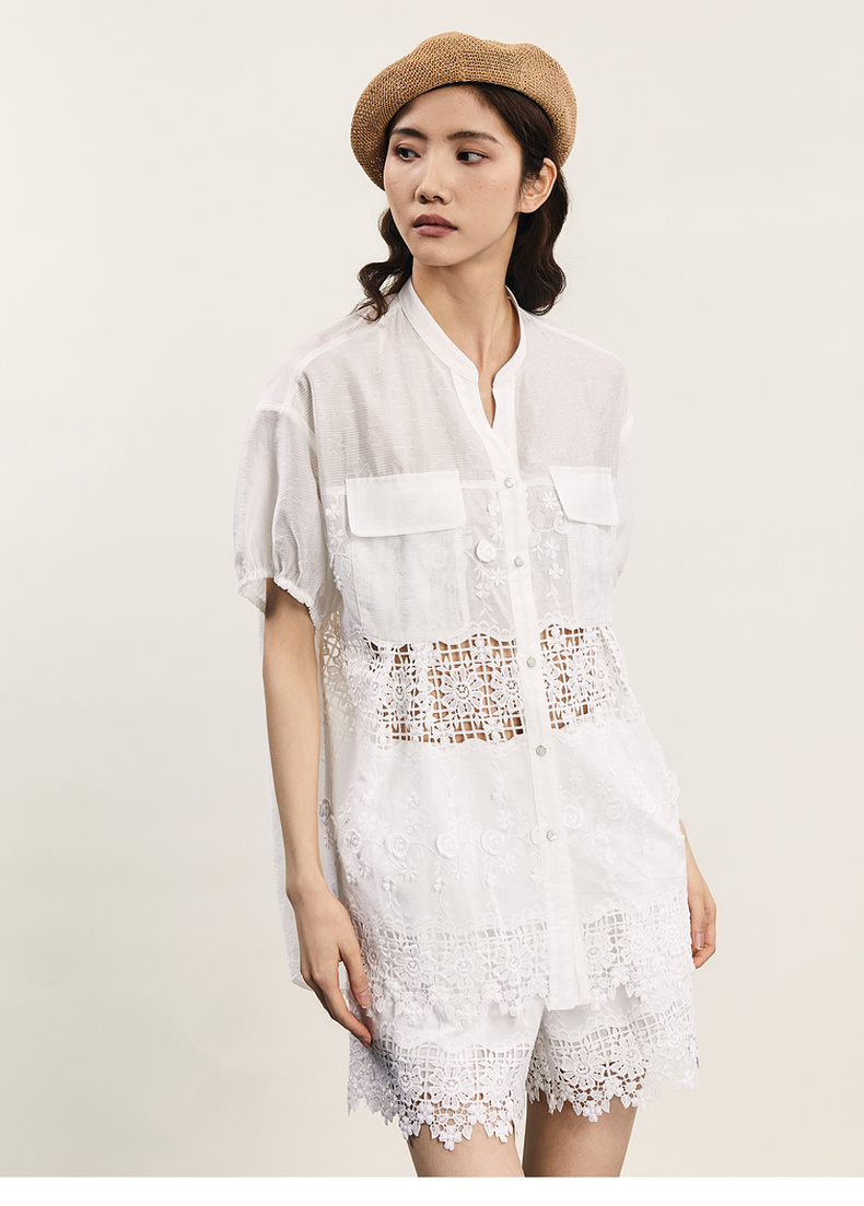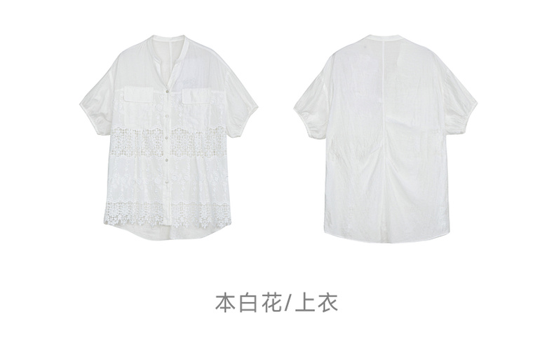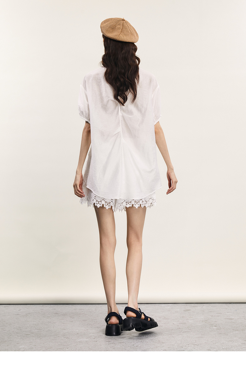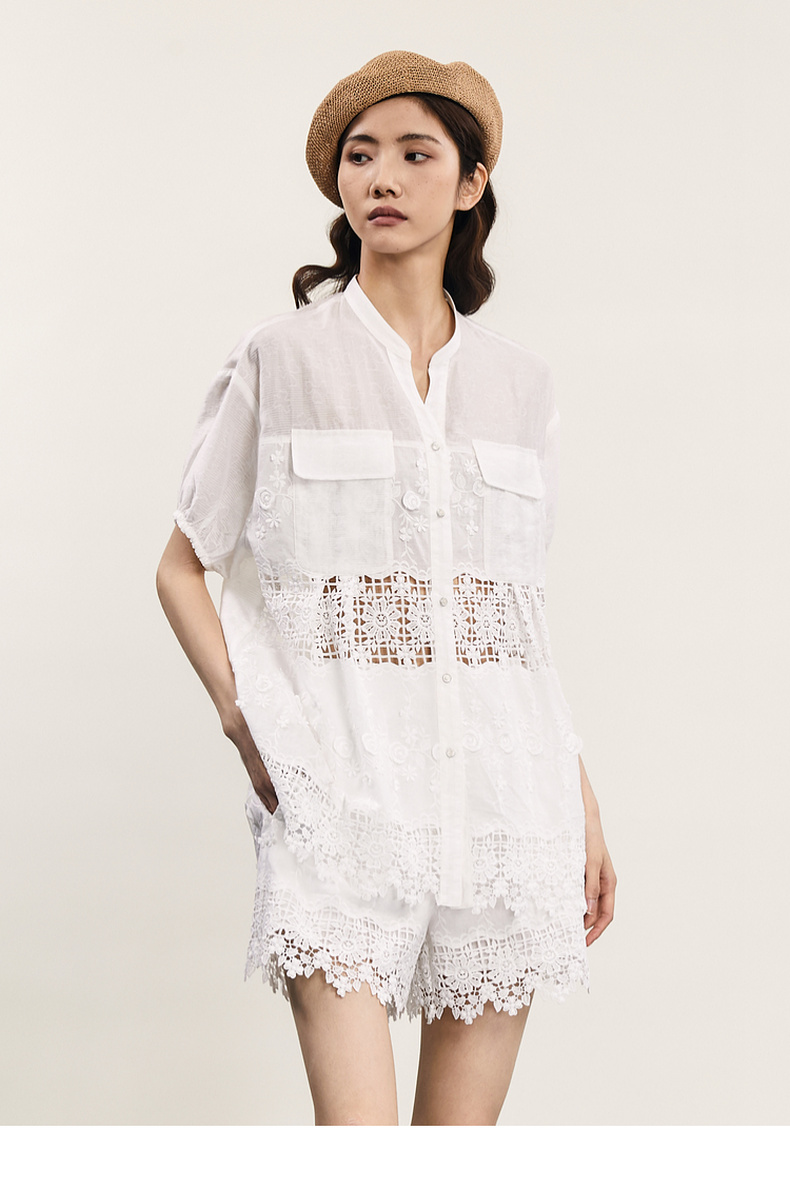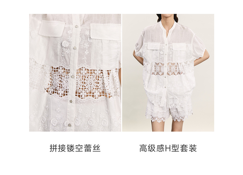 谜底套装女士2024年夏季新品通勤风蕾丝拼接衬衫+短裤242MTZ0553