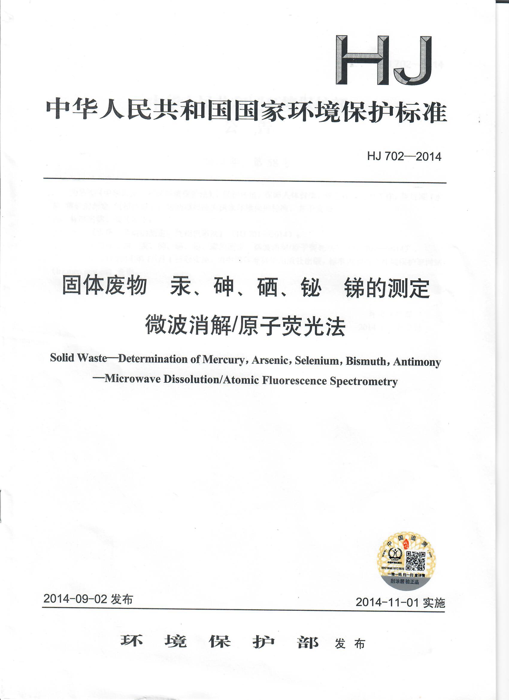 HJ 702—2014 固体废物 汞、砷、硒、铋、锑的测定 微波消解/原子荧光法