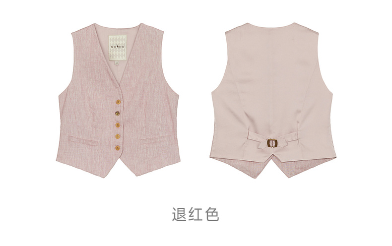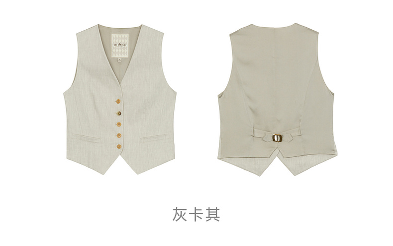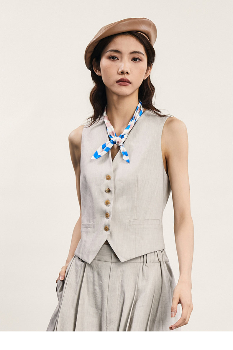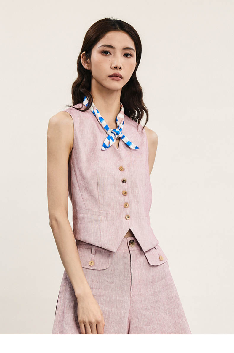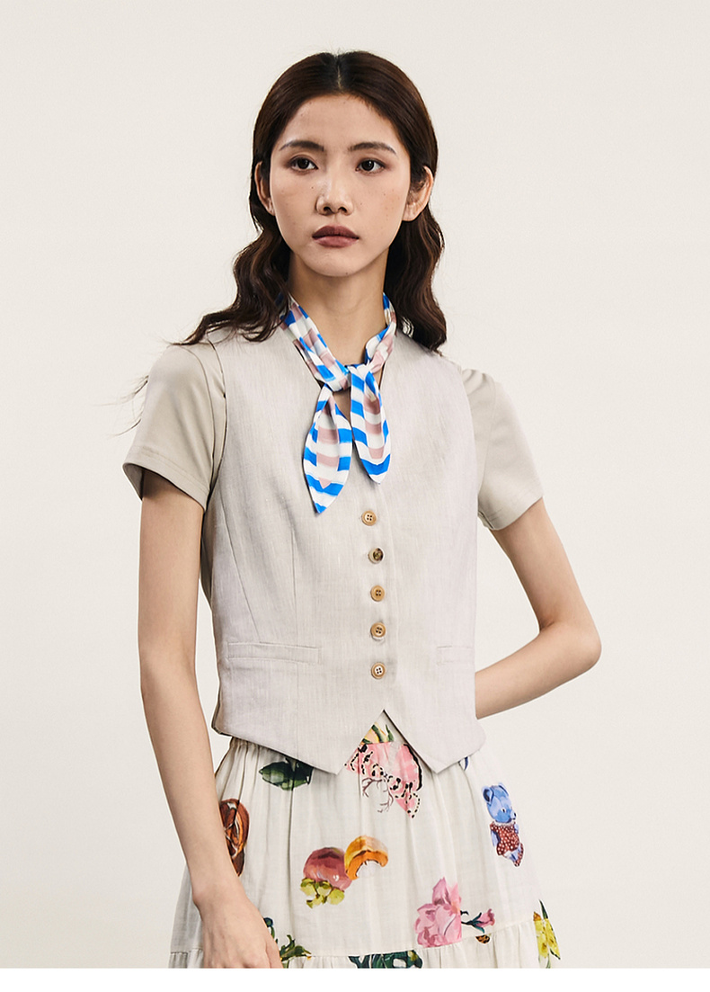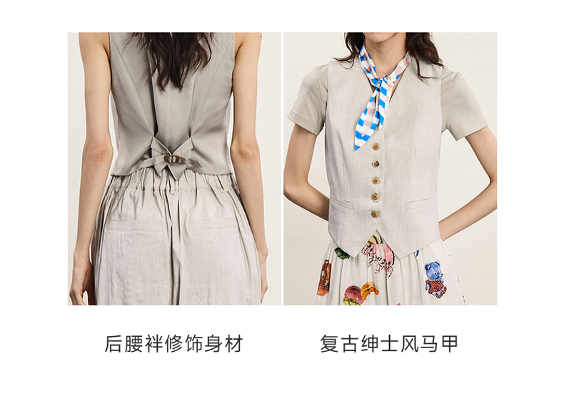 谜底短款马甲女士2024年夏新品复古风V领无袖上衣配丝巾242MM0552