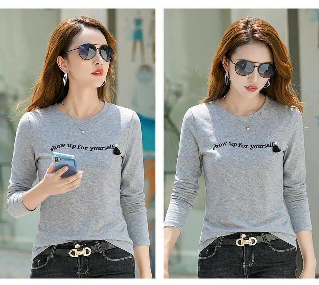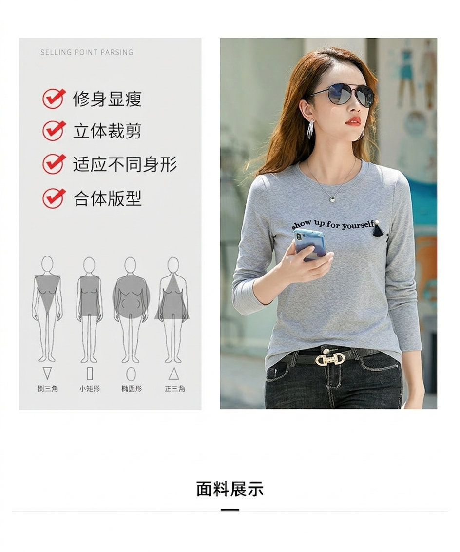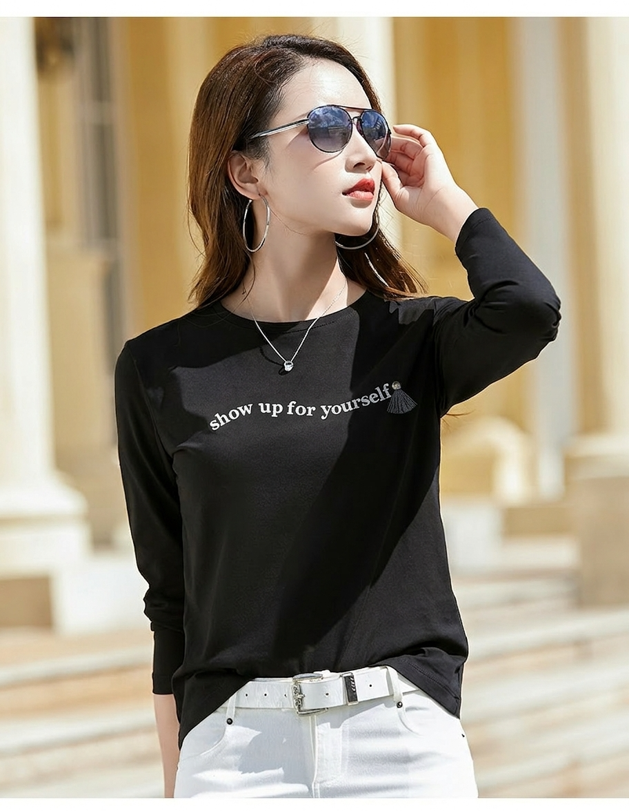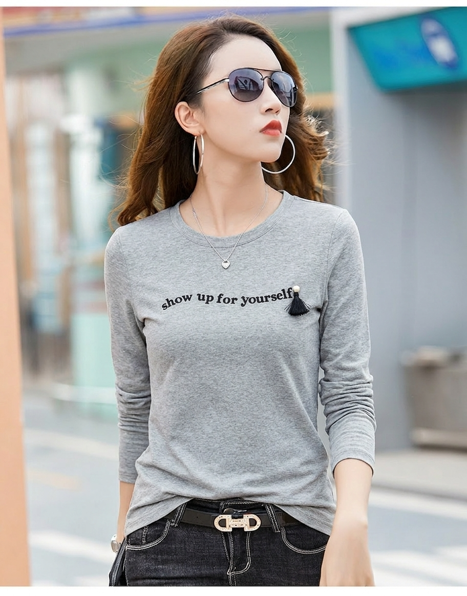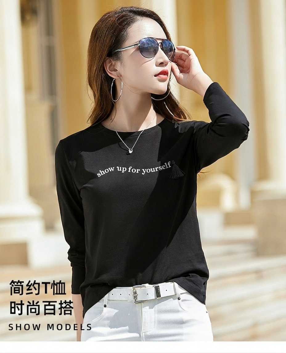 半身缘女装 春季流苏吊坠波浪型植绒字母日常打底衫T恤261213U01140269